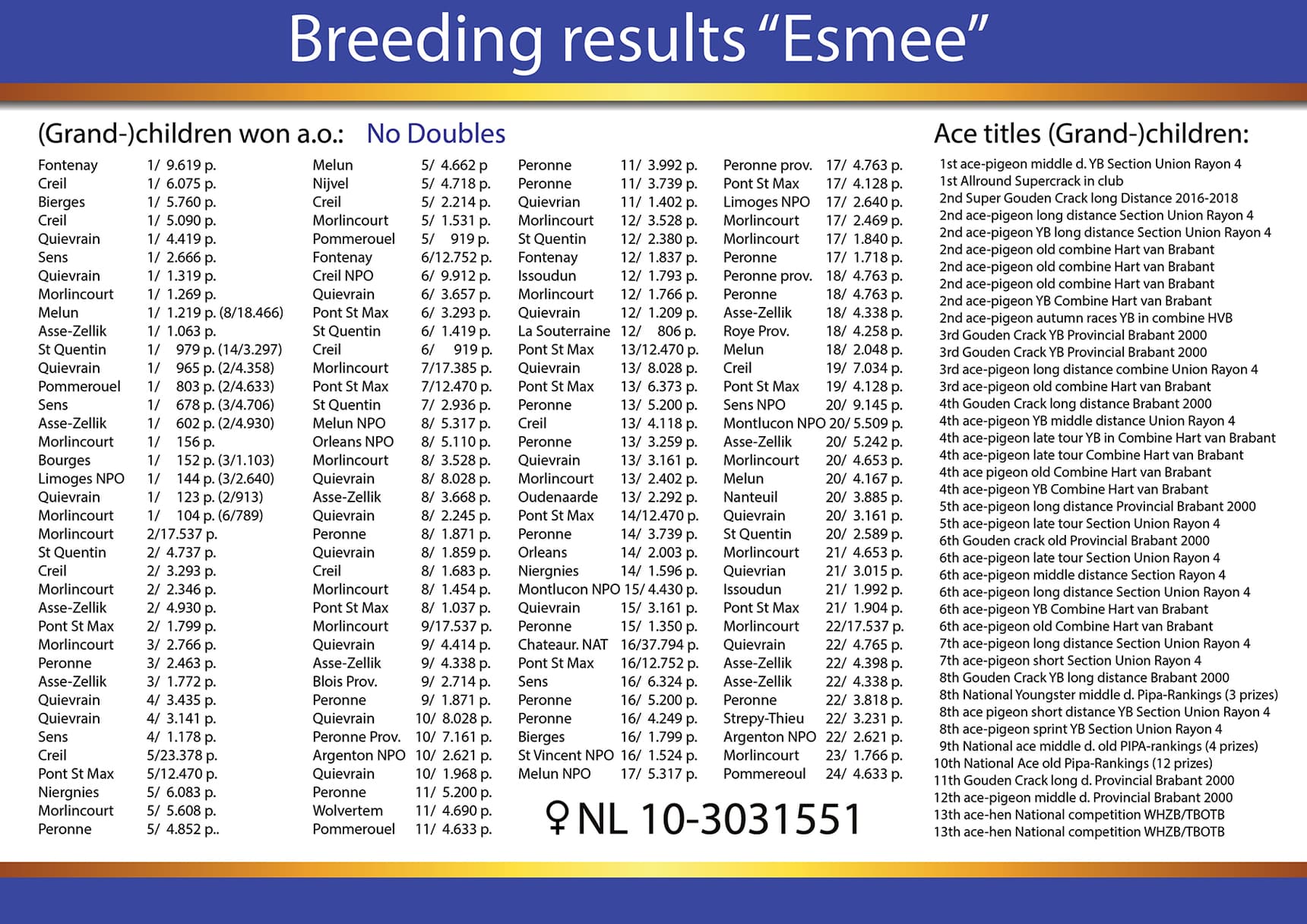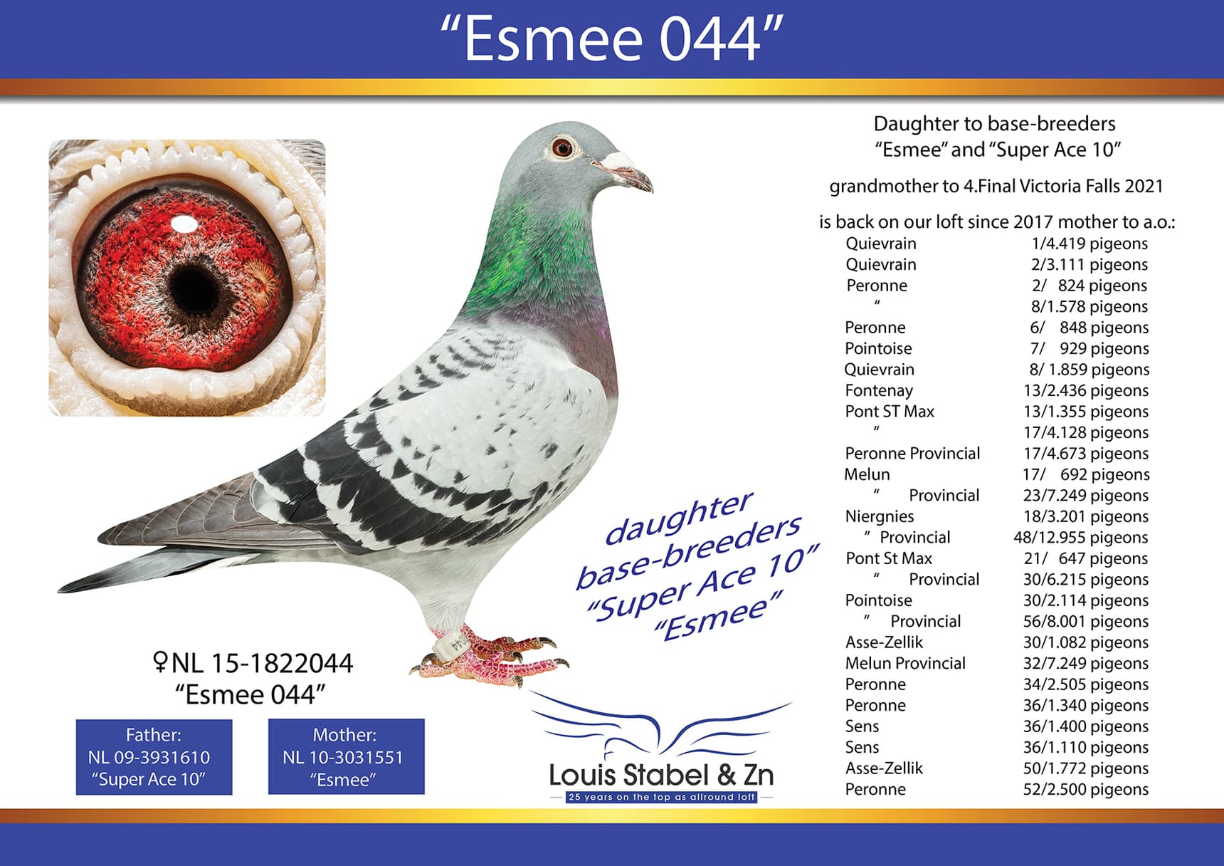 Daughter out “Super Ace 10”(3rd Prov. Ace speed) x “Esmee” (1st NPO Sezanne 14,232b. – 3rd NPO Orleans 13,137b. - 11th Creil 8,050b.)