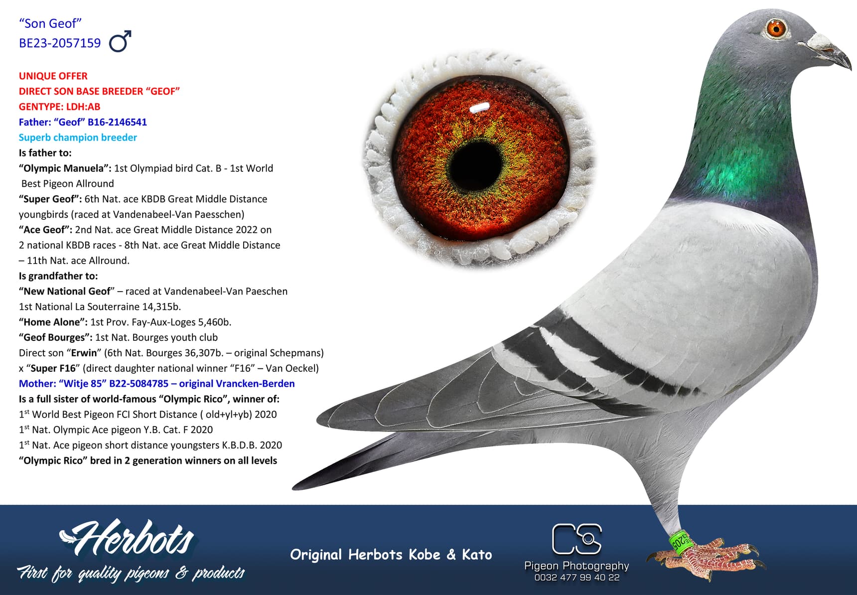 Direct son “Erwin” (6th Nat. Bourges 36,307b. – original Schepmans) x “Super F16” (direct daughter national winner “F16” – Van Oeckel)