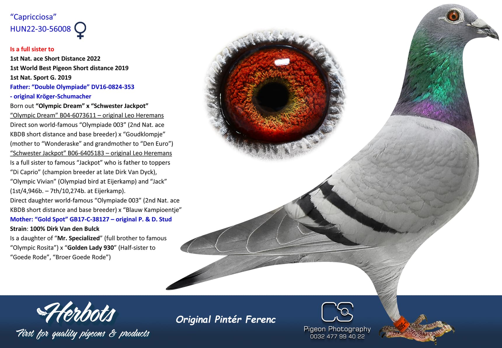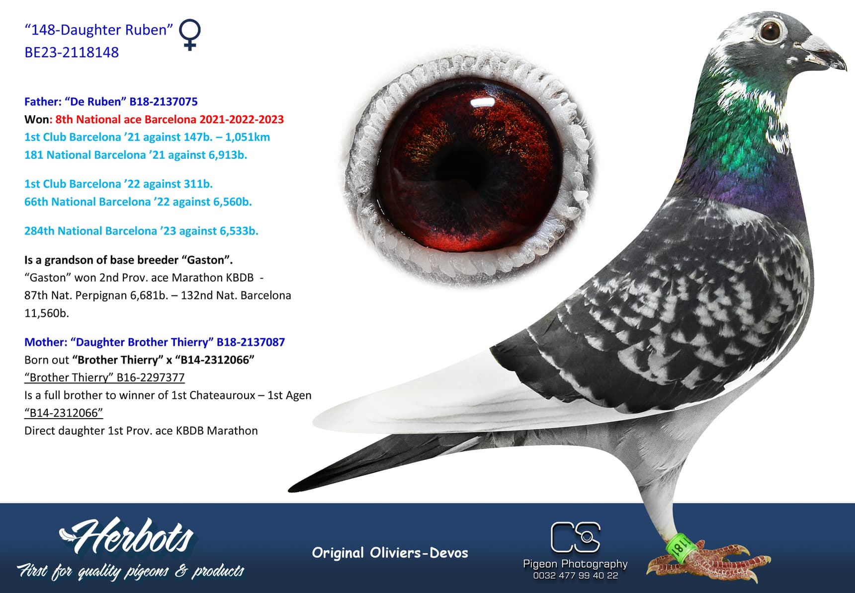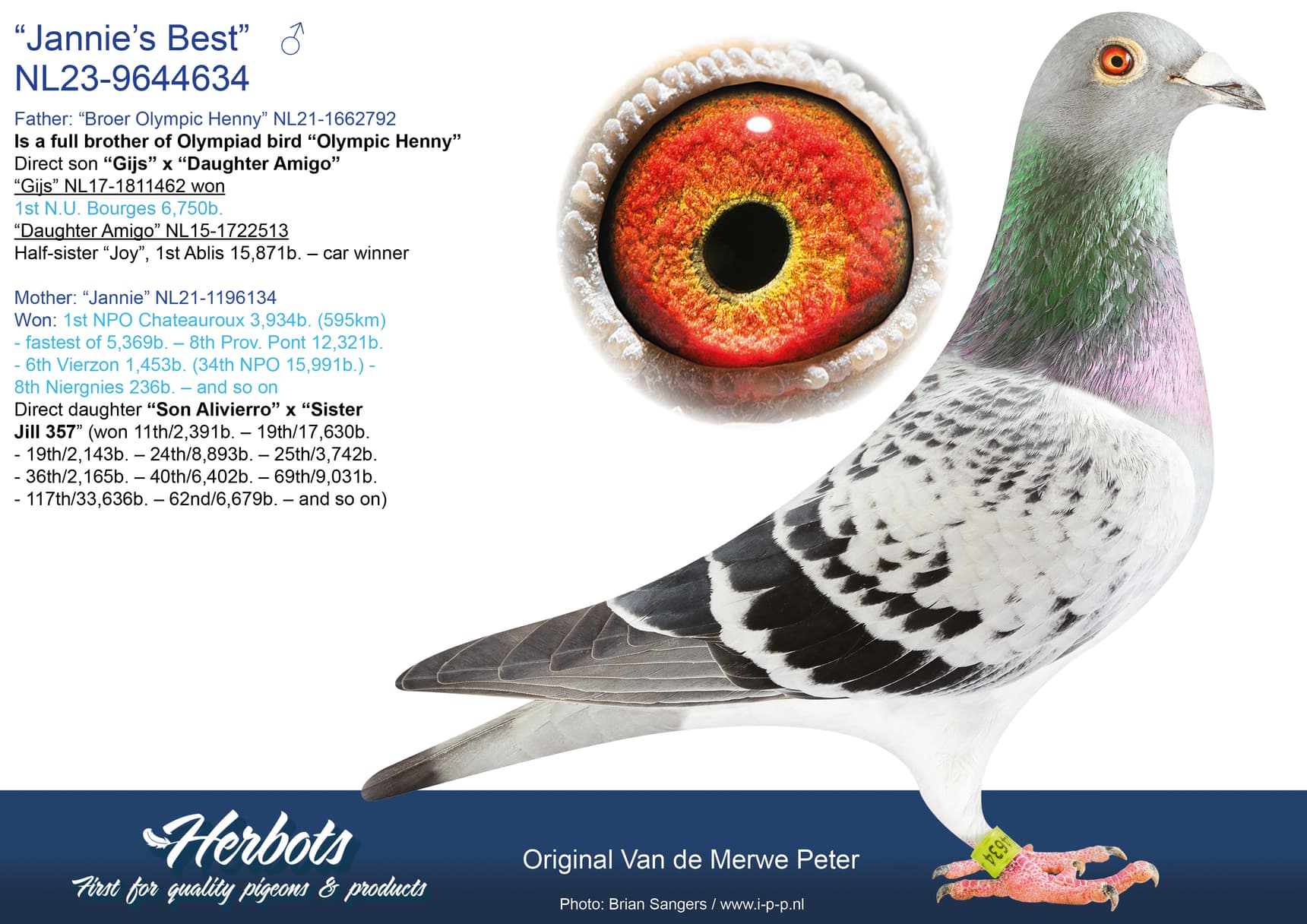 Direct daughter “Murphy’s Law” x Tooske” (2nd Ace one-day-fond Afdeling 5 – 4th Olympiad bird)