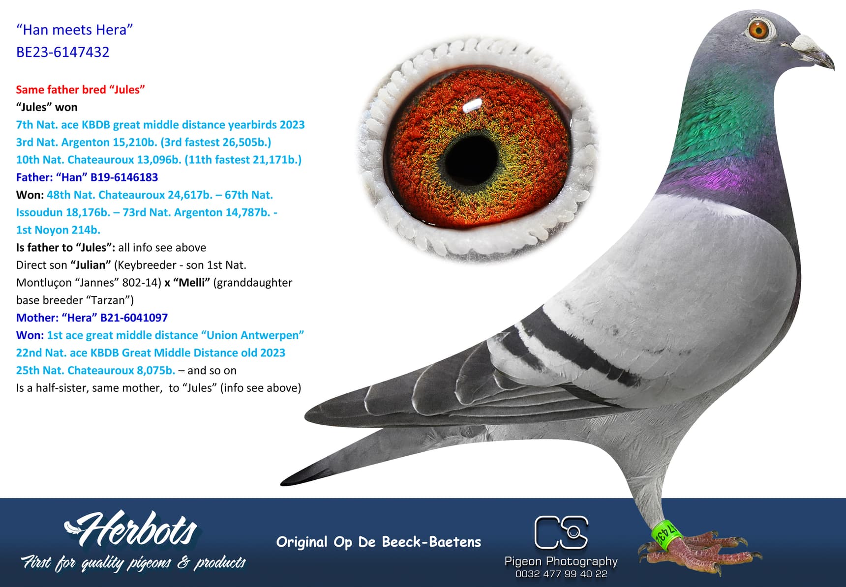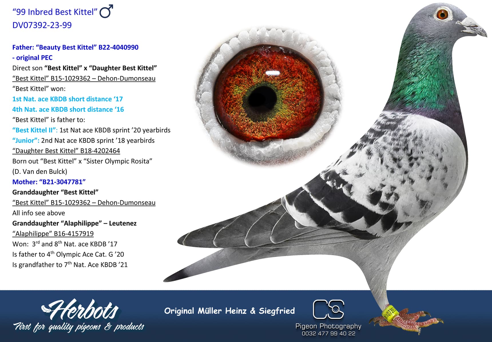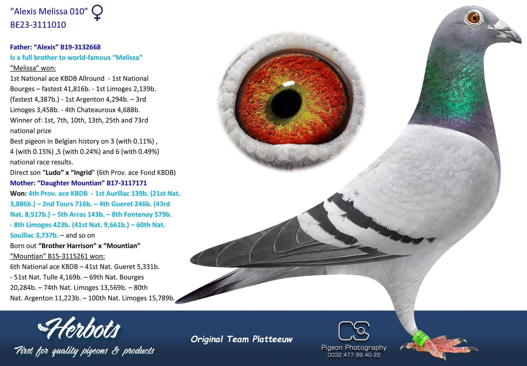 Direct daughter “Murphy’s Law” x Tooske” (2nd Ace one-day-fond Afdeling 5 – 4th Olympiad bird)