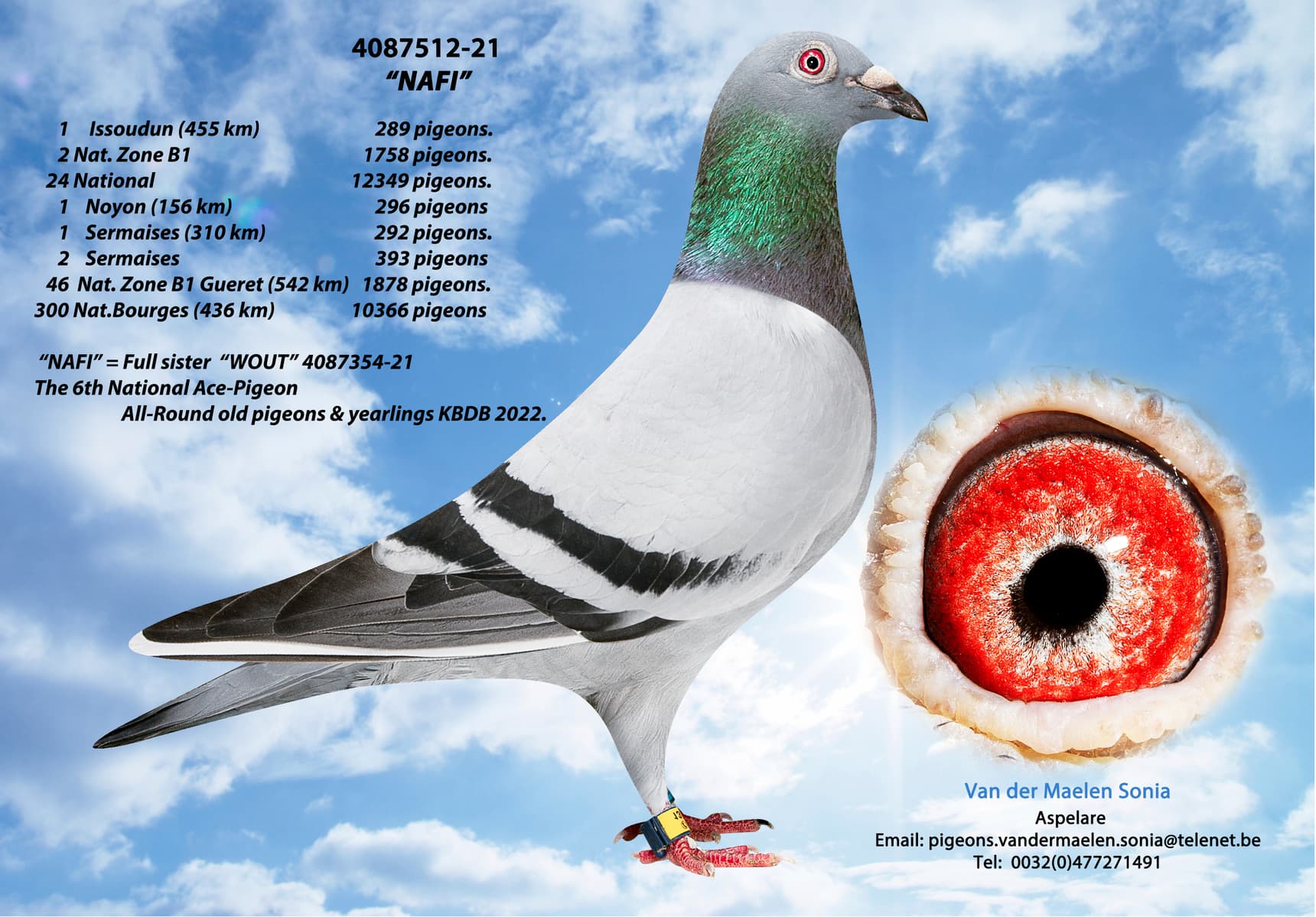 Direct daughter “Witpen Noah” (full brother to 1st Prov. and 2nd Nat. ace ½ Fond youngbirds KBDB ’14 - original Leus Dany) x “Witje Jasmin”(daughter tophen “Grijze Jasmin”)