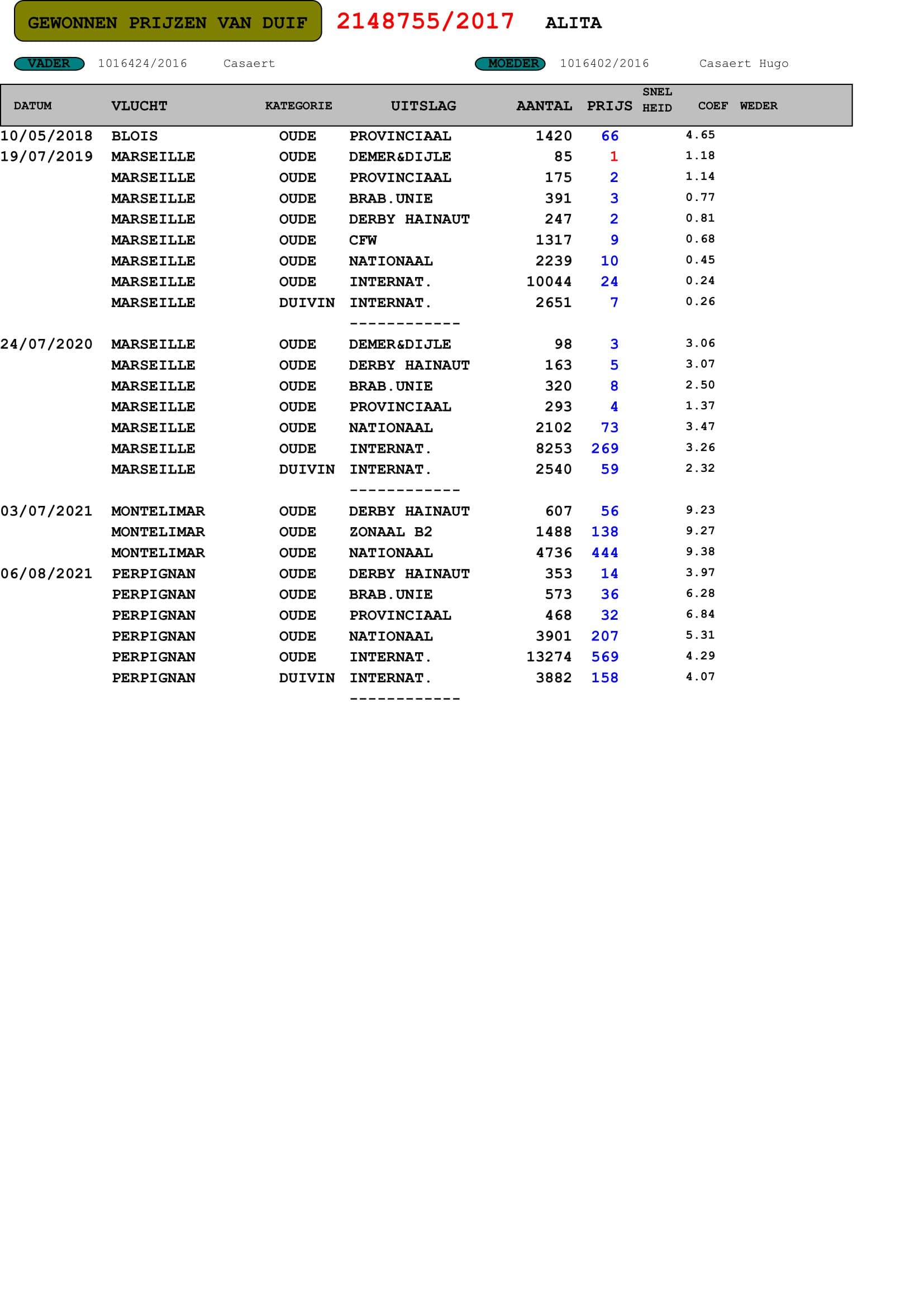Direct daughter “Zevlakov” (all info see above) x “Alita”(received as egg of Casaert Hugo. Won: 10th Nat. and 24th Internat. Marseille 10,044b. – 73rd Nat. Marseille 2,102b.. Is a granddaughter of “Invictus”(best European marathon bird 2015 at Dubois Michel.))