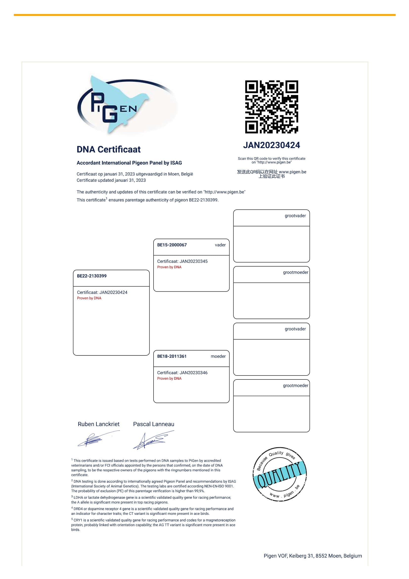 Direct son “Uran” (won 49th Tulle 6,972b. – 12th Prov. Limoges 1,182b. – 1st club and 41st Interprov. Tulle 1,635b. – and so on) x “Tulip” (top breeding hen in several generations – sister to 78th Soustons 11,030b.)