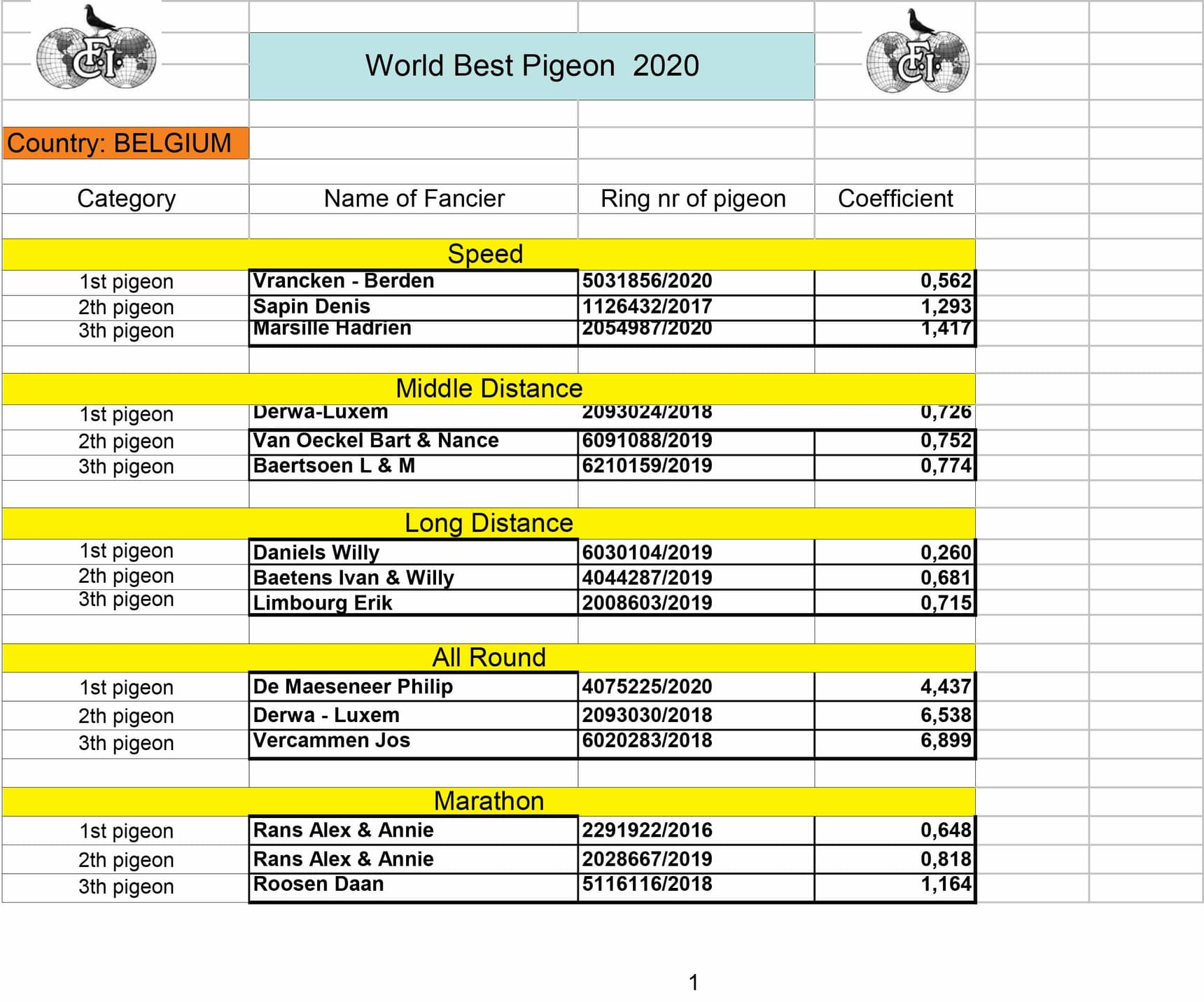 1st World Best Belgian Pigeon Marathon ’20