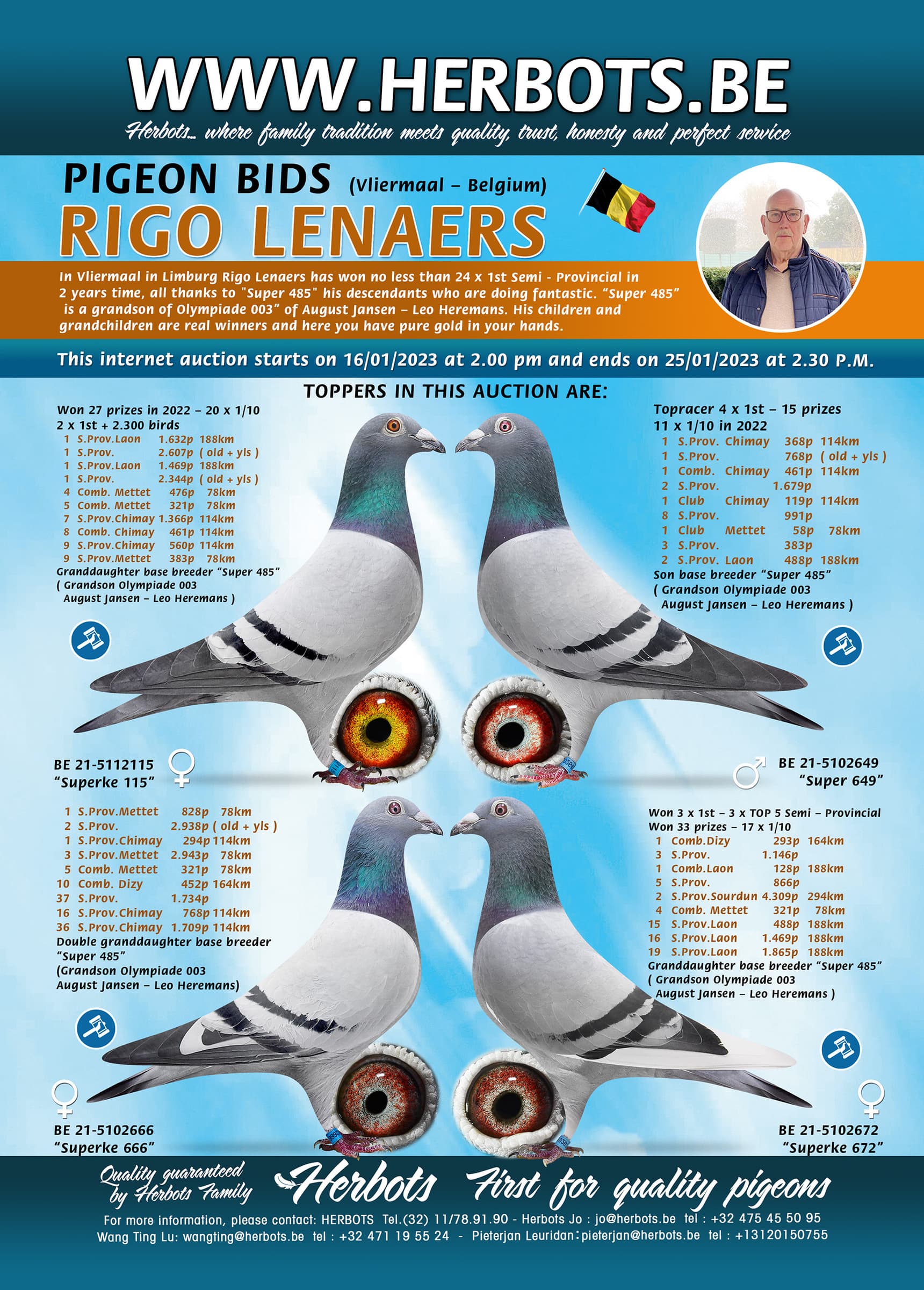 In Vliermaal in Limburg Rigo Lenaers has won no less than 24 x 1st Semi - Provincial in 2 years time, all thanks to "Super 485" his descendants who are doing fantastic. “Super 485” is a grandson of Olympiade 003” of August Jansen – Leo Heremans. His children and grandchildren are real winners and here you have pure gold in your hands.