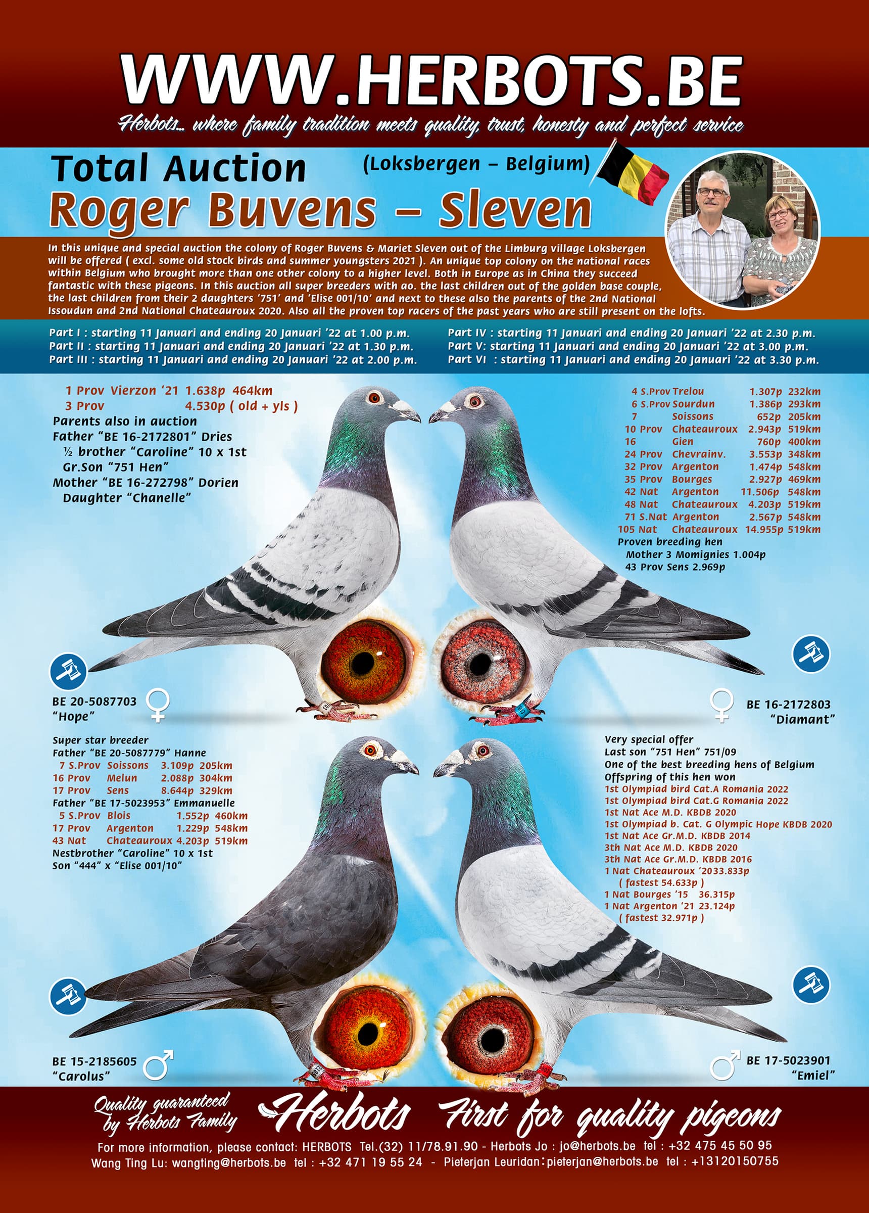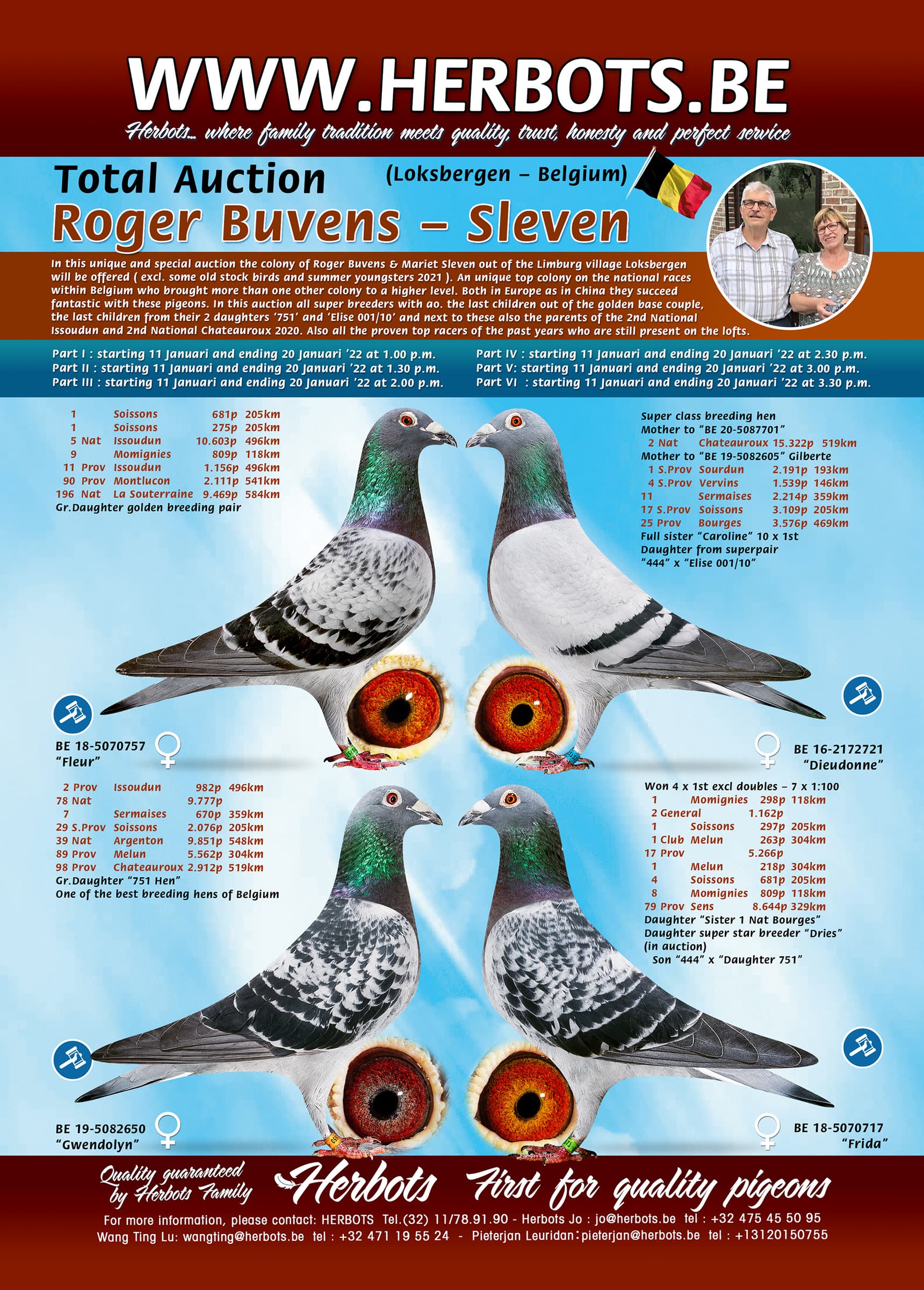 In this unique and special auction the colony of Roger Buvens & Mariet Sleven out of the Limburg village Loksbergen will be offered ( excl. some old stock birds and summer youngsters 2021 ). An unique top colony on the national races within Belgium who brought more than one other colony to a higher level. Both in Europe as in China they succeed fantastic with these pigeons. In this auction all super breeders with ao. the last children out of the golden base couple, the last children from their 2 daughters ‘751’ and ‘Elise 001/10’ and next to these also the parents of the 2nd National Issoudun and 2nd National Chateauroux 2020. Also all the proven top racers of the past years who are still present on the lofts.
