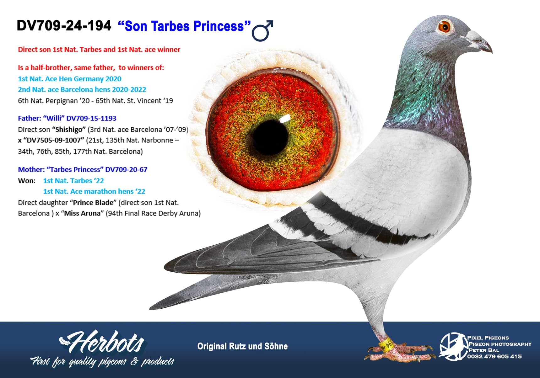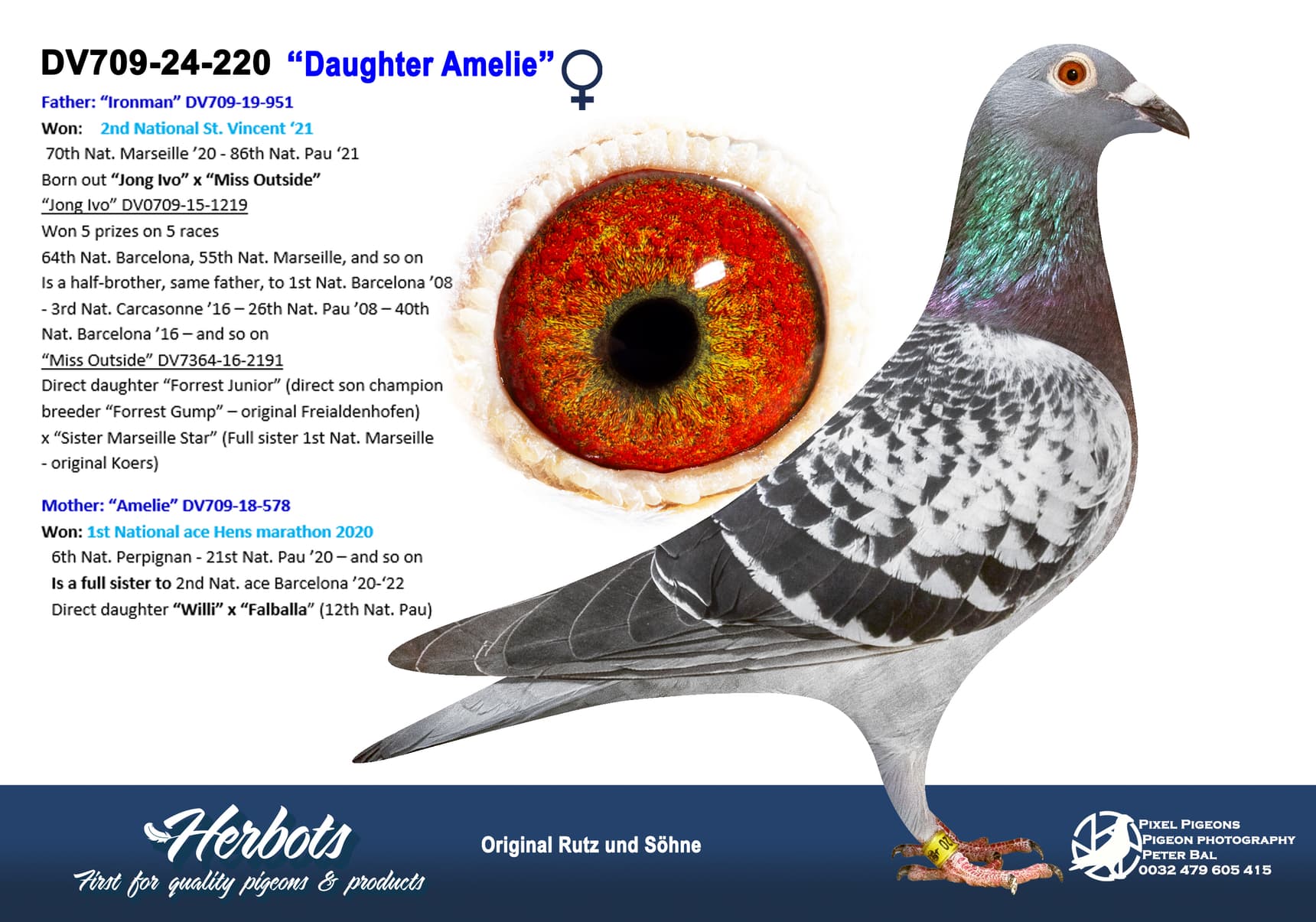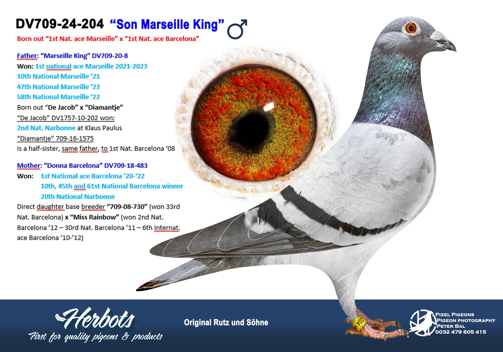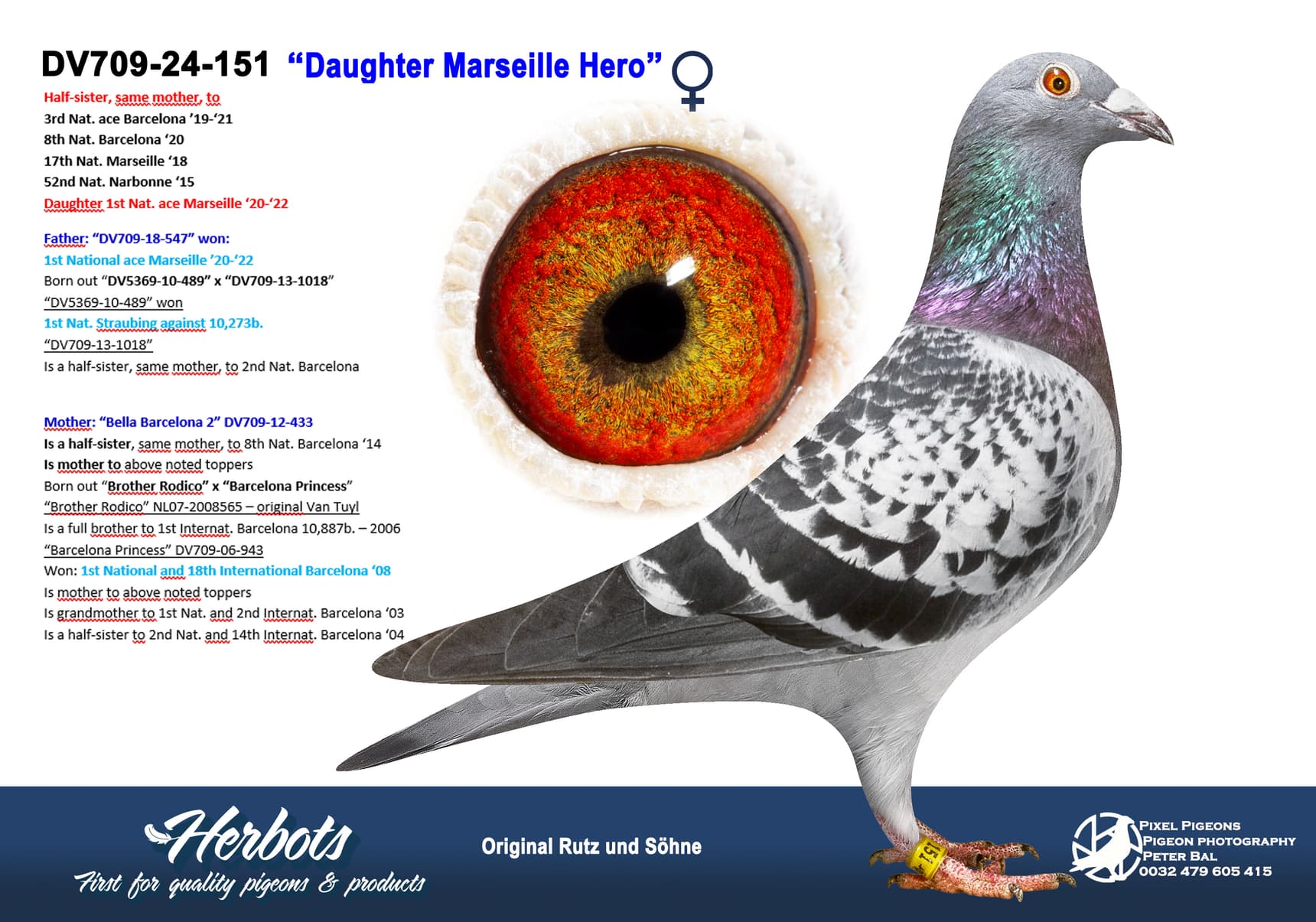 Direct son “Shishigo” (3rd Nat. ace Barcelona ’07-’09) x “DV7505-09-1007” (21st, 135th Nat. Narbonne – 34th, 76th, 85th, 177th Nat. Barcelona)