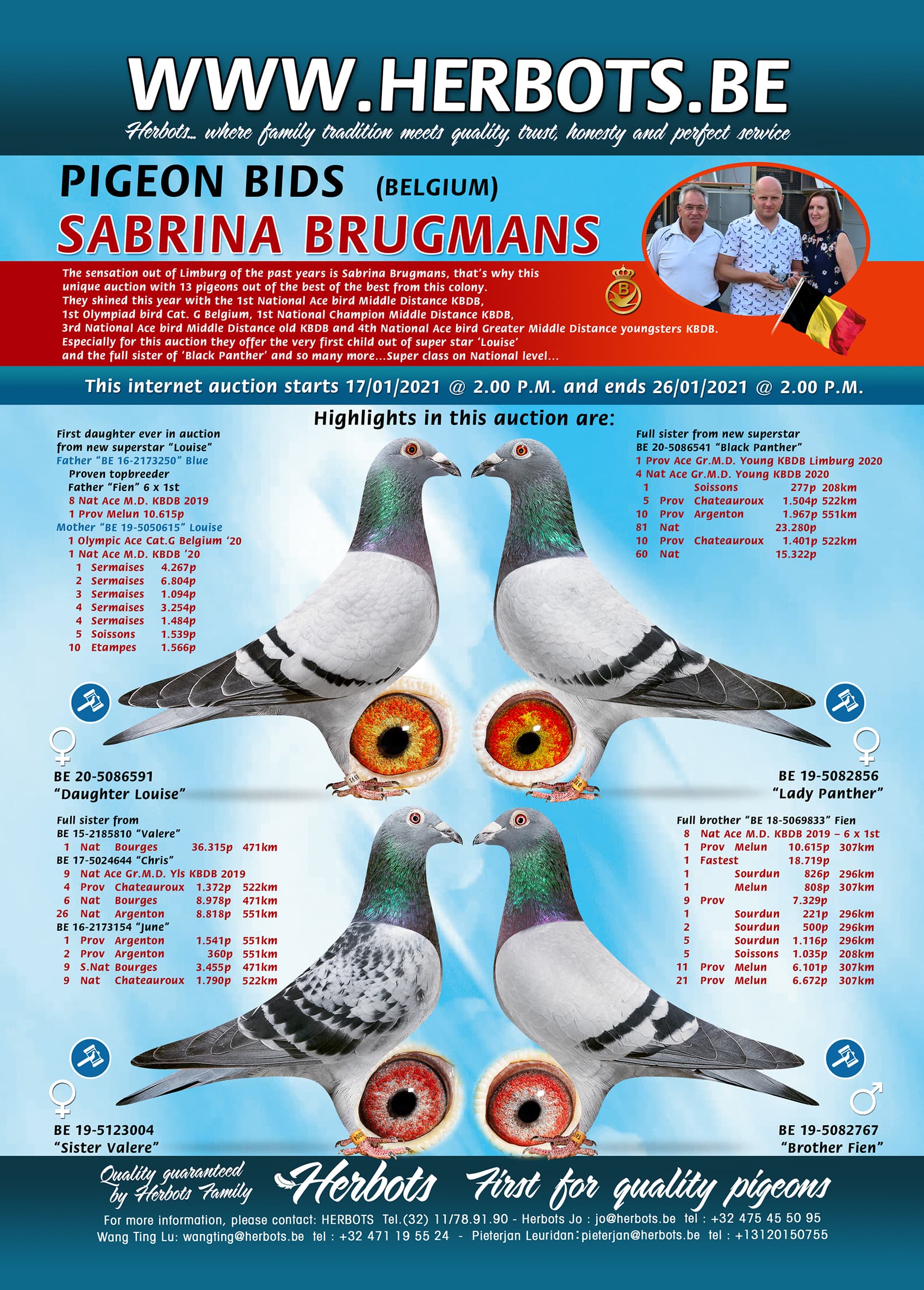 The sensation out of Limburg of the past years is Sabrina Brugmans, that’s why this unique auction with 13 pigeons out of the best of the best from this colony. They shined this year with the 1st National Ace bird Middle Distance KBDB, 1st Olympiad bird Cat. G Belgium, 1st National Champion Middle Distance KBDB, 3rd National Ace bird Middle Distance old KBDB and 4th National Ace bird Greater Middle Distance youngsters KBDB. Especially for this auction they offer the very first child out of super star ‘Louise’ and the full sister of ‘Black Panther’ and so many more…Super class on National level….