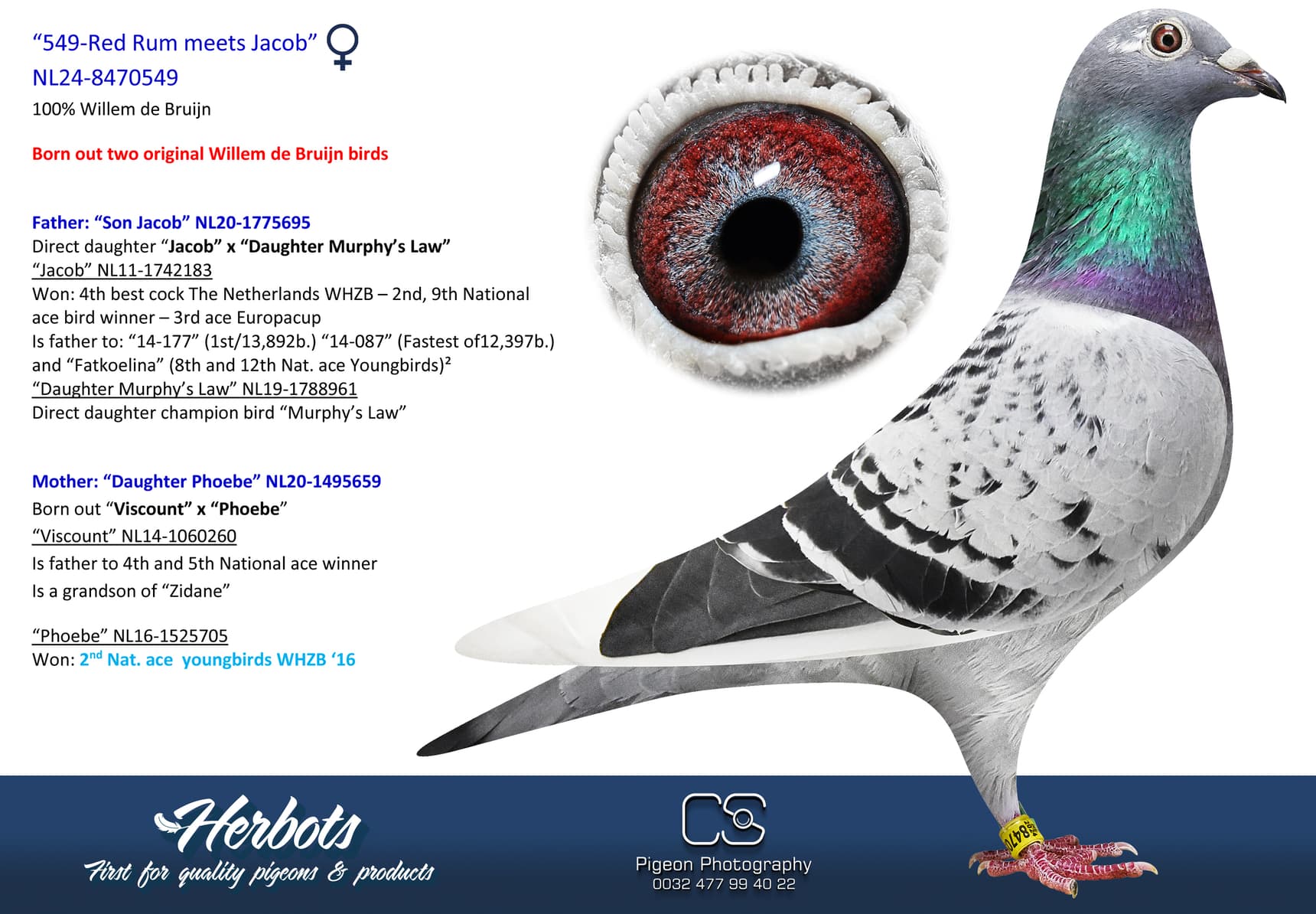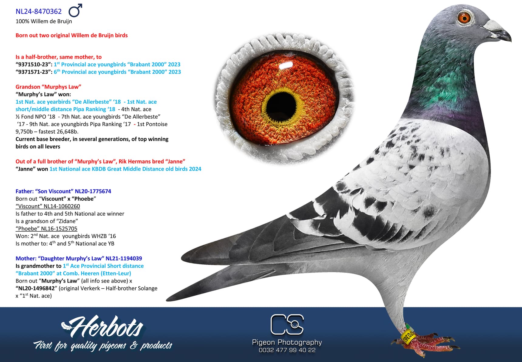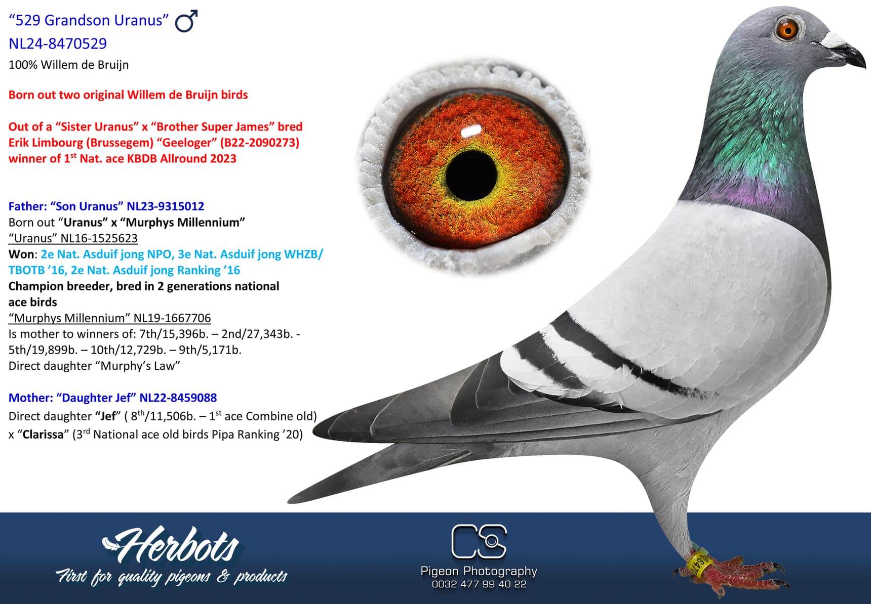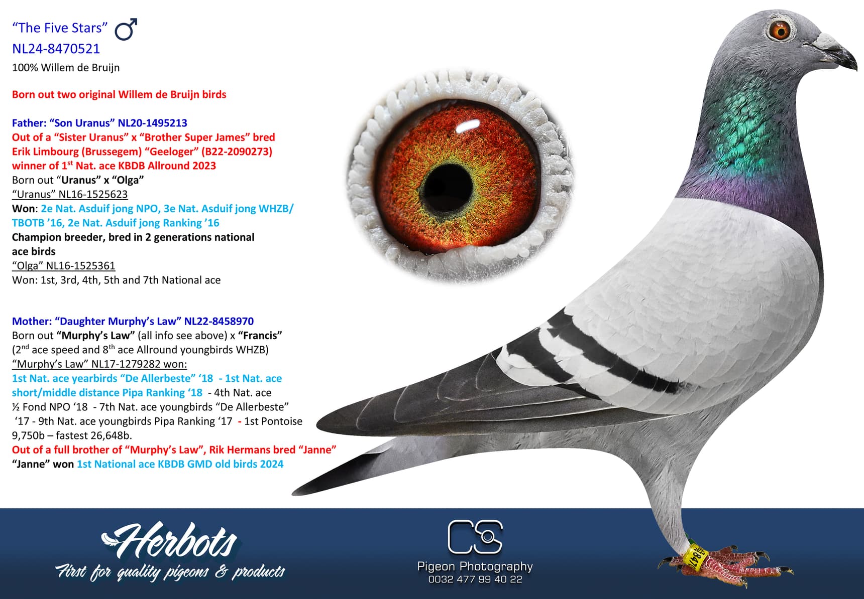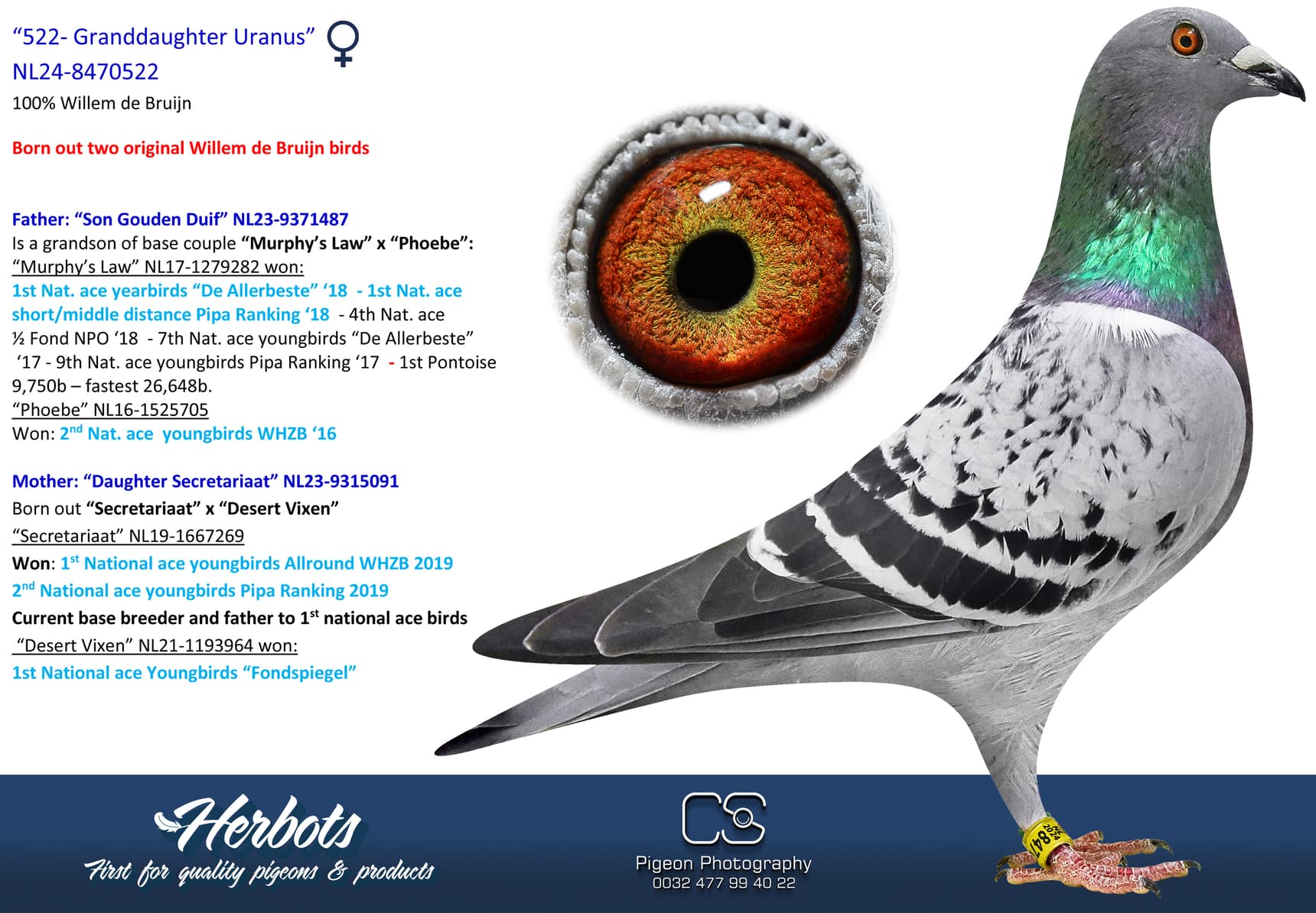 Direct children of “Murphy’s Law”, “Uranus”, “Phoebe”, “Hurricane”, “Jacob”, “Red Rum”, “De Herman”, “Viscount” and so on are housed on his breeding loft