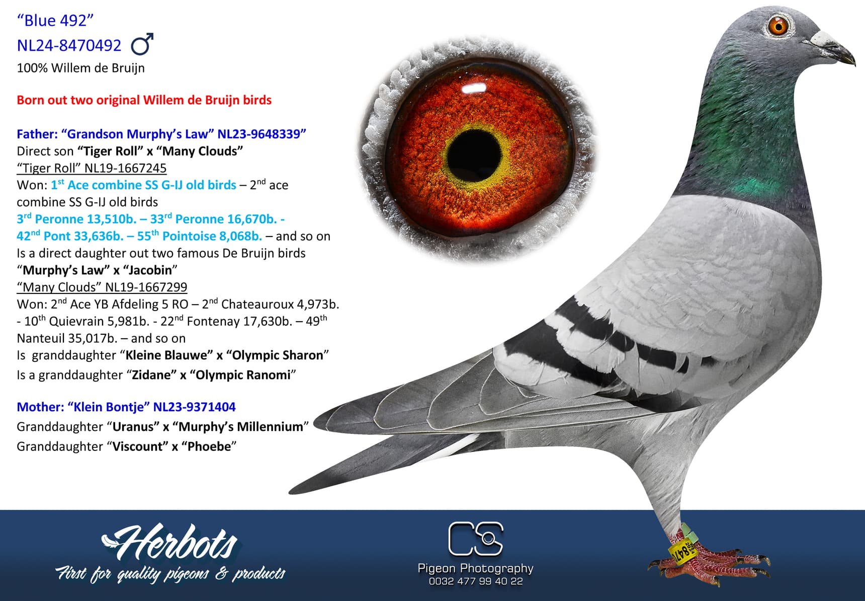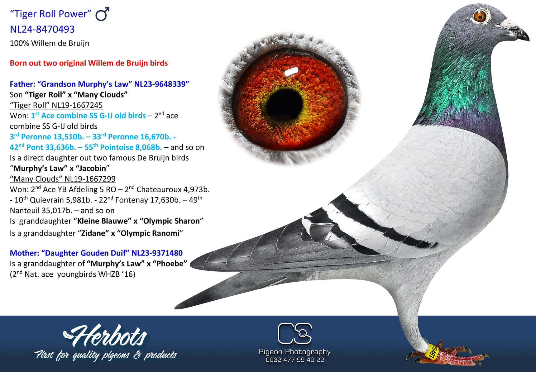 1st Nat. ace yearbirds “De Allerbeste” ‘18 - 1st Nat. ace short/middle distance Pipa Ranking ‘18 - 4th Nat. ace ½ Fond NPO ‘18 - 7th Nat. ace youngbirds “De Allerbeste” ‘17 - 9th Nat. ace youngbirds Pipa Ranking ‘17 - 1st Pontoise 9,750b – fastest 26,648b.
