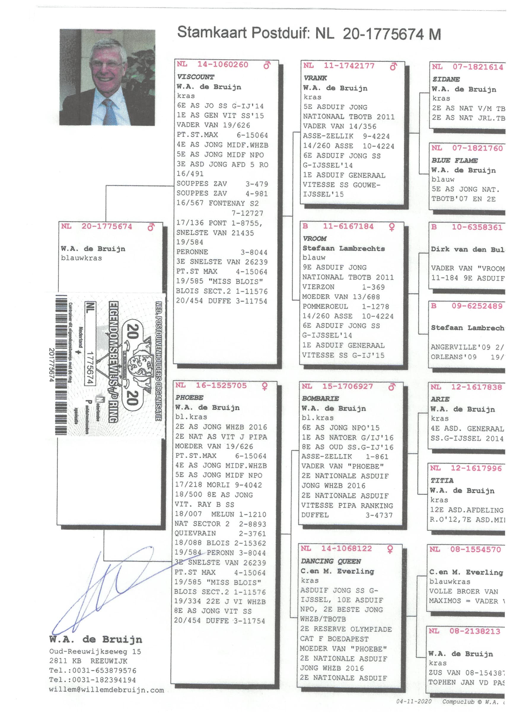 1st Nat. ace yearbirds “De Allerbeste” ‘18 - 1st Nat. ace short/middle distance Pipa Ranking ‘18 - 4th Nat. ace ½ Fond NPO ‘18 - 7th Nat. ace youngbirds “De Allerbeste” ‘17 - 9th Nat. ace youngbirds Pipa Ranking ‘17 - 1st Pontoise 9,750b – fastest 26,648b.
