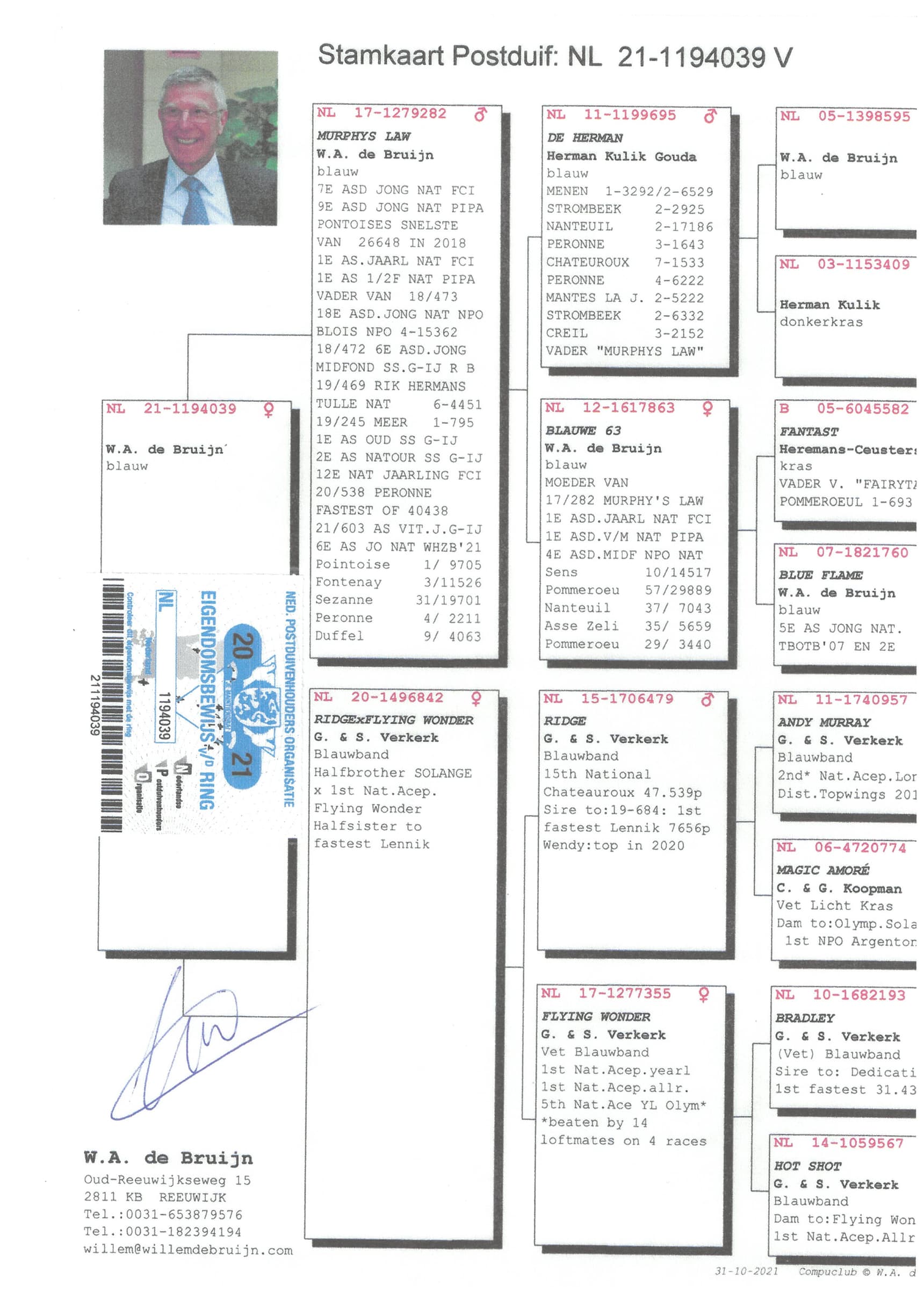 1st Nat. ace yearbirds “De Allerbeste” ‘18 - 1st Nat. ace short/middle distance Pipa Ranking ‘18 - 4th Nat. ace ½ Fond NPO ‘18 - 7th Nat. ace youngbirds “De Allerbeste” ‘17 - 9th Nat. ace youngbirds Pipa Ranking ‘17 - 1st Pontoise 9,750b – fastest 26,648b.