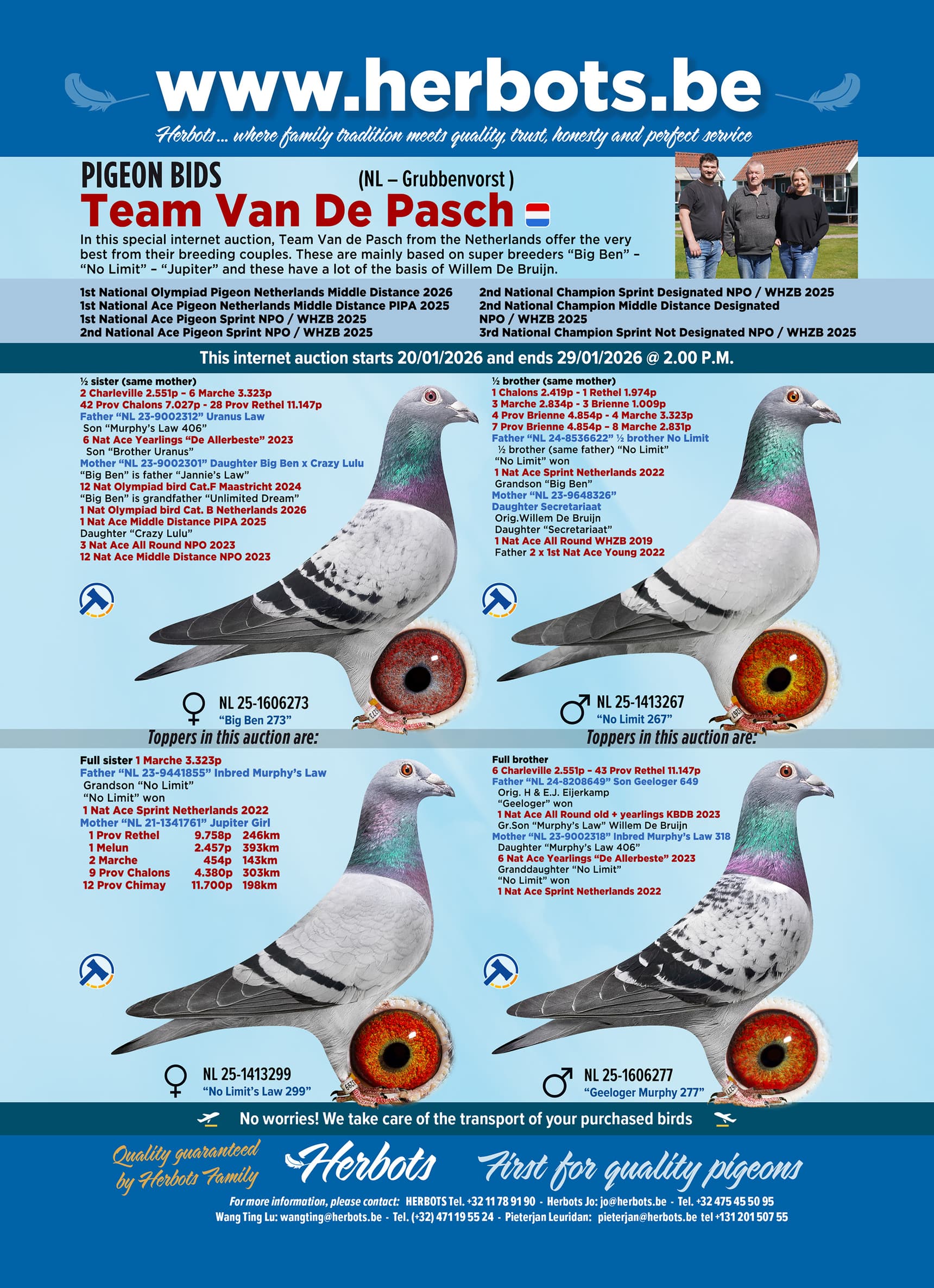 In this special internet auction, Team Van de Pasch from the Netherlands offer the very best from their breeding couples. These are mainly based on super breeders “Big Ben” – “No Limit” – “Jupiter” and these have a lot of the basis of Willem De Bruijn.