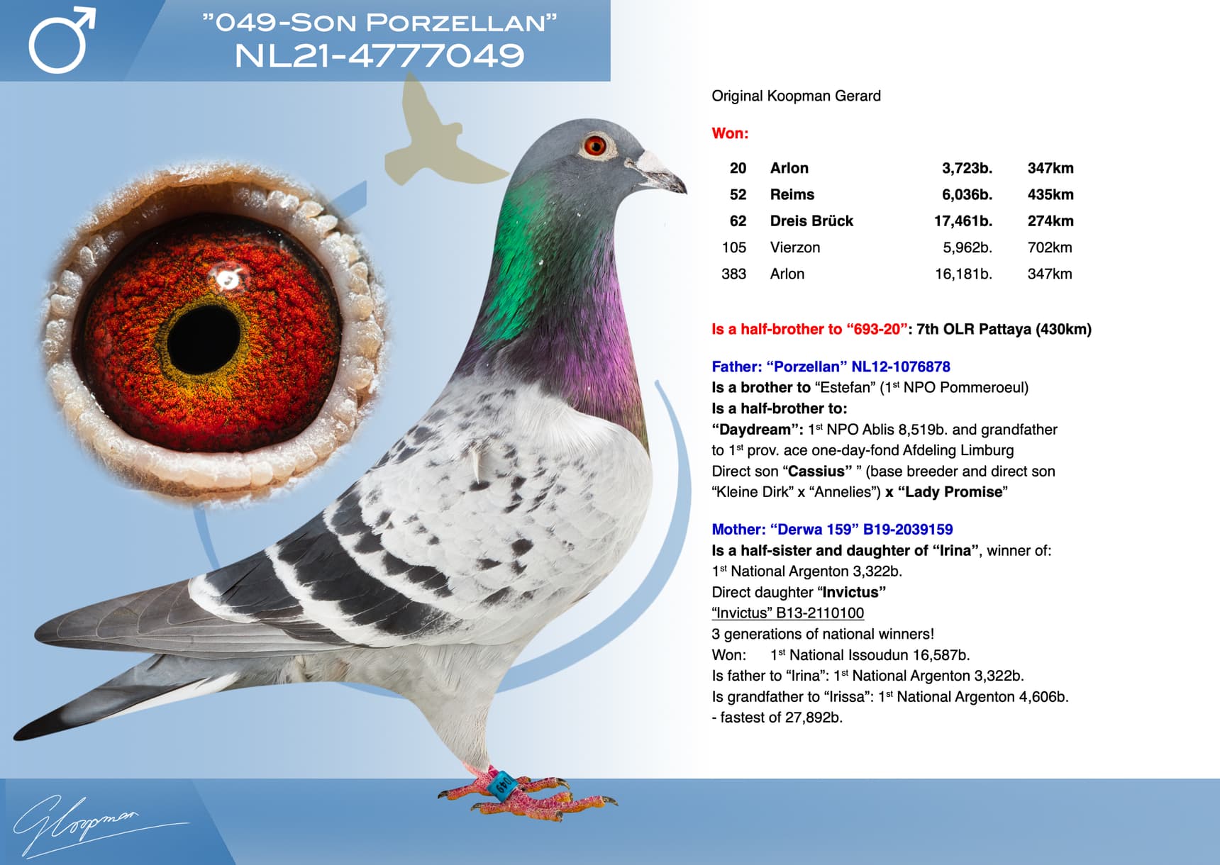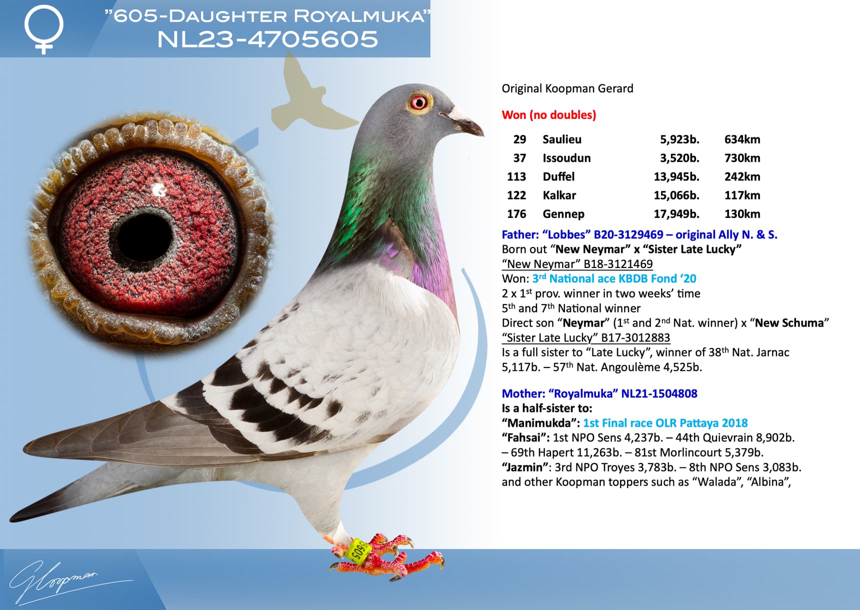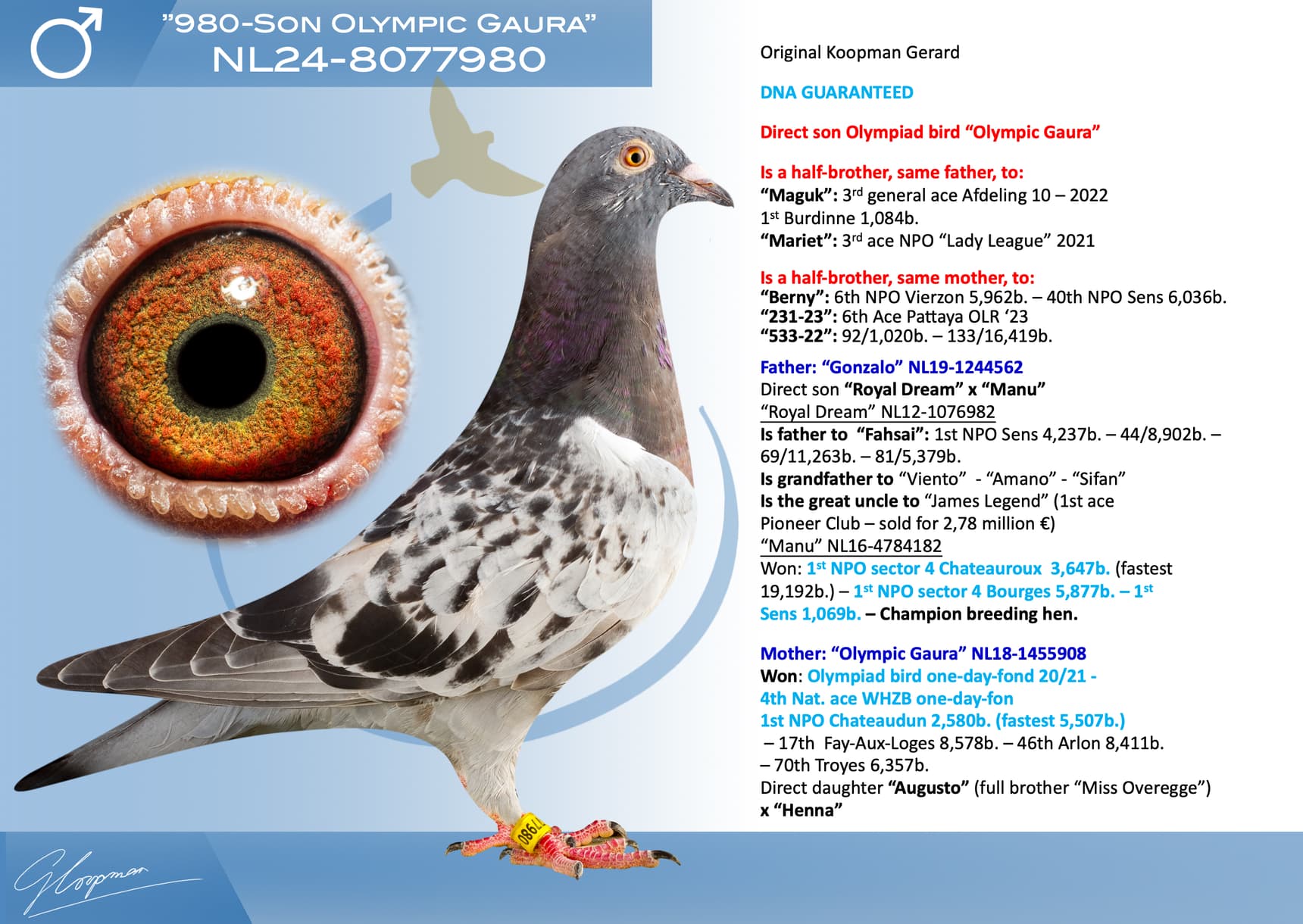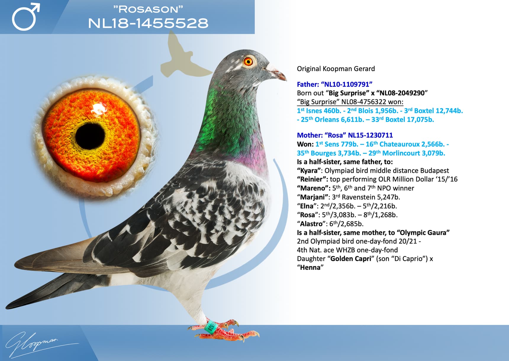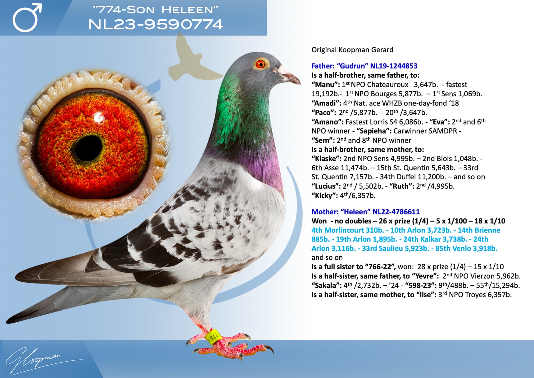 In total, Gerard is auctioning 623 birds. 153 will be sold in 2 public auctions (organization Sportblad De Duif) and 470 Koopman birds will be offered during 4 days (9-10-11 and 12 December) on internet auction Pigeon Bids (organization www.herbots.be.)