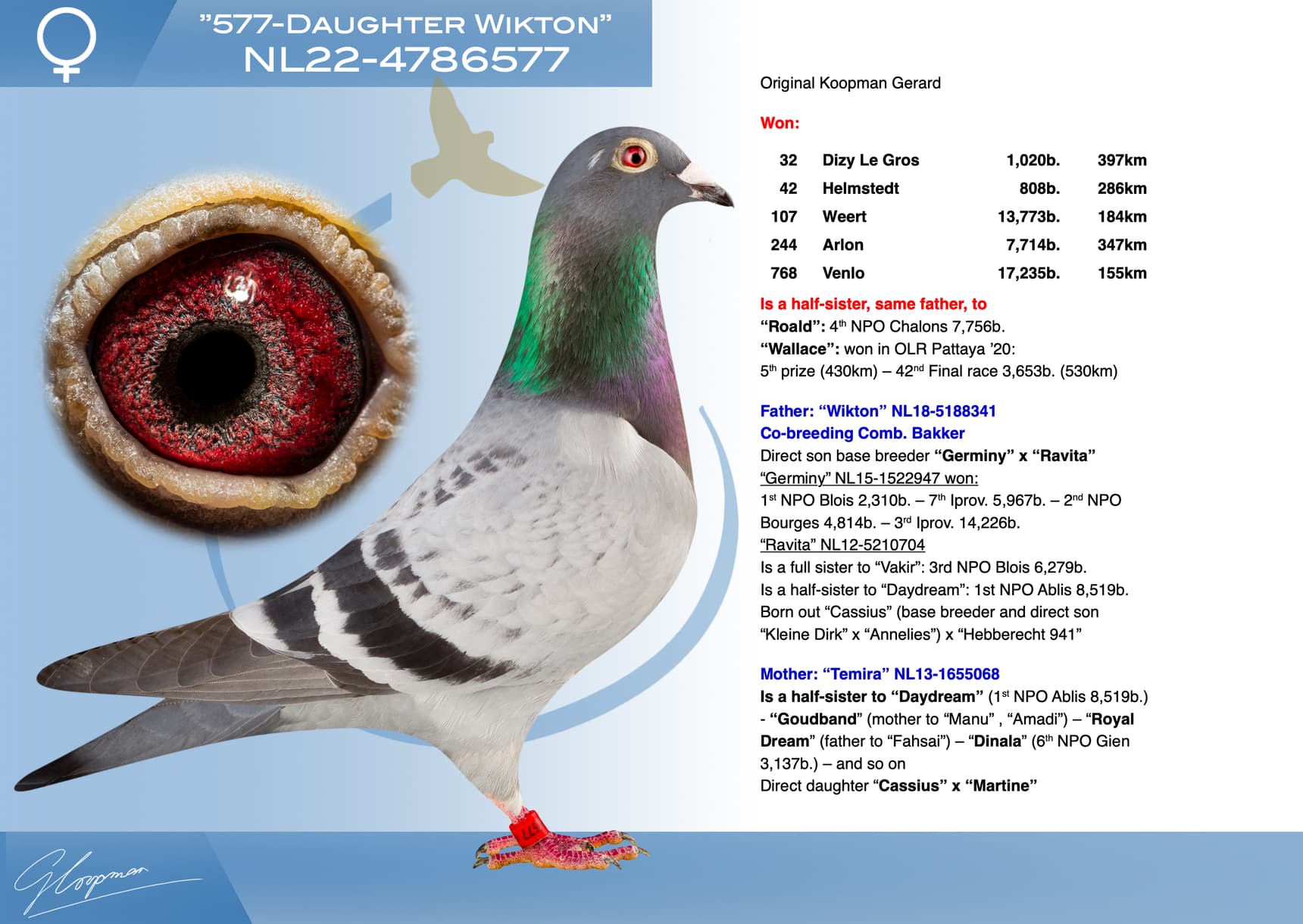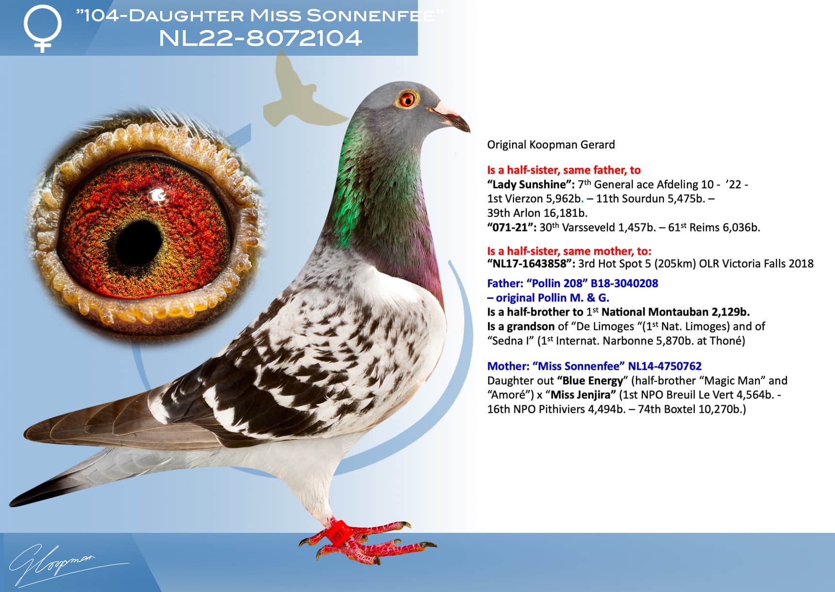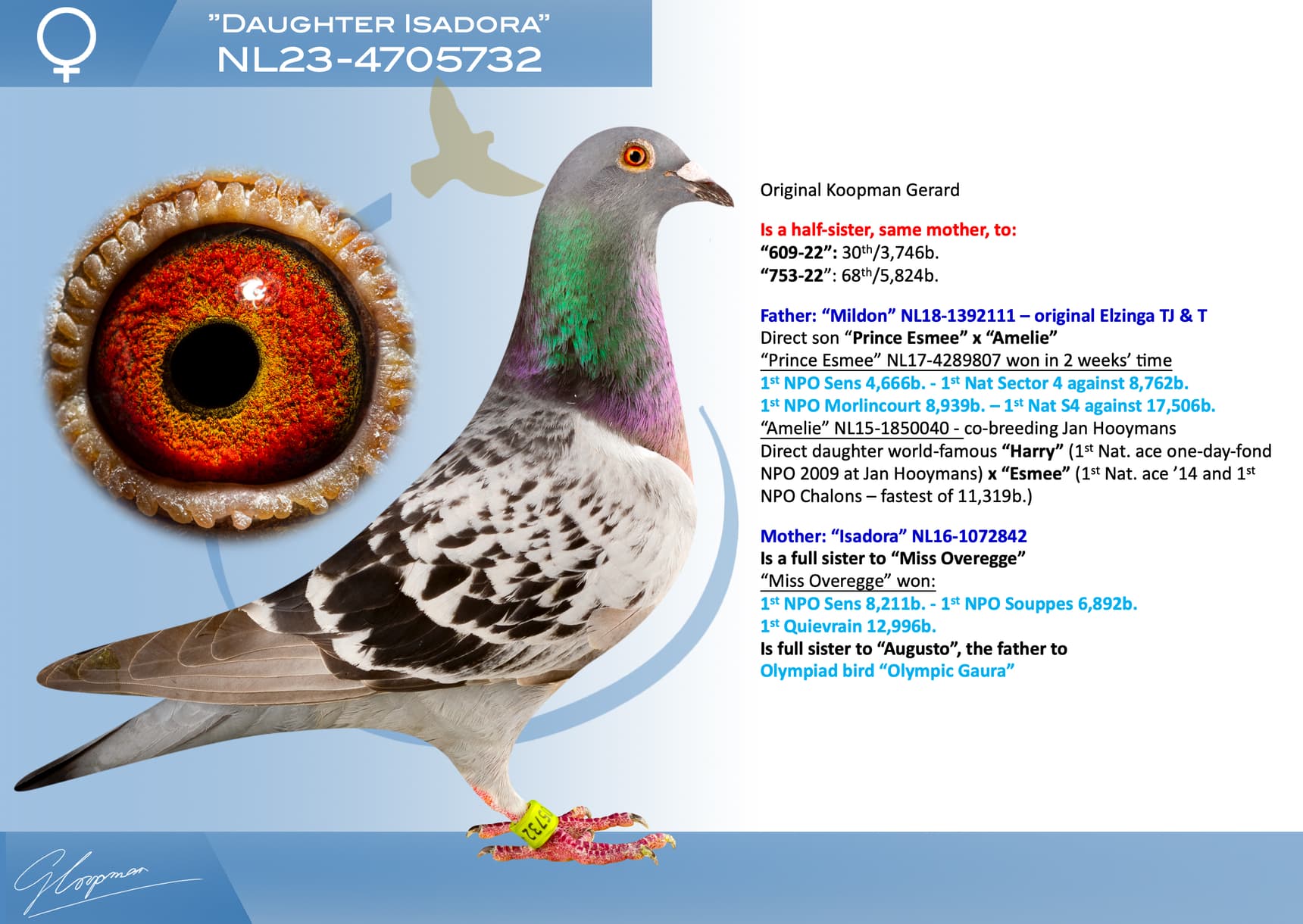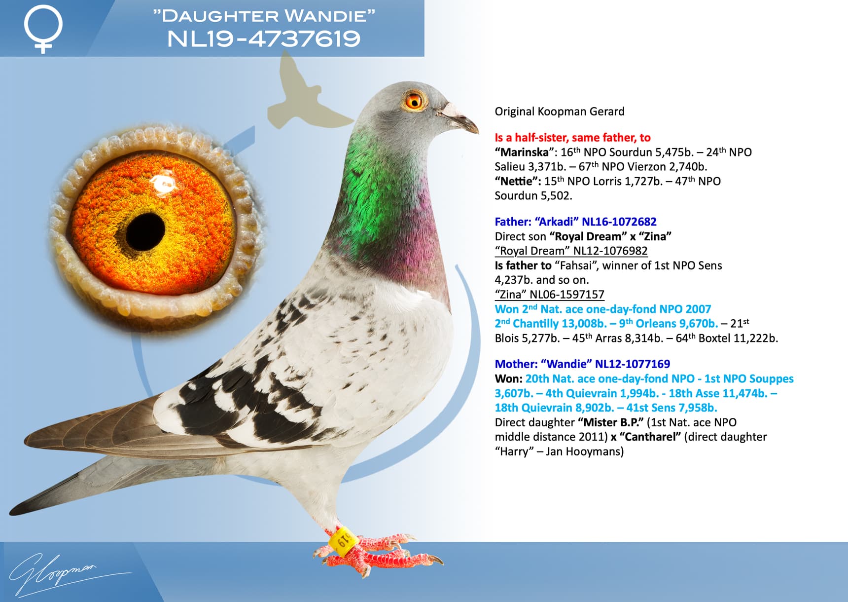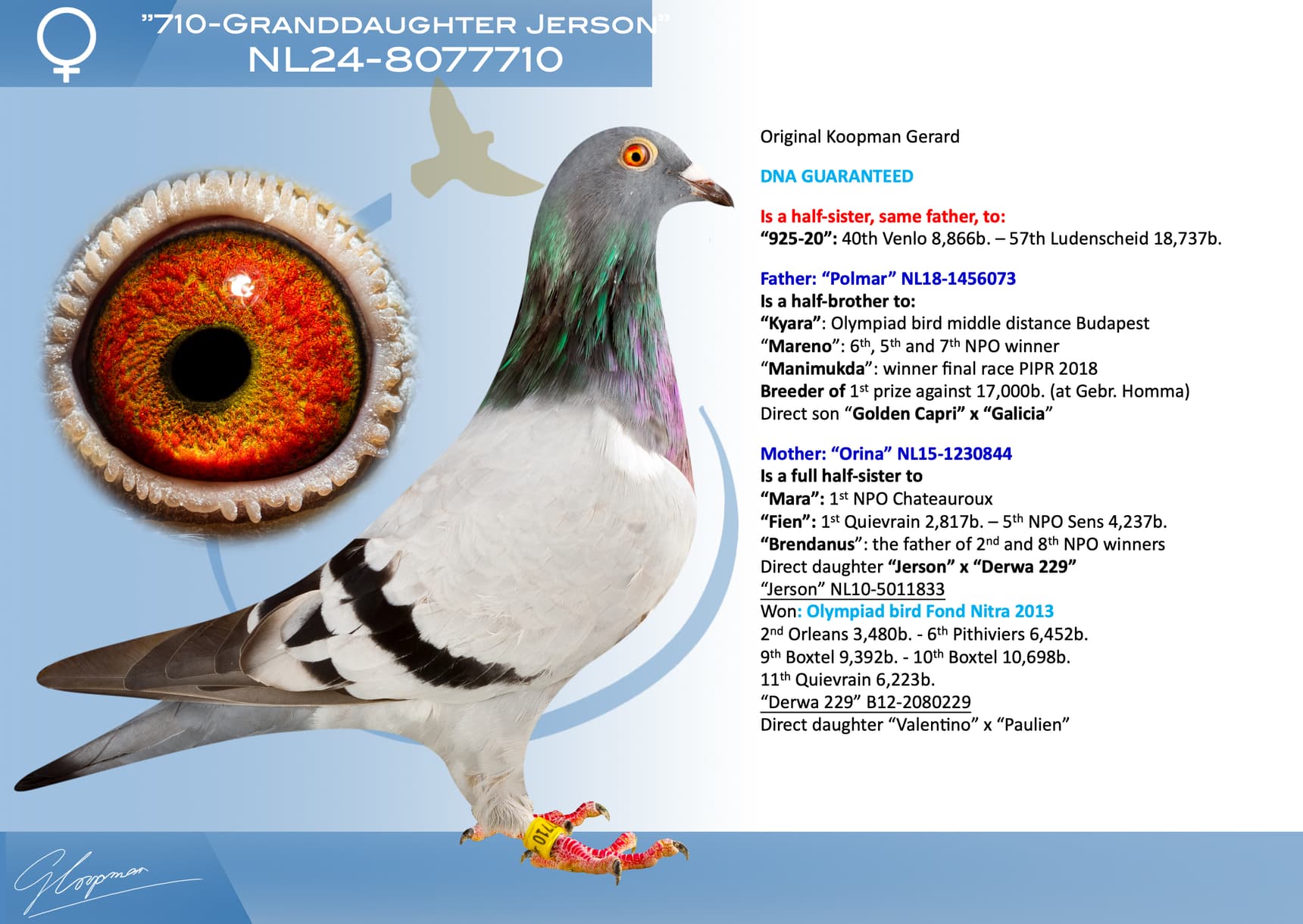 Direct daughter Olympiad bird Fond Nitra “Jerson” x “Top Girl” (daughter “Cassius” x “Marijke”)