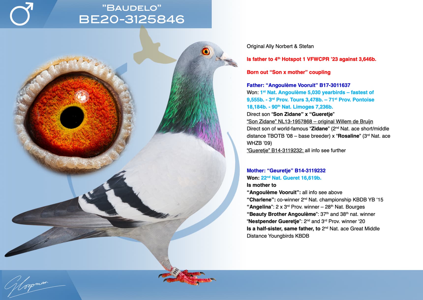 Direct son of world-famous “Zidane” (2nd Nat. ace short/middle distance TBOTB ’08 – base breeder) x “Rosaline” (3rd Nat. ace WHZB ’09)