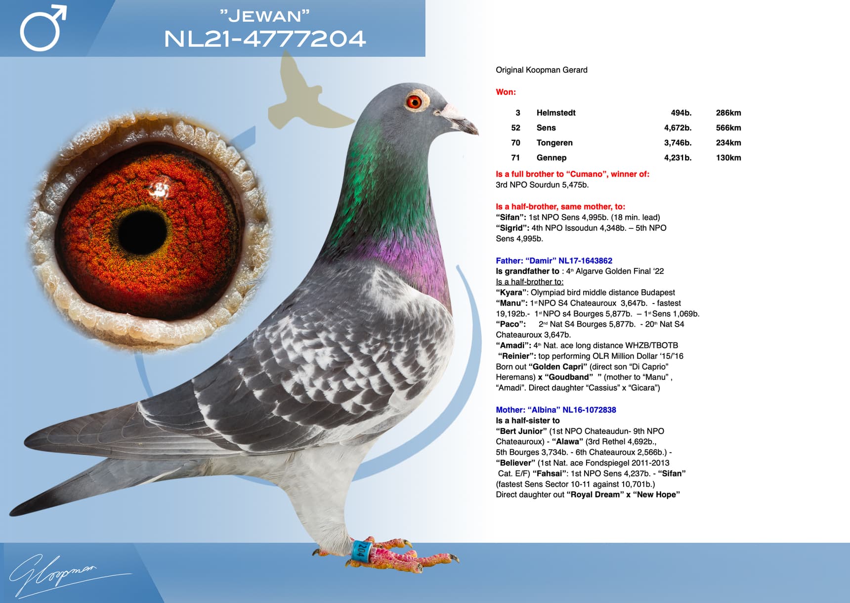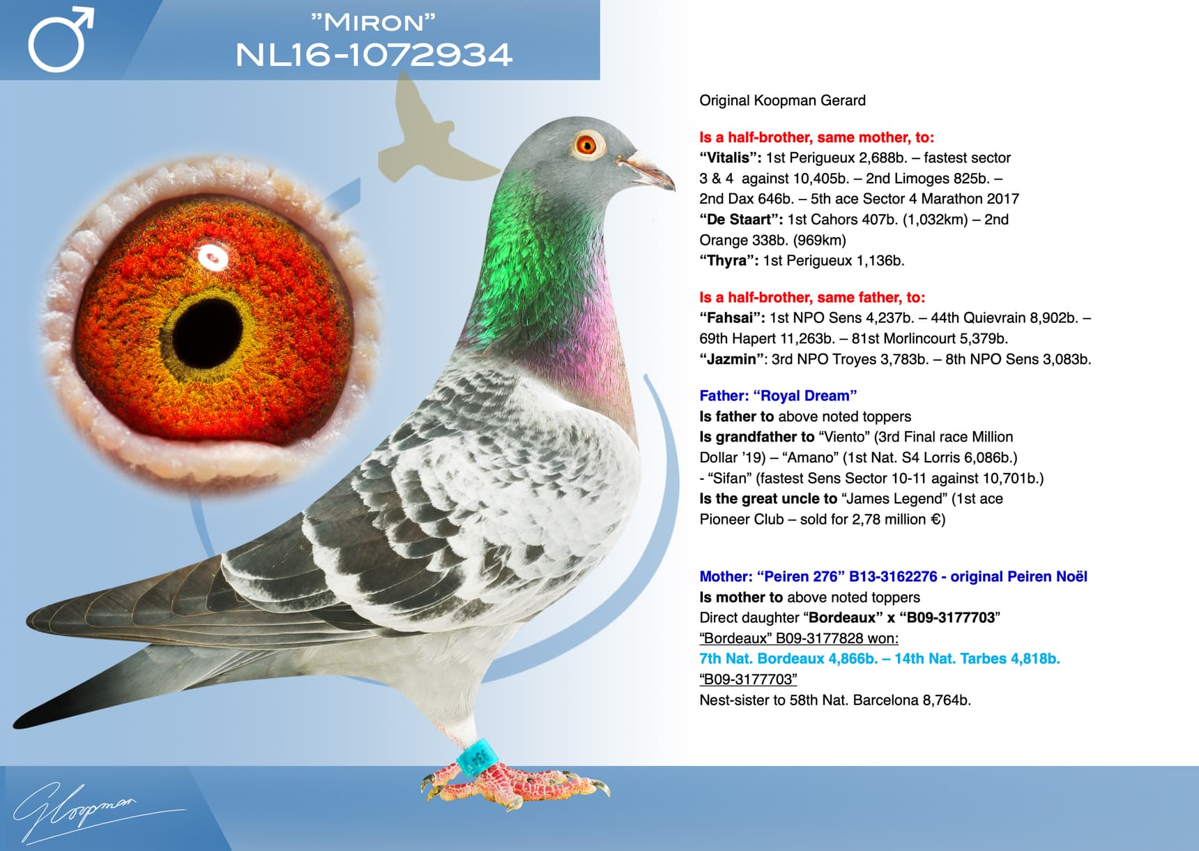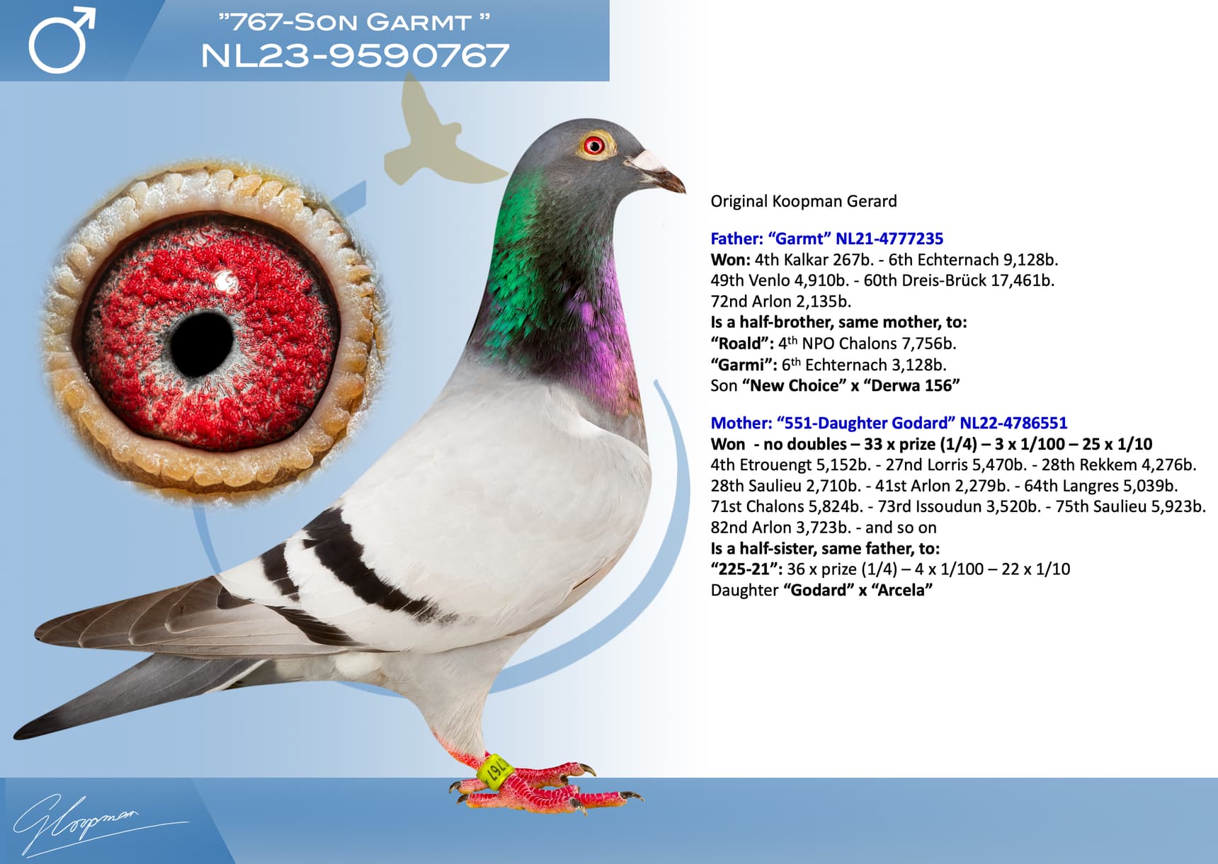 In total, Gerard is auctioning 623 birds. 153 will be sold in 2 public auctions (organization Sportblad De Duif) and 470 Koopman birds will be offered during 4 days (9-10-11 and 12 December) on internet auction Pigeon Bids (organization www.herbots.be.)