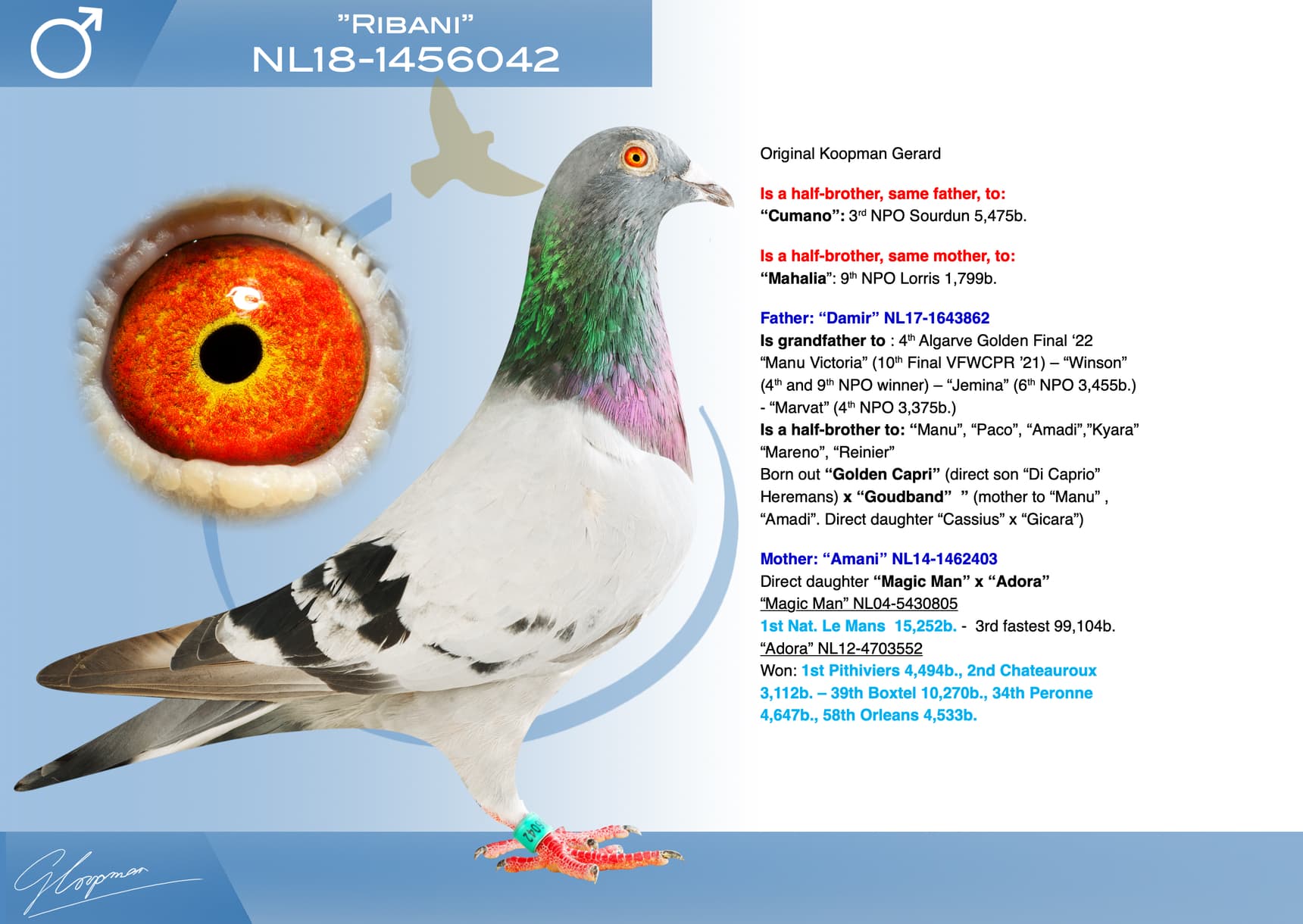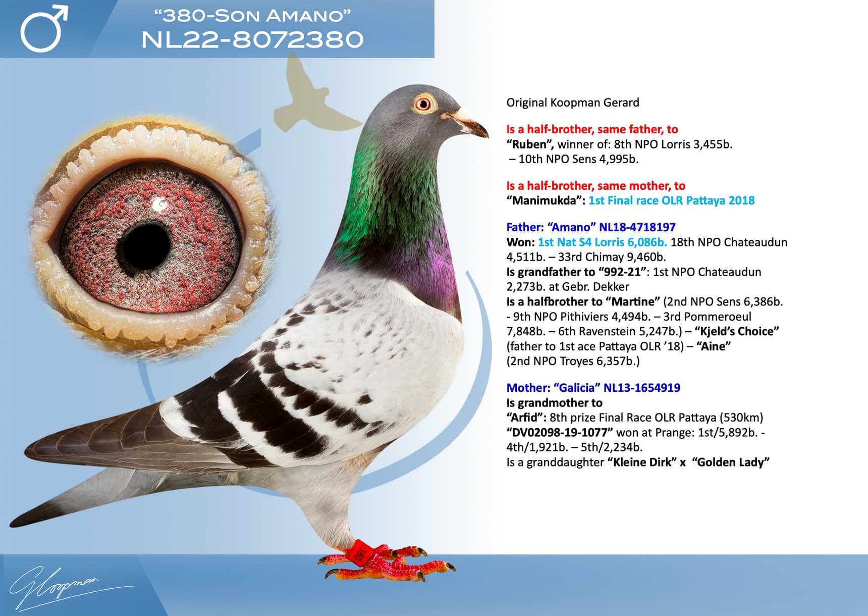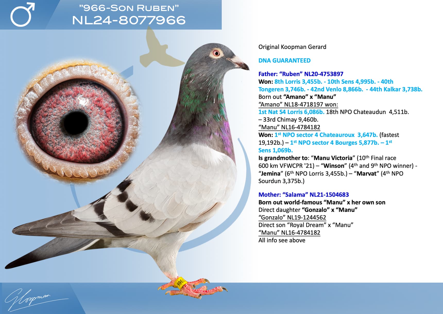In total, Gerard is auctioning 623 birds. 153 will be sold in 2 public auctions (organization Sportblad De Duif) and 470 Koopman birds will be offered during 4 days (9-10-11 and 12 December) on internet auction Pigeon Bids (organization www.herbots.be.)