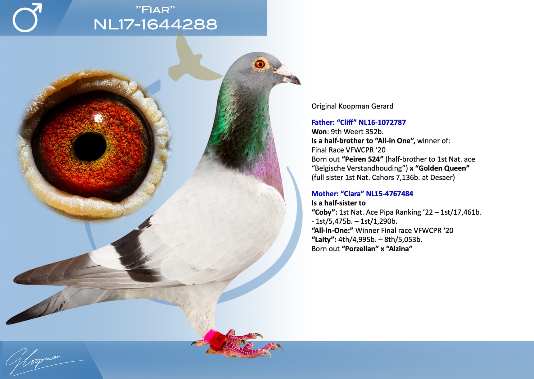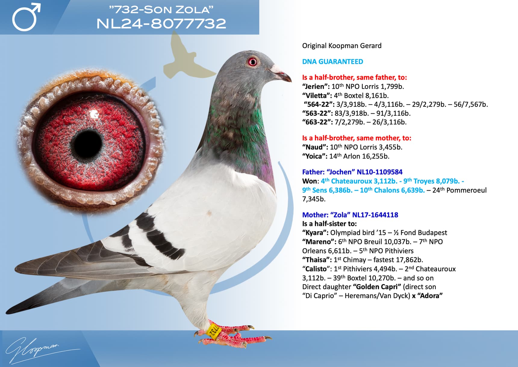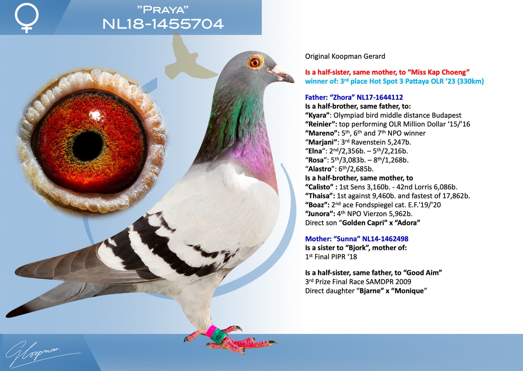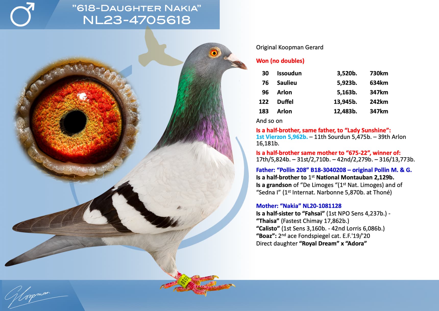 Direct son “Jerson” (Olympiad bird Nitra) x “Kyara” (Olympiad bird ½ Fond - 15th Nat. ace one-day-fond NPO)