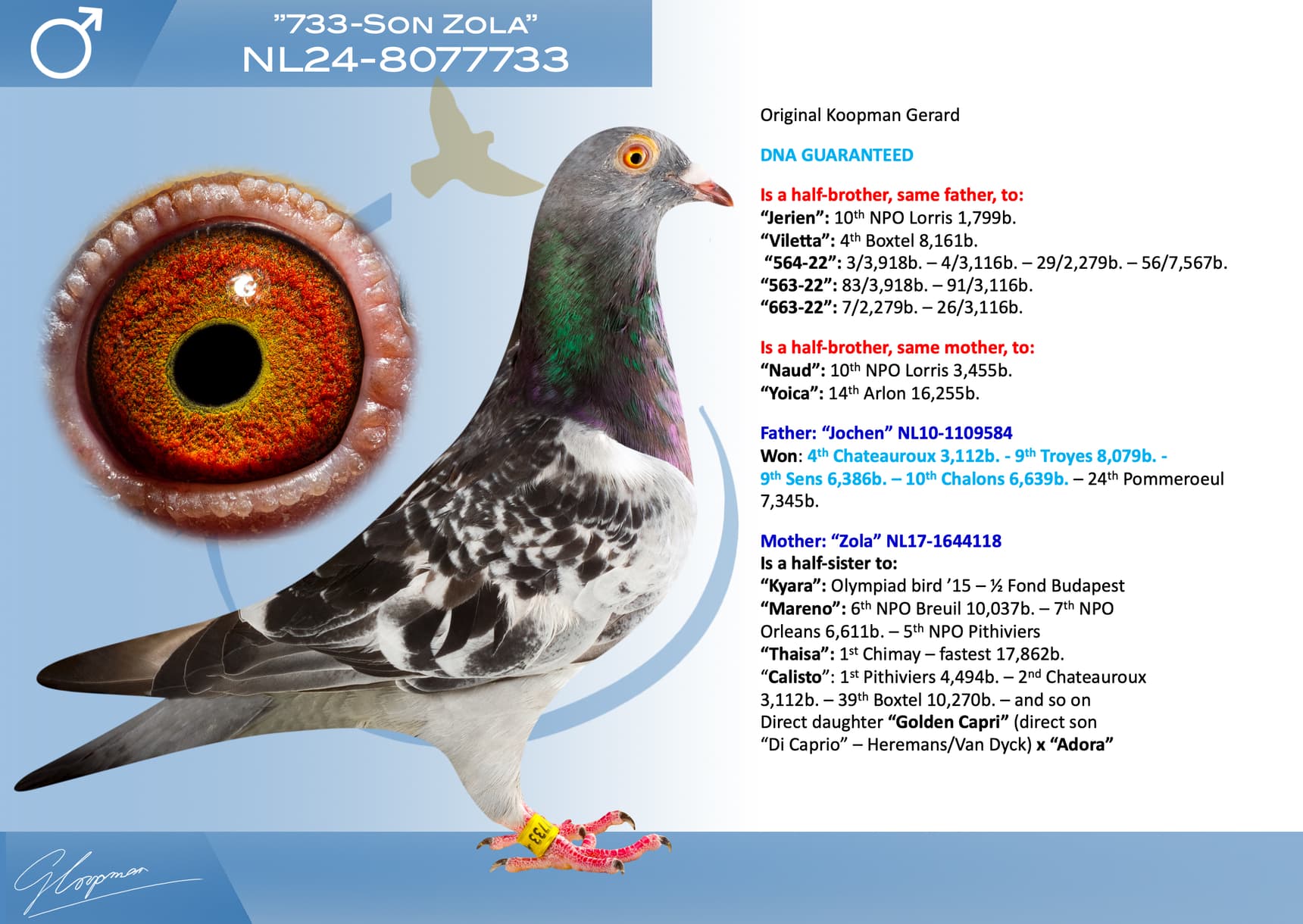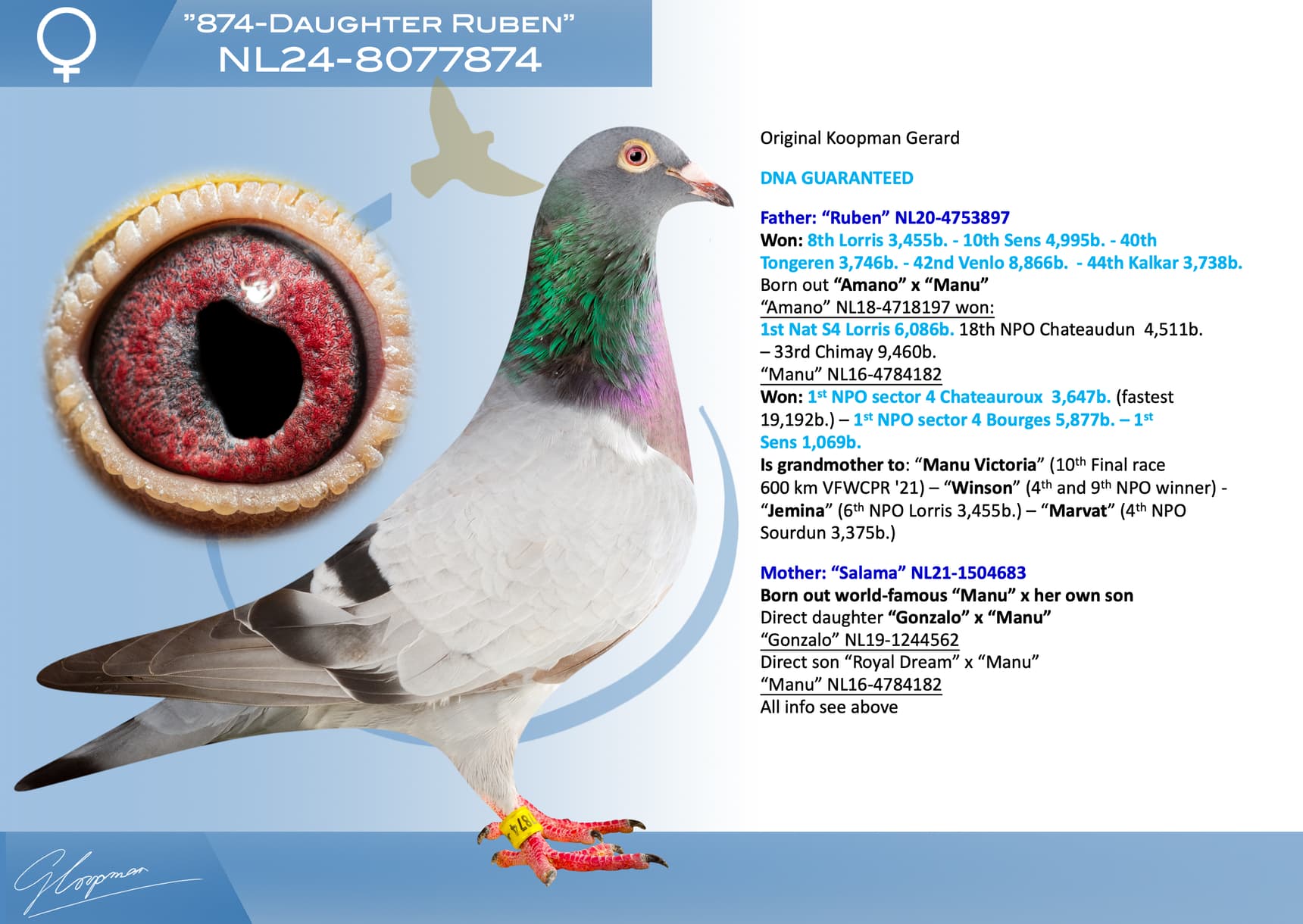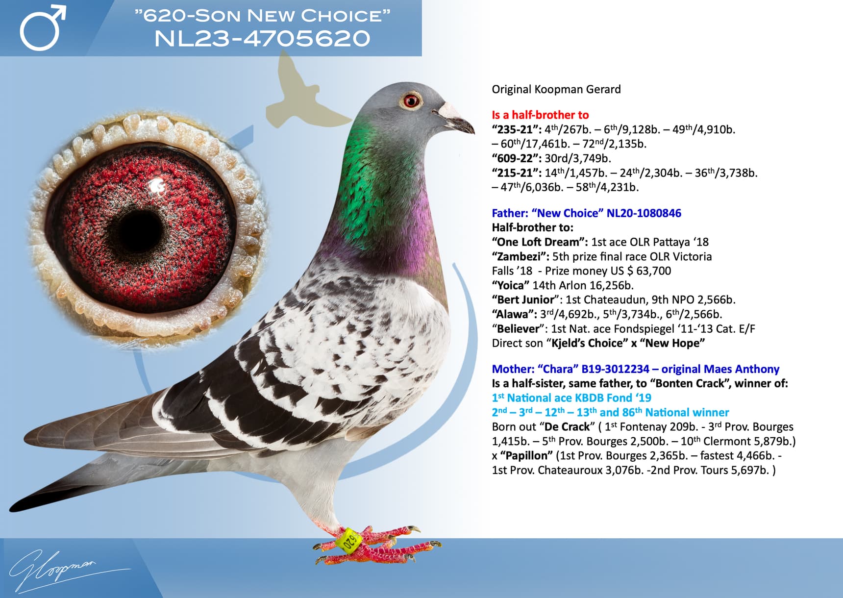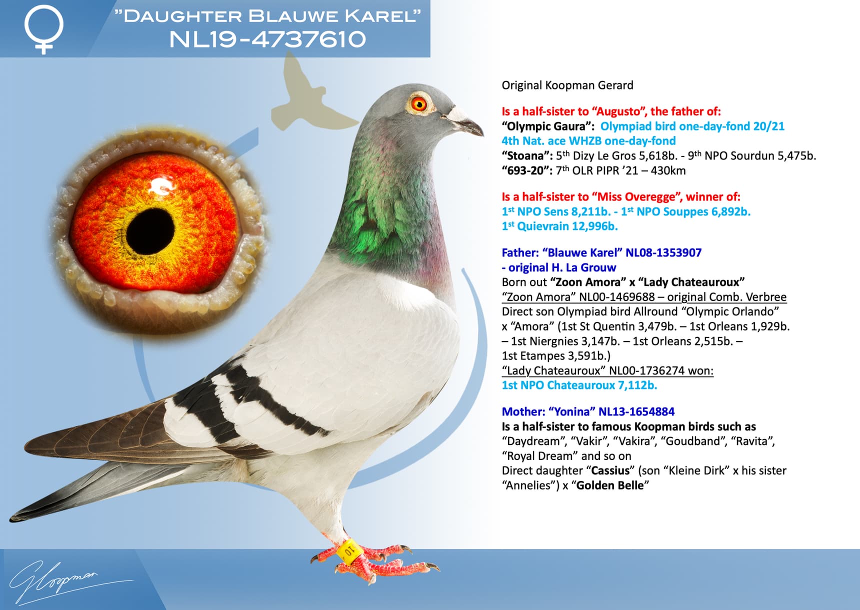 Direct son “Jerson” (Olympiad bird Nitra) x “Kyara” (Olympiad bird ½ Fond - 15th Nat. ace one-day-fond NPO)