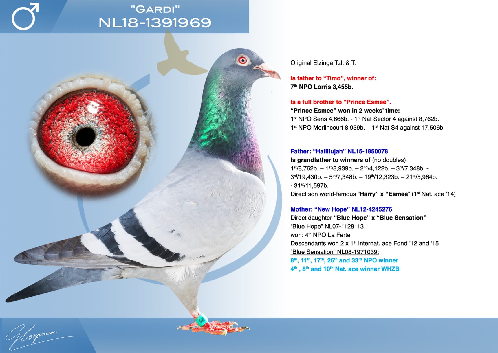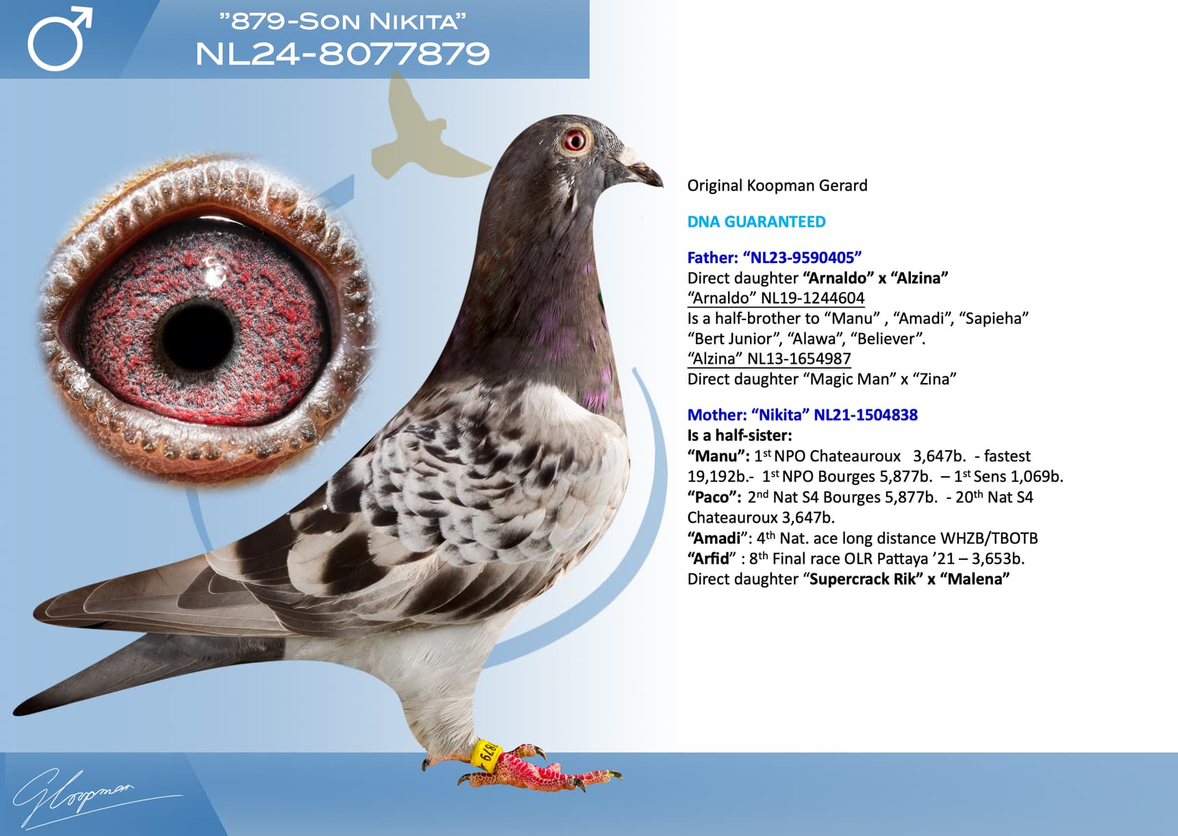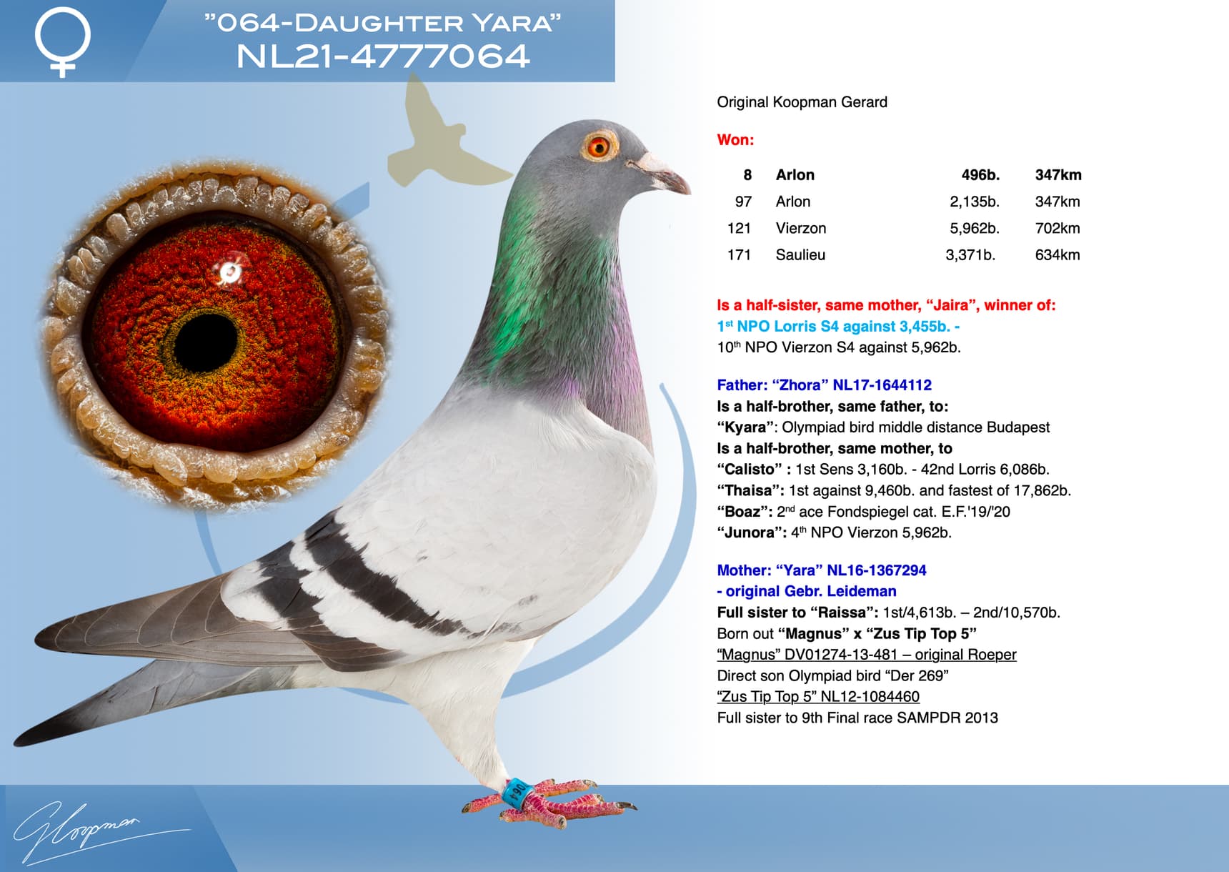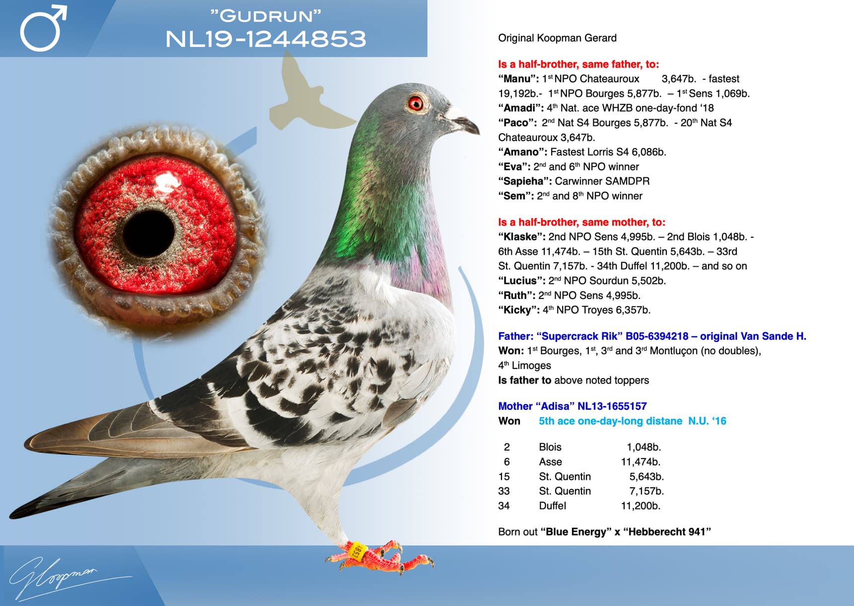 Direct son “Jerson” (Olympiad bird Nitra) x “Kyara” (Olympiad bird ½ Fond - 15th Nat. ace one-day-fond NPO)