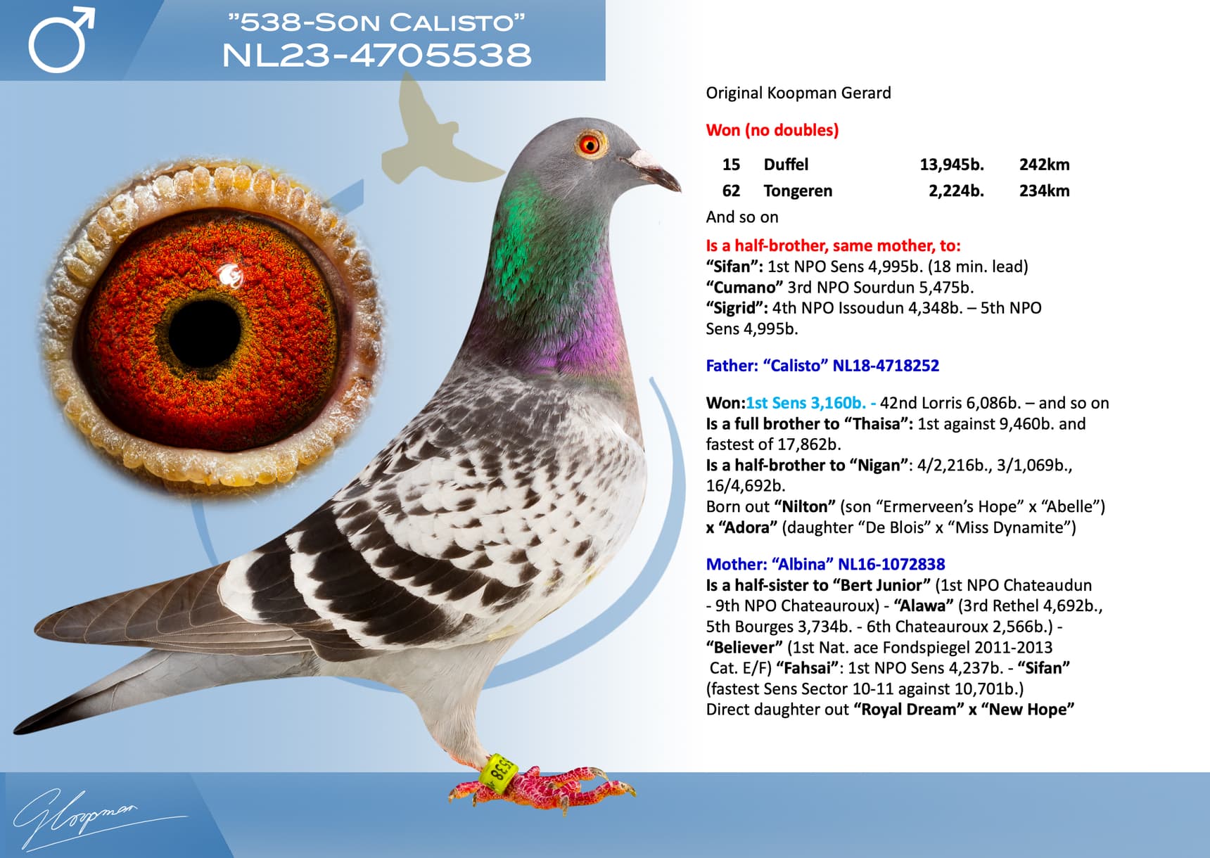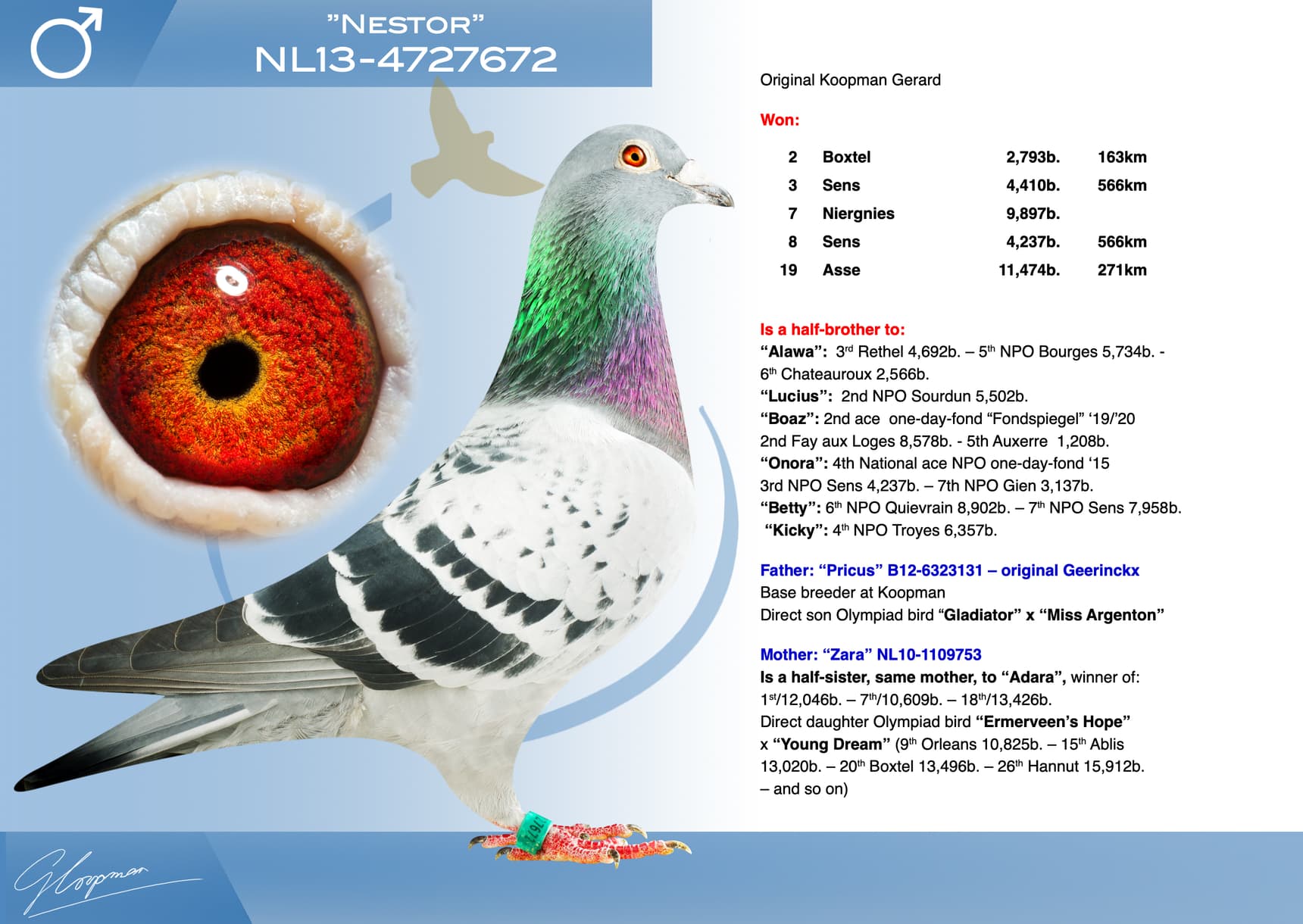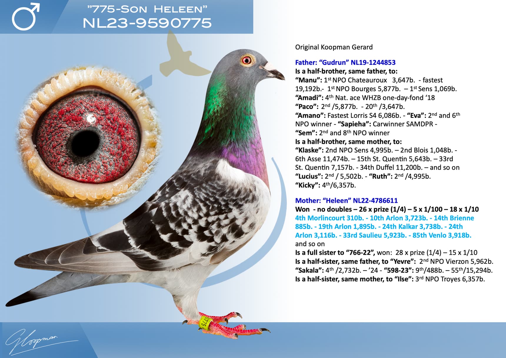In total, Gerard is auctioning 623 birds. 153 will be sold in 2 public auctions (organization Sportblad De Duif) and 470 Koopman birds will be offered during 4 days (9-10-11 and 12 December) on internet auction Pigeon Bids (organization www.herbots.be.)