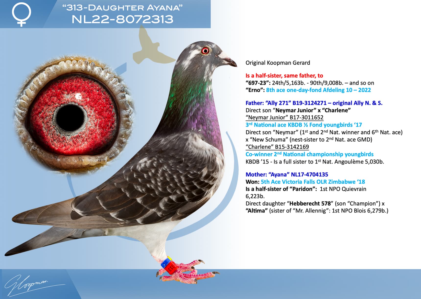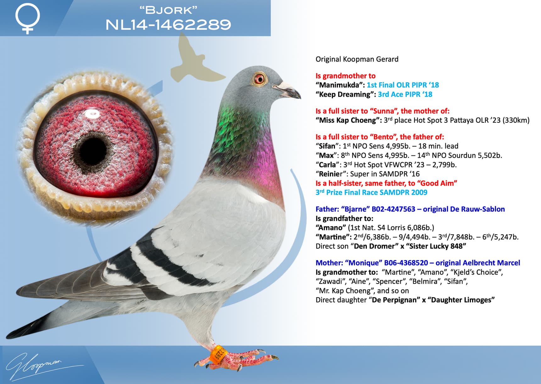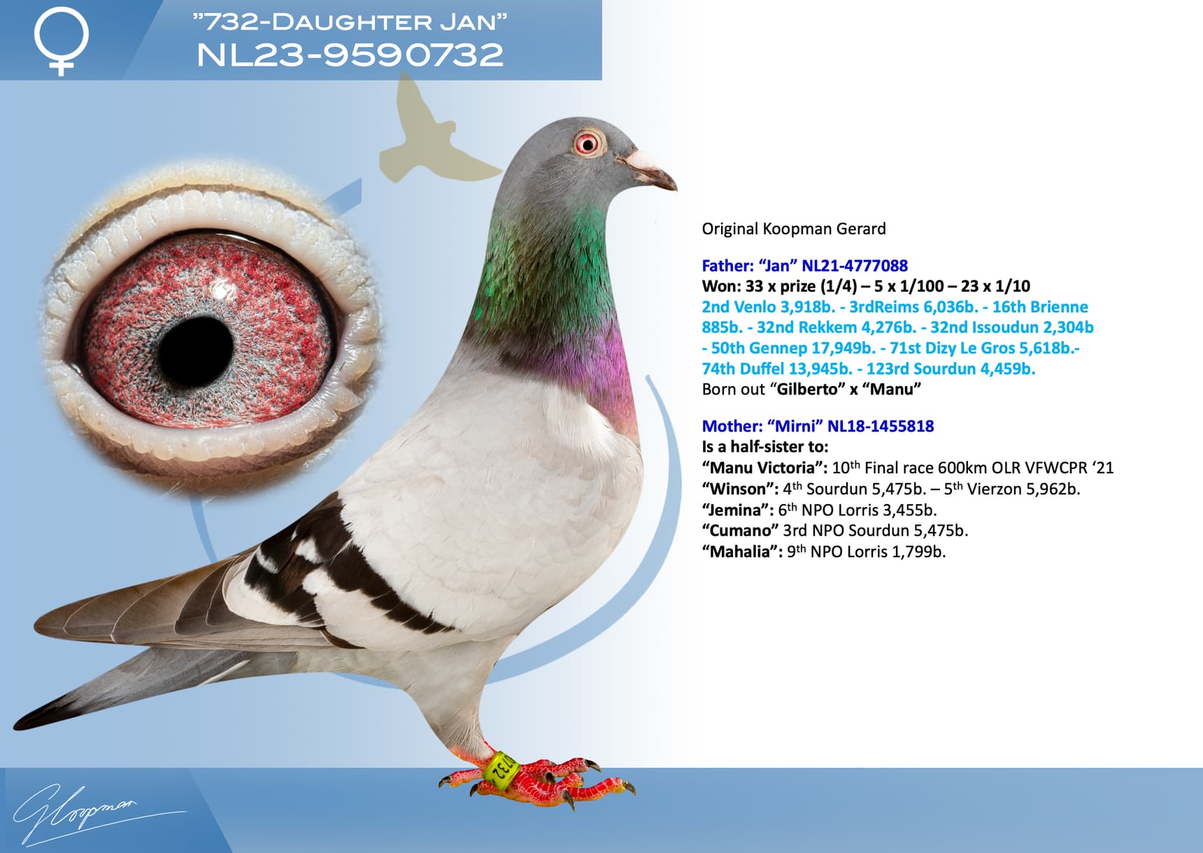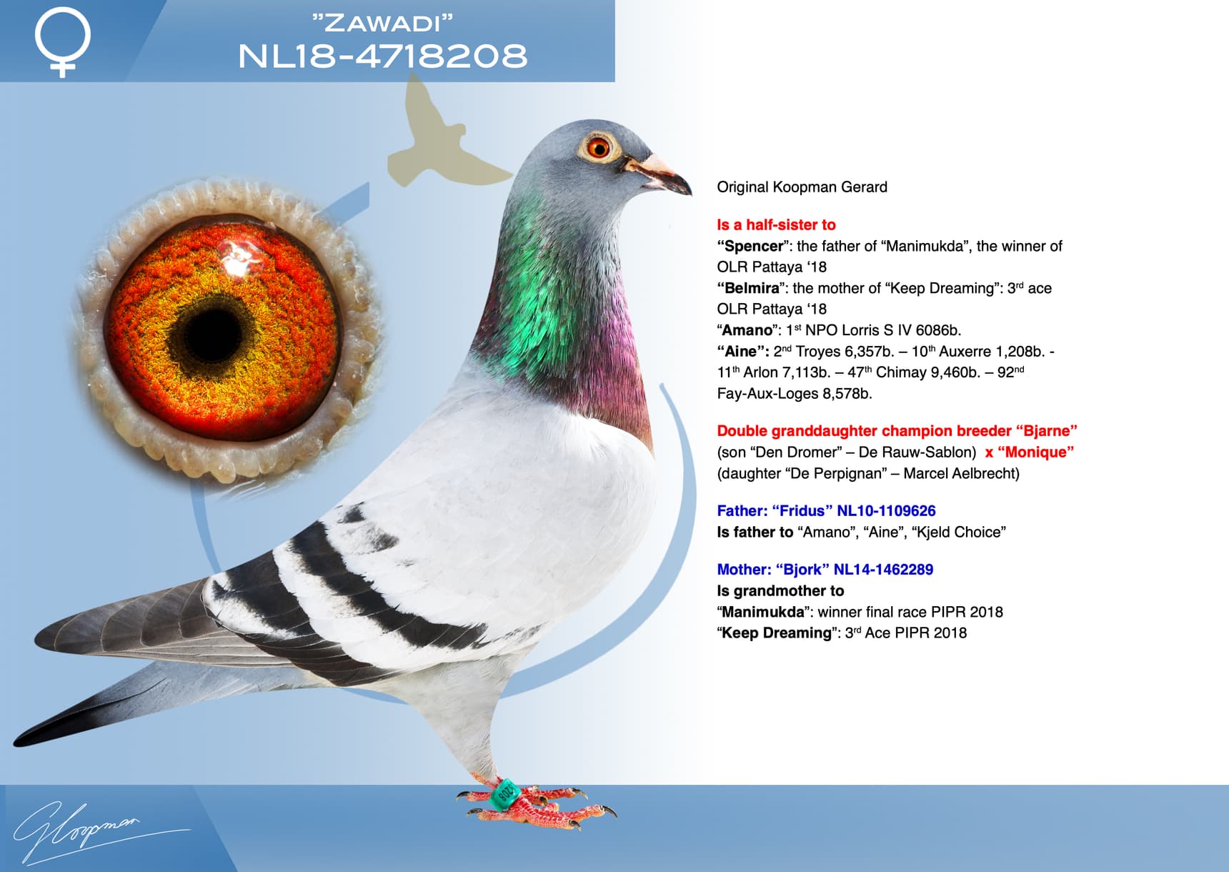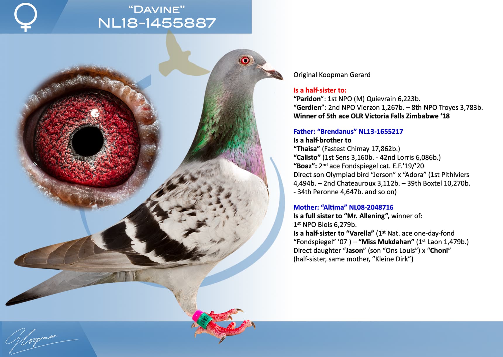 Direct daughter Olympiad bird “Ermerveen’s Hope” x “Young Dream” (9th Orleans 10,825b. – 15th Ablis 13,020b. – 20th Boxtel 13,496b. – 26th Hannut 15,912b. – and so on)