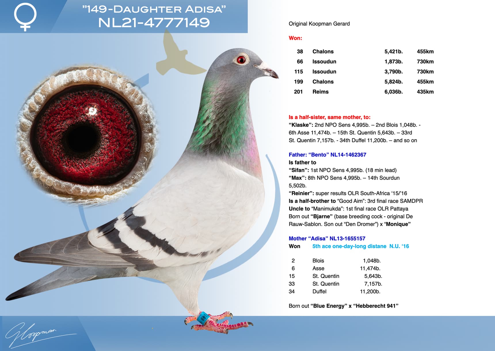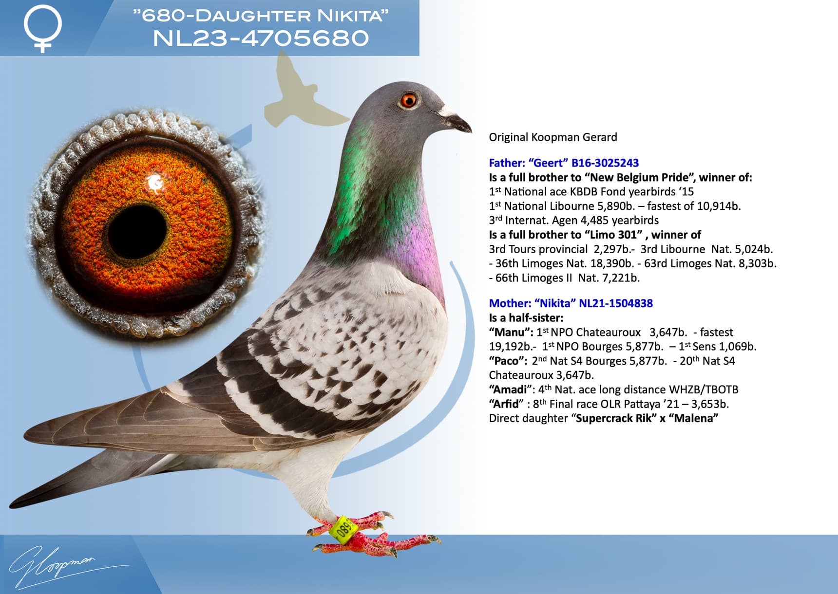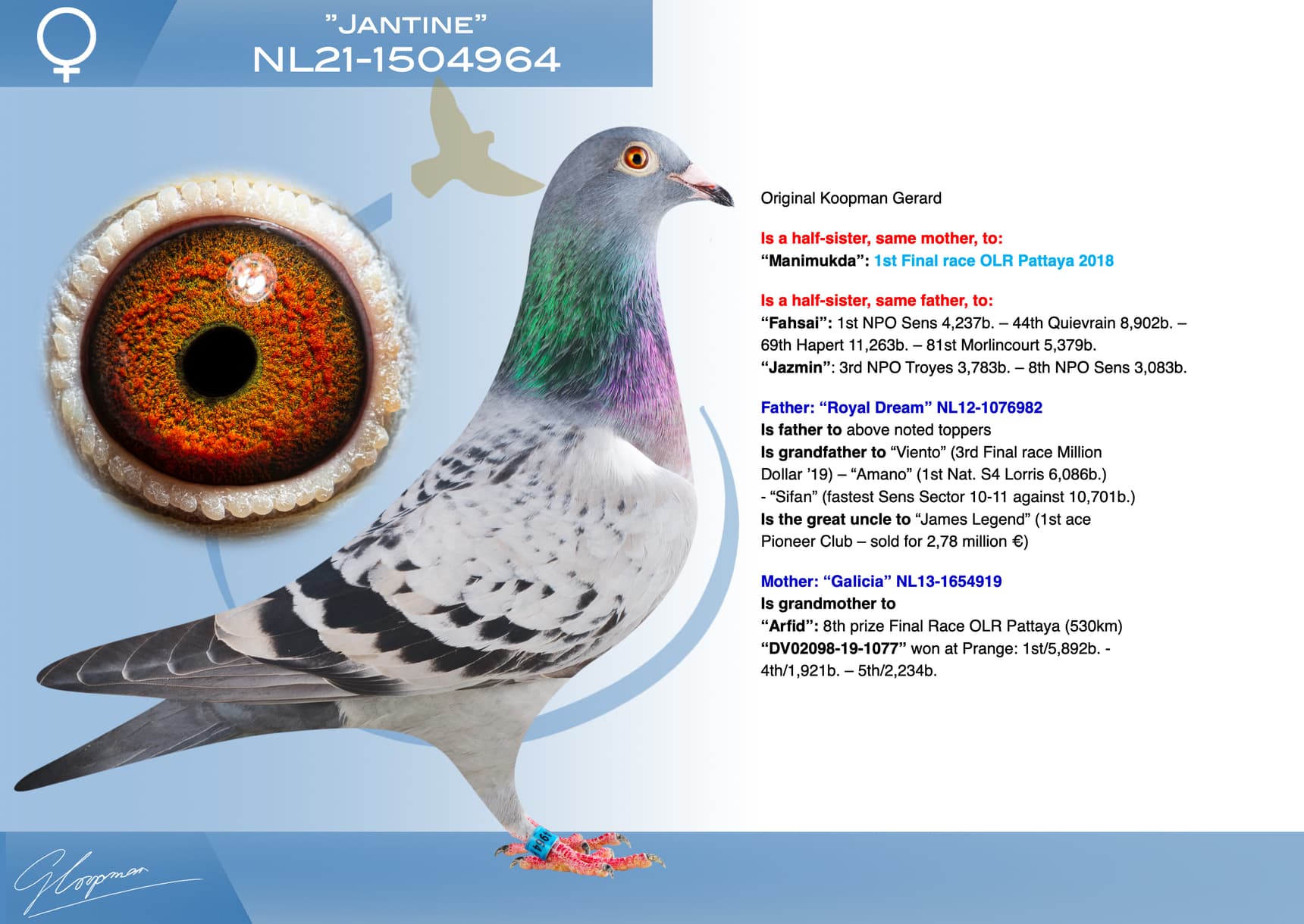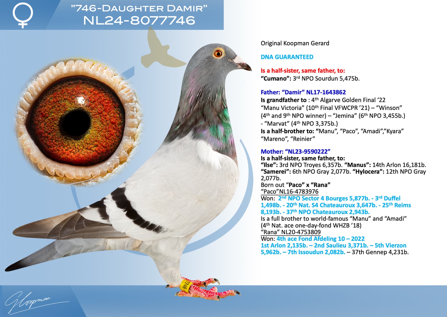 Direct daughter Olympiad bird “Ermerveen’s Hope” x “Young Dream” (9th Orleans 10,825b. – 15th Ablis 13,020b. – 20th Boxtel 13,496b. – 26th Hannut 15,912b. – and so on)