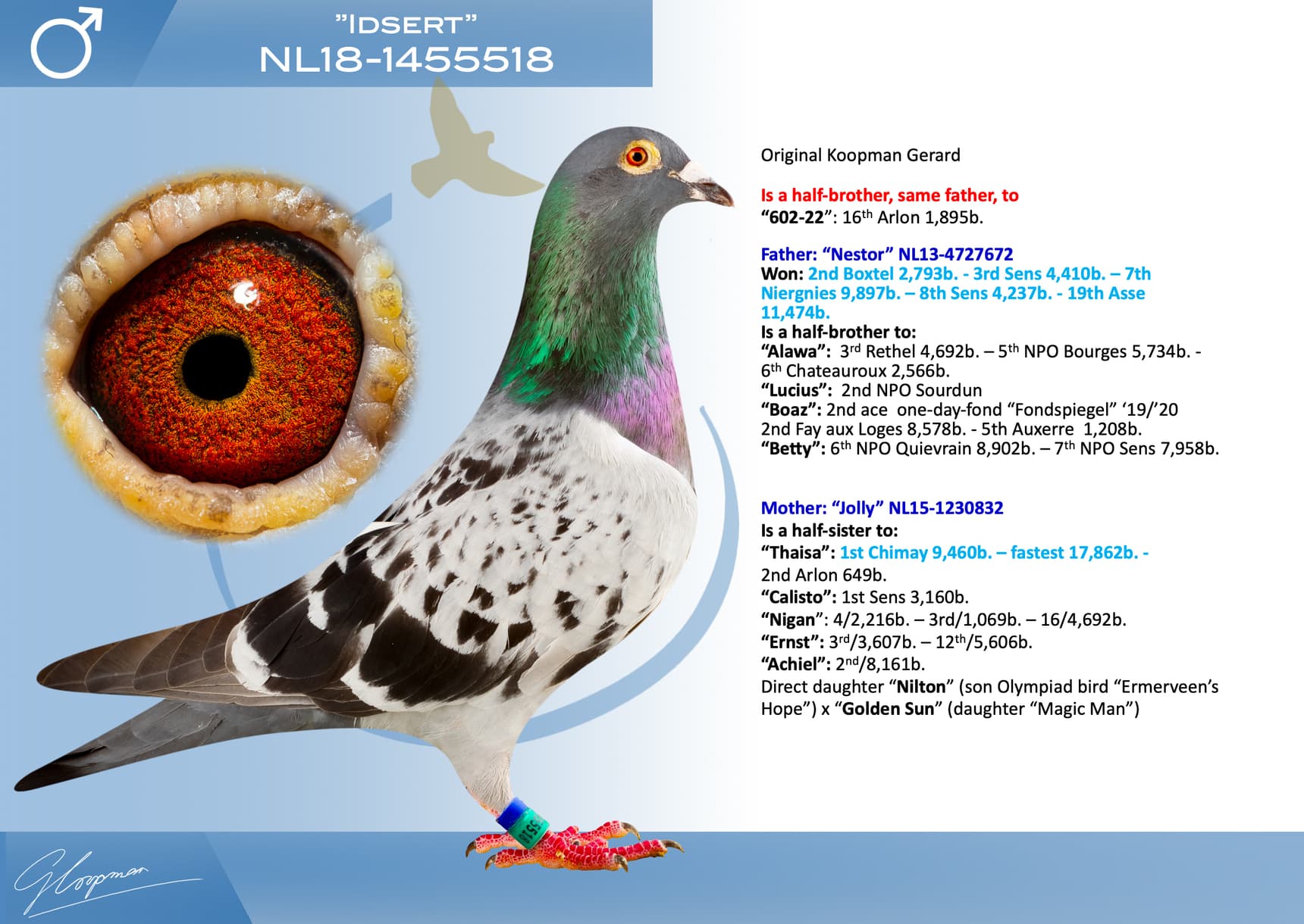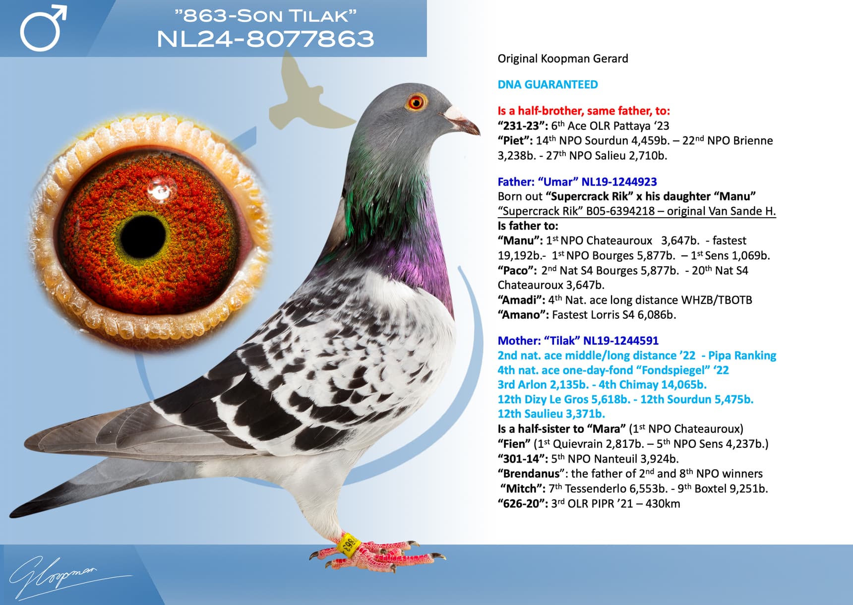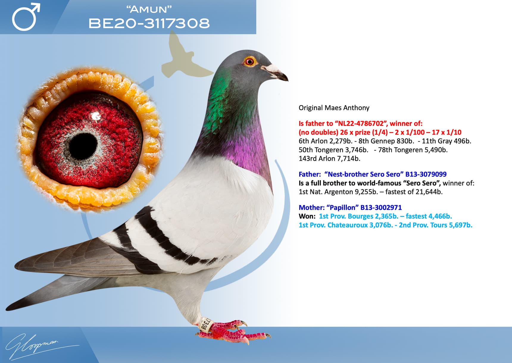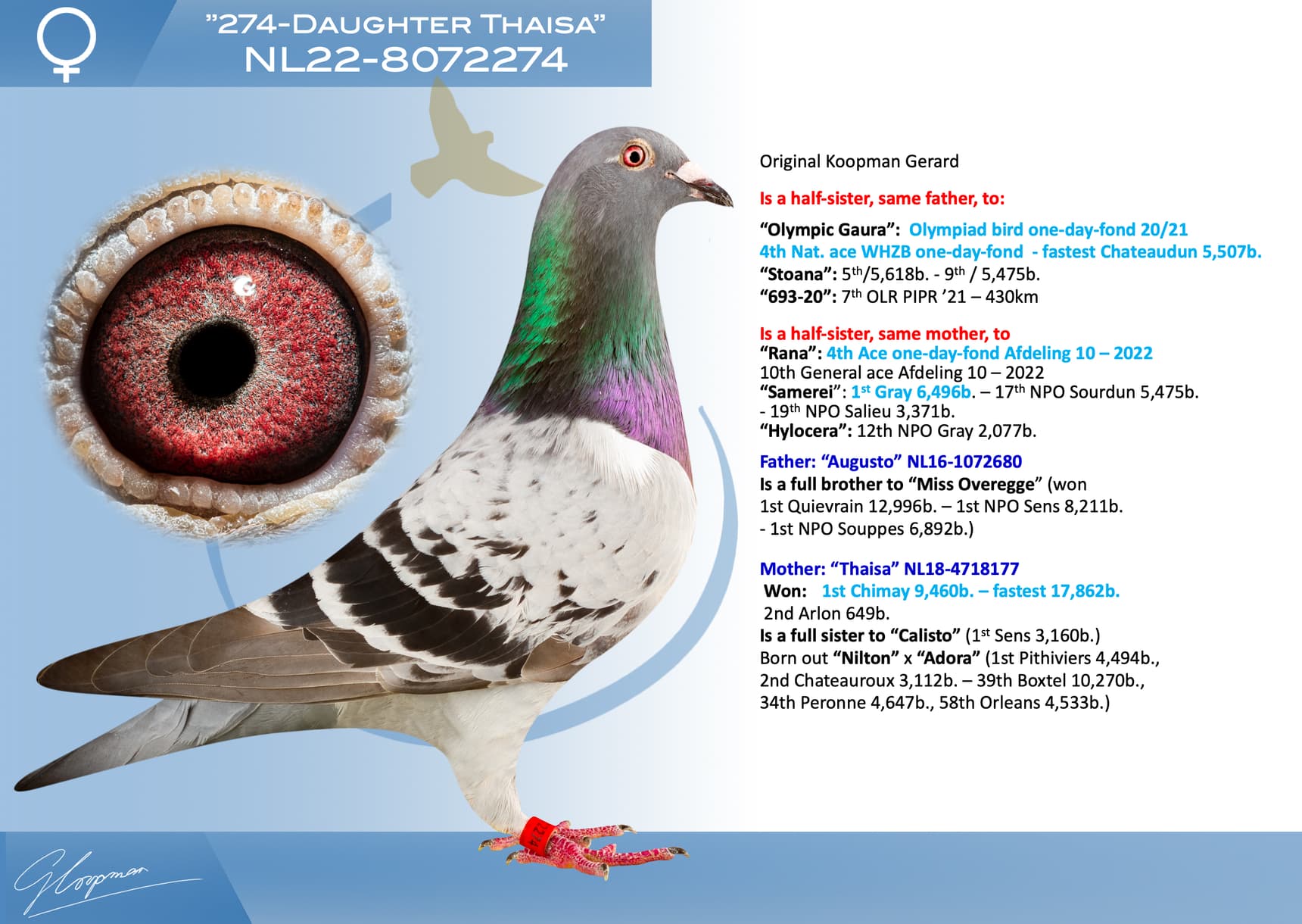 Direct son “Champion” (1st Prov. and 8th Nat. Souillac 8,327b. – base breeder) x 1st ace bird “Lici”