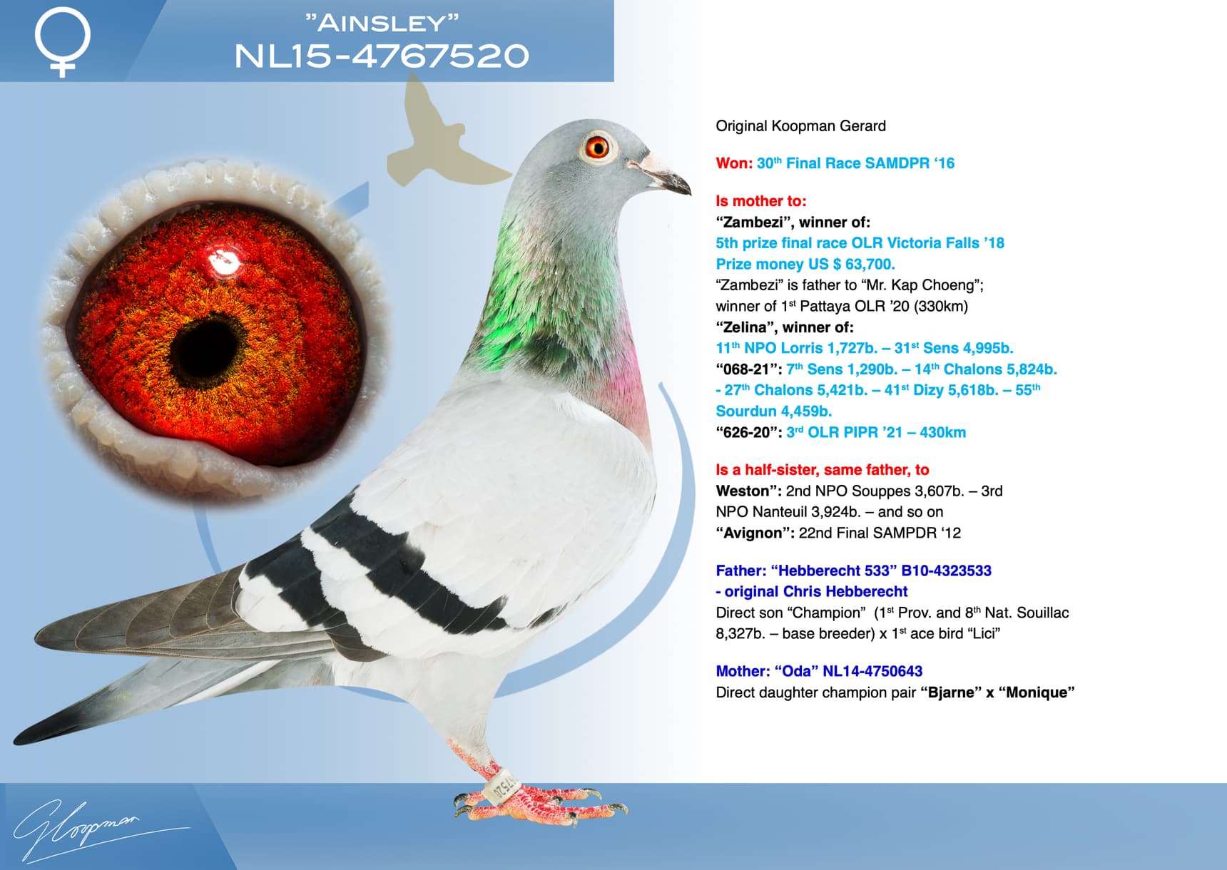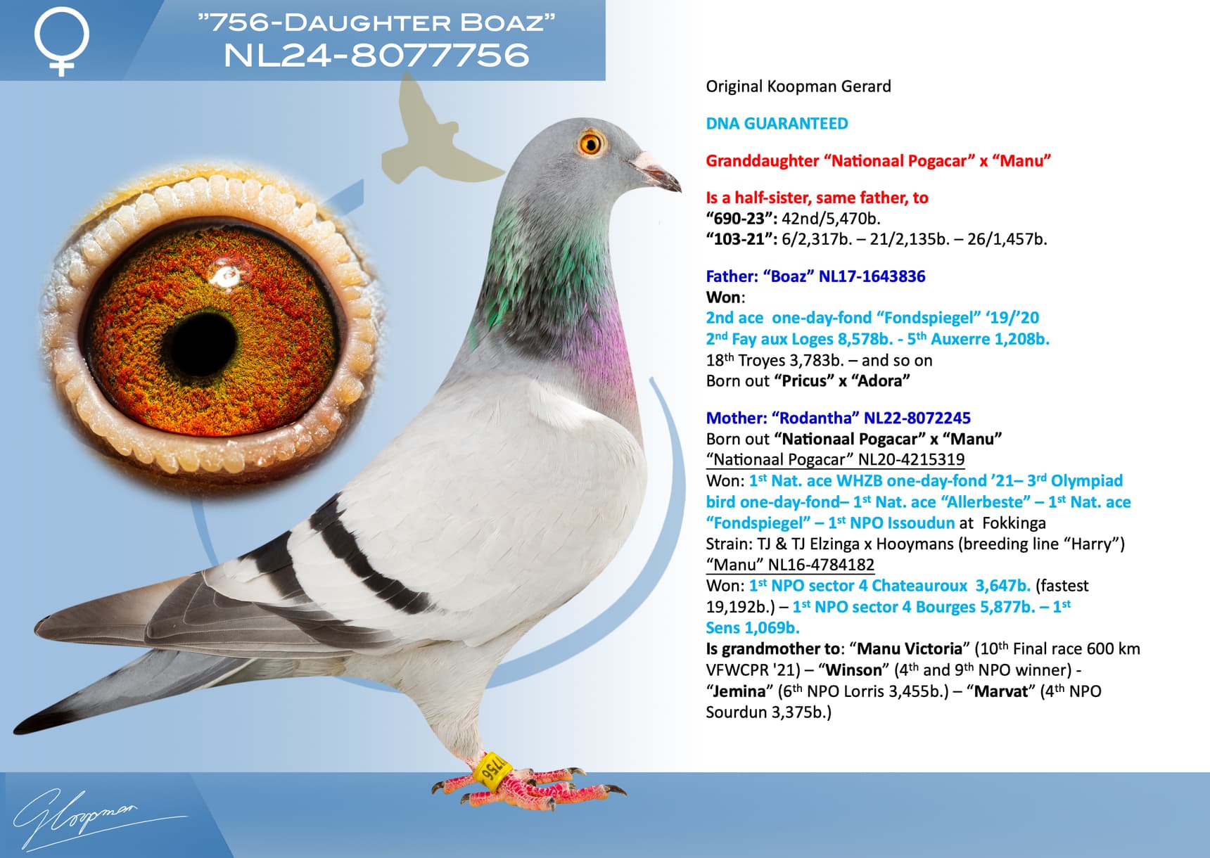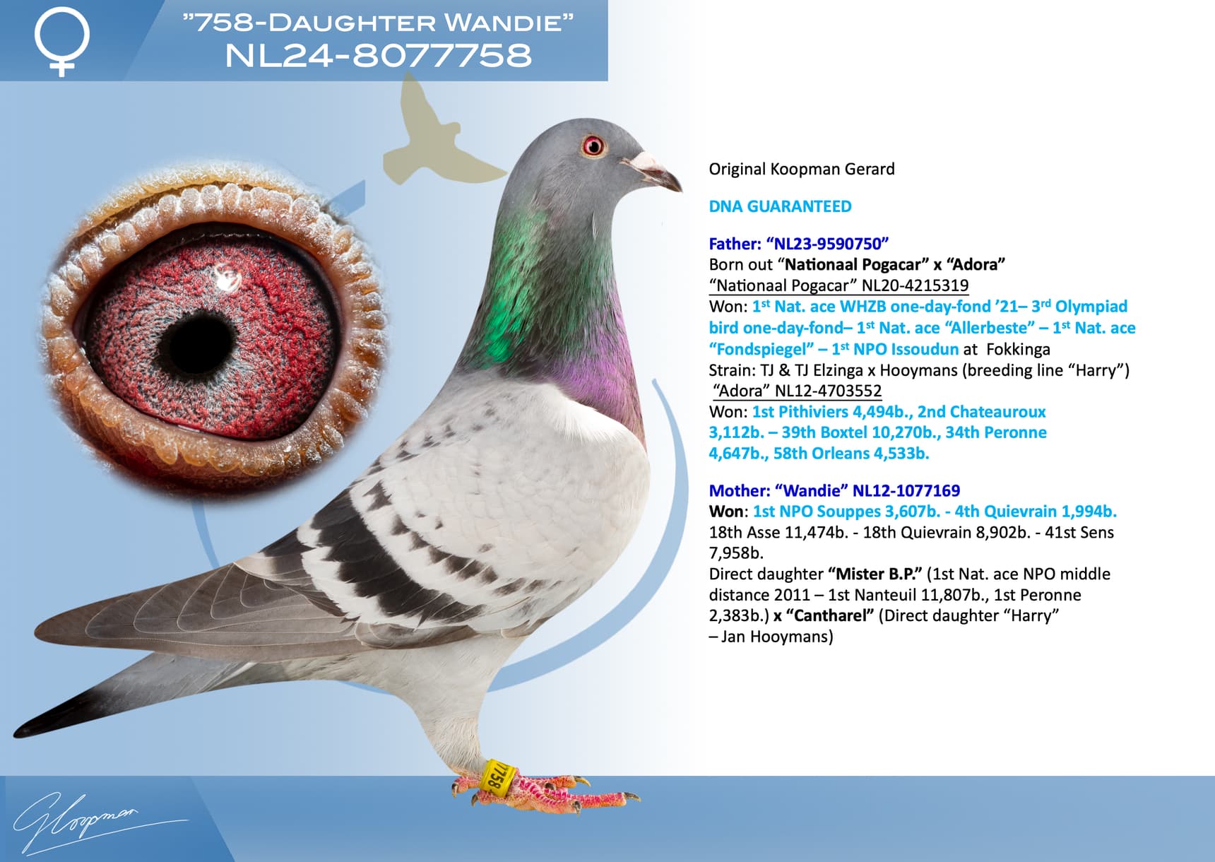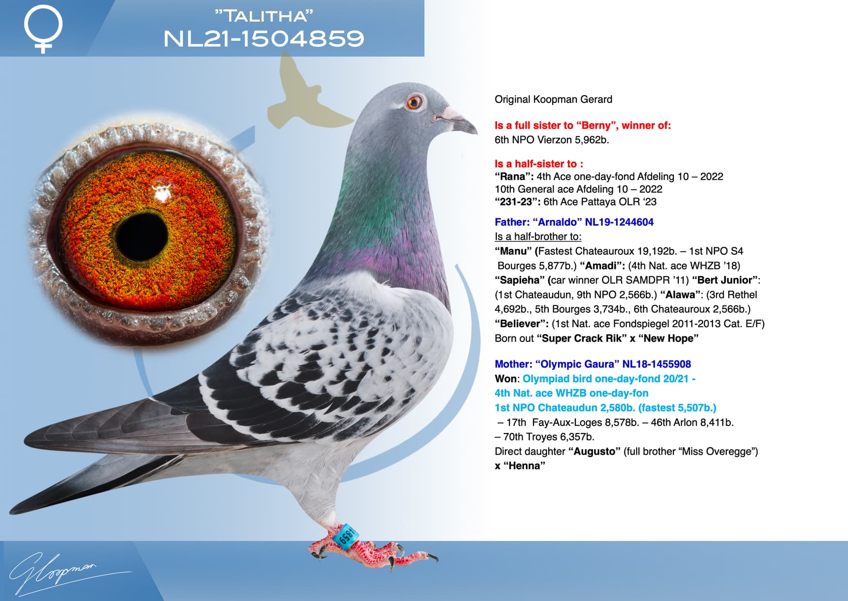 Direct son “Champion” (1st Prov. and 8th Nat. Souillac 8,327b. – base breeder) x 1st ace bird “Lici”