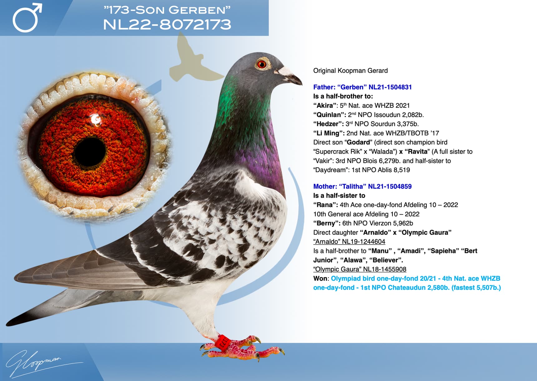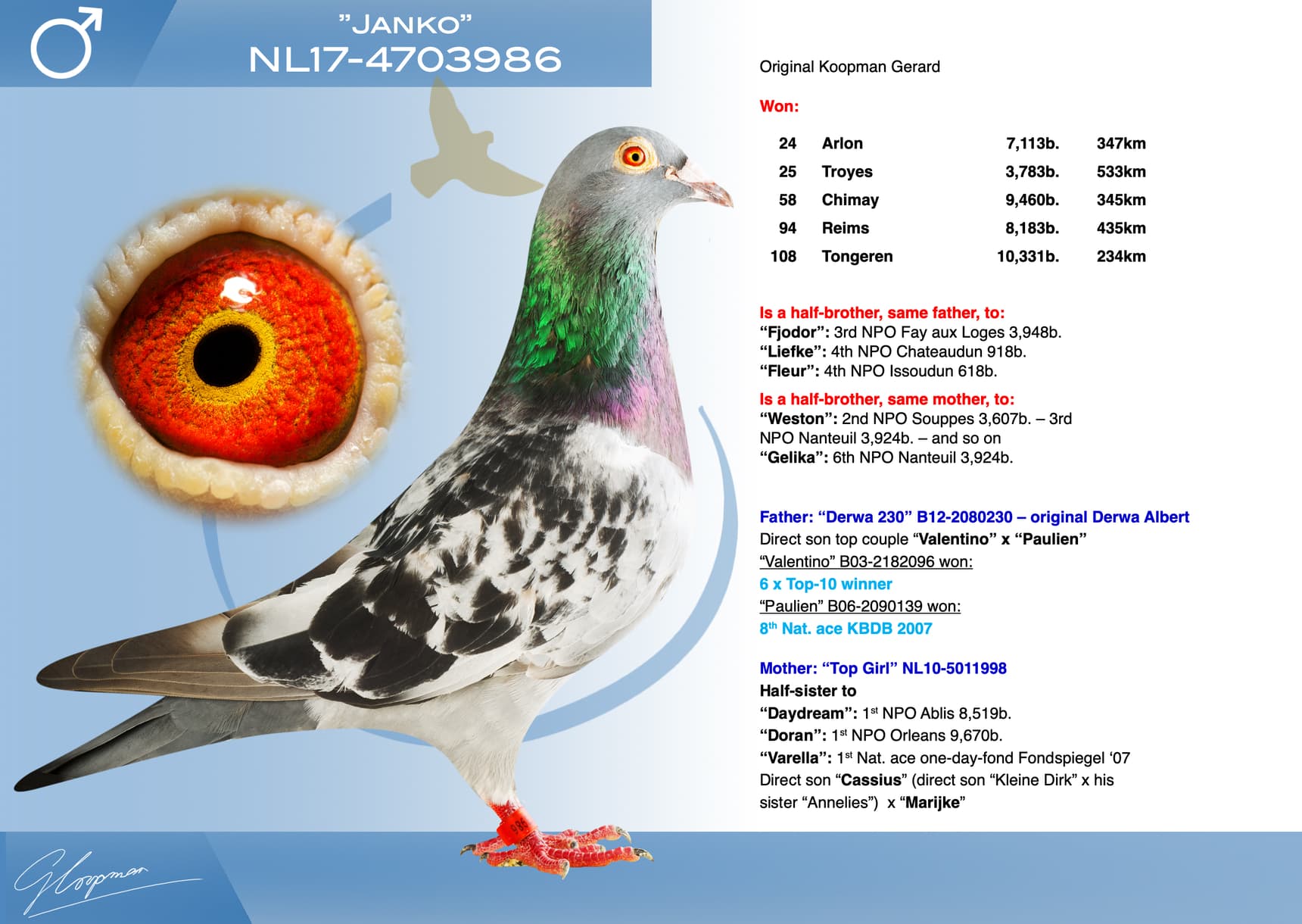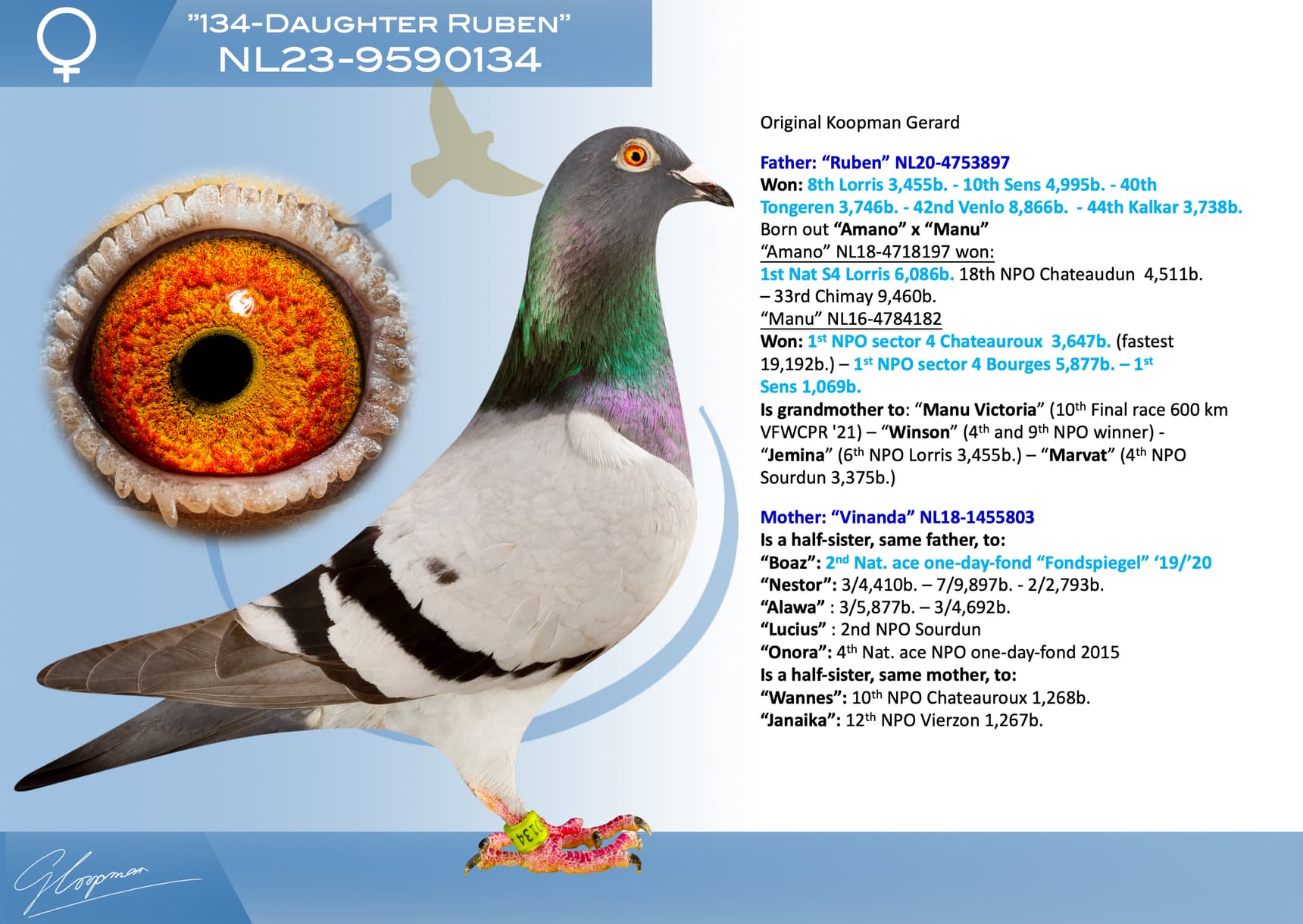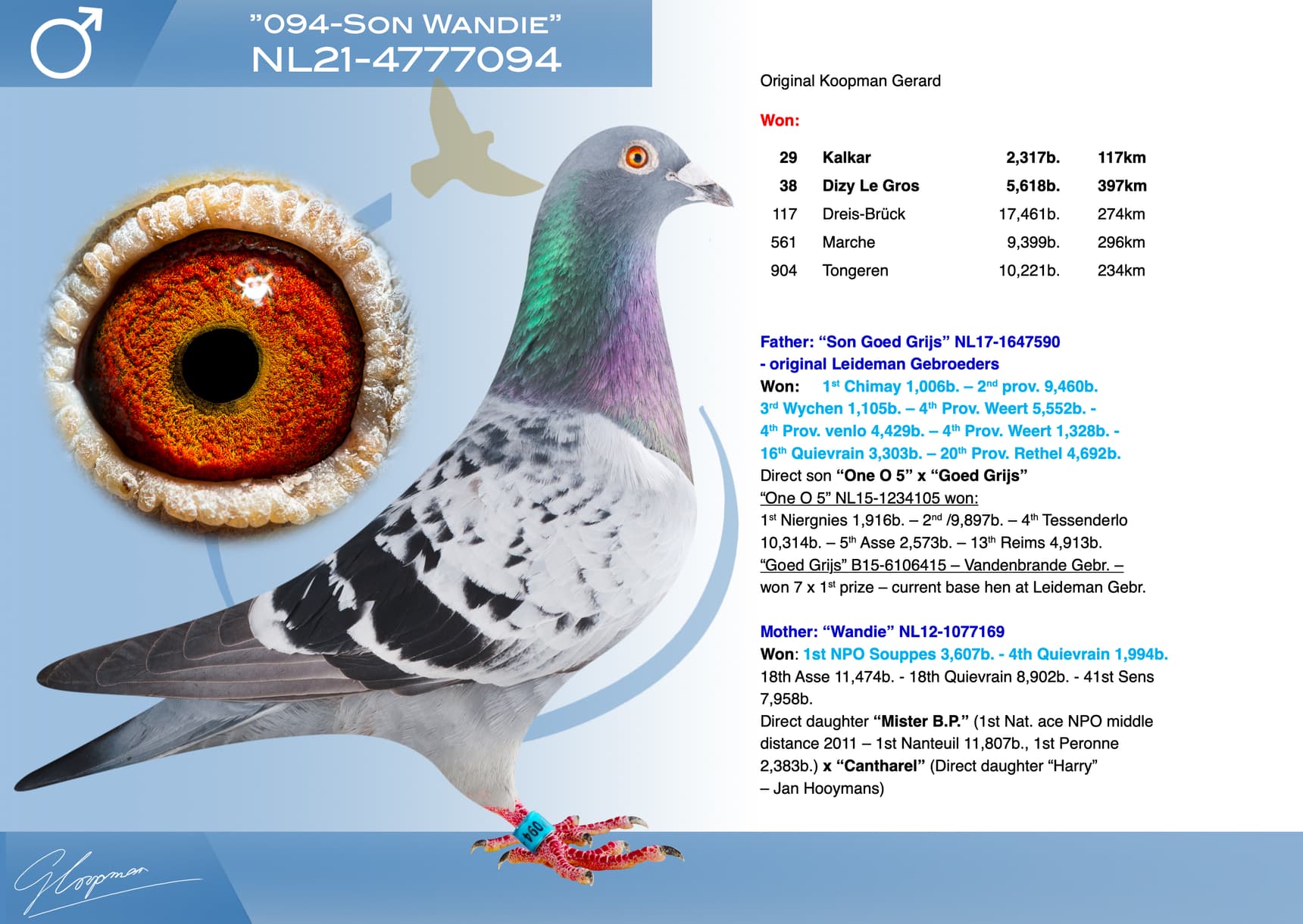 In total, Gerard is auctioning 623 birds. 153 will be sold in 2 public auctions (organization Sportblad De Duif) and 470 Koopman birds will be offered during 4 days (9-10-11 and 12 December) on internet auction Pigeon Bids (organization www.herbots.be.)