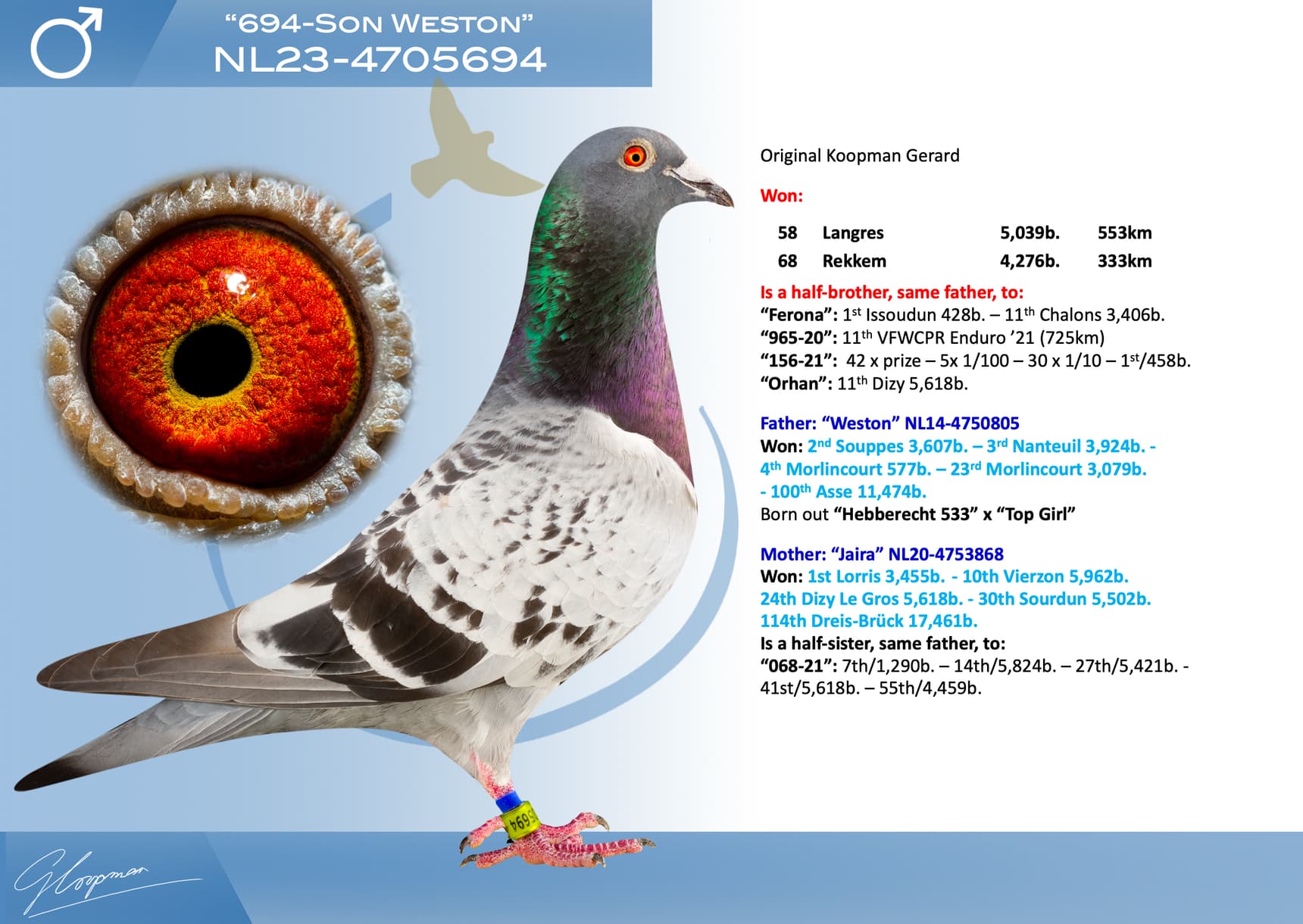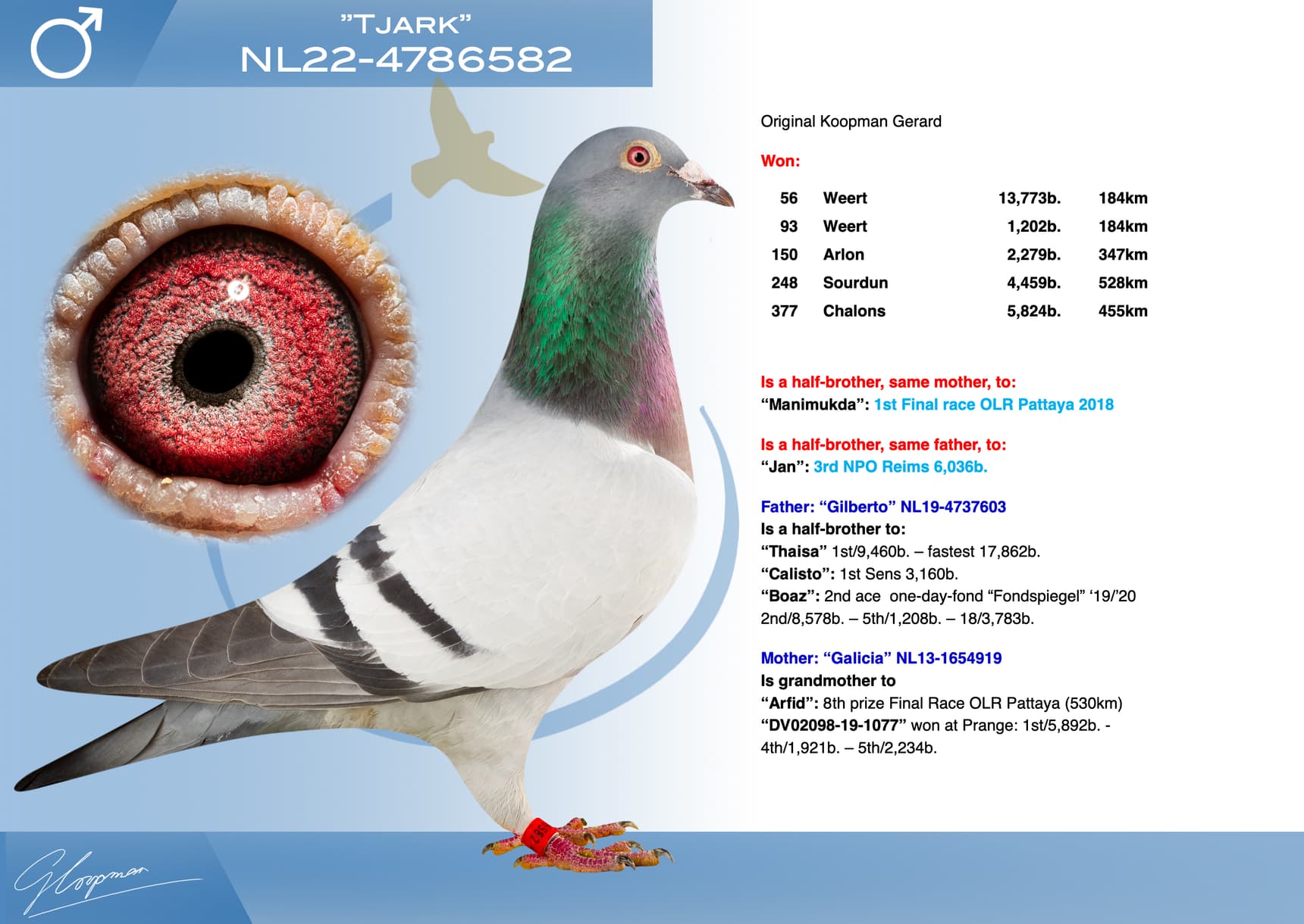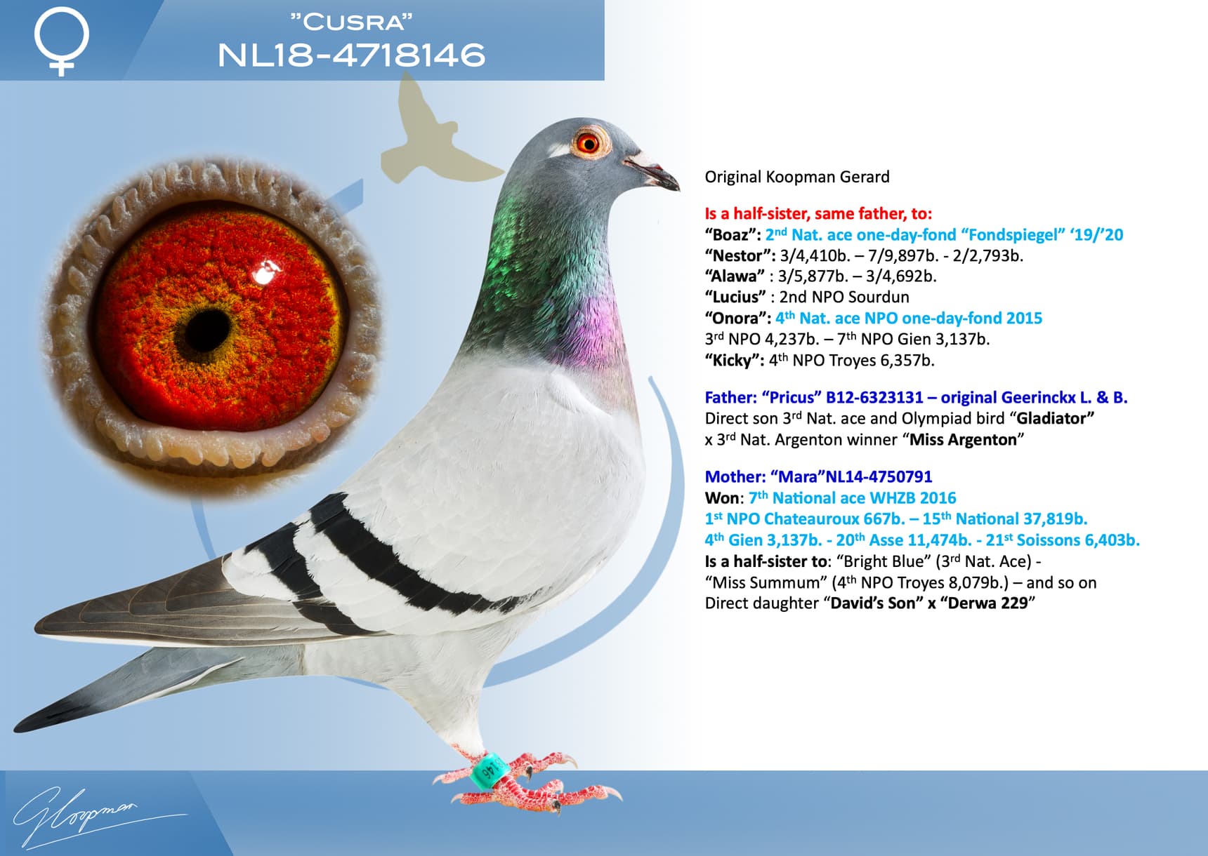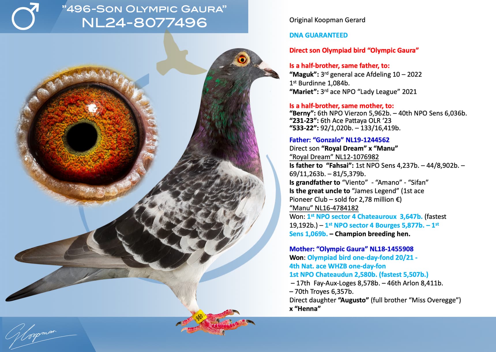 In total, Gerard is auctioning 623 birds. 153 will be sold in 2 public auctions (organization Sportblad De Duif) and 470 Koopman birds will be offered during 4 days (9-10-11 and 12 December) on internet auction Pigeon Bids (organization www.herbots.be.)