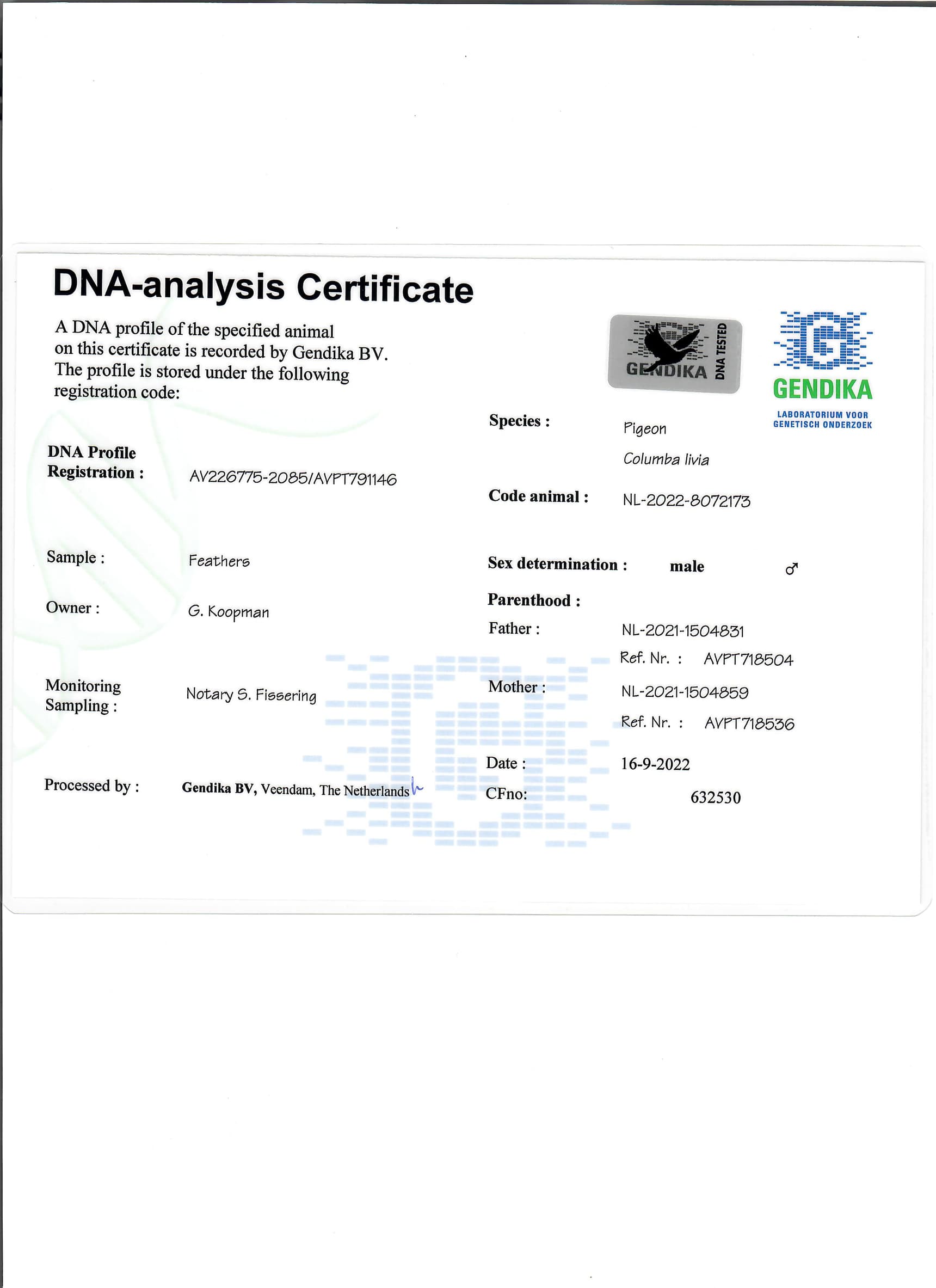 Direct son “Godard” (direct son champion bird “Supercrack Rik” x “Walada”) x “Ravita” (A full sister to “Vakir”: 3rd NPO Blois 6,279b. and half-sister to “Daydream”: 1st NPO Ablis 8,519)