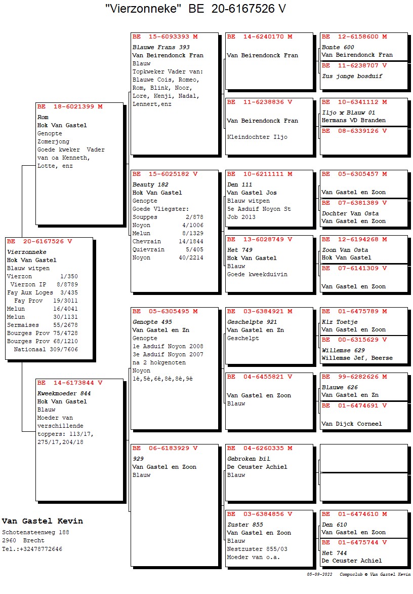 Direct son “Blauwe Frans 393” (original Frans Van Beirendonck) x “Beauty 182” (Won: 2nd Souppes 878b. – 4th Noyon 1,006b. - 8th Melun 1,329b. – 14th Chevrainvilliers 1,844b. - 5th Quievrain 405b.)