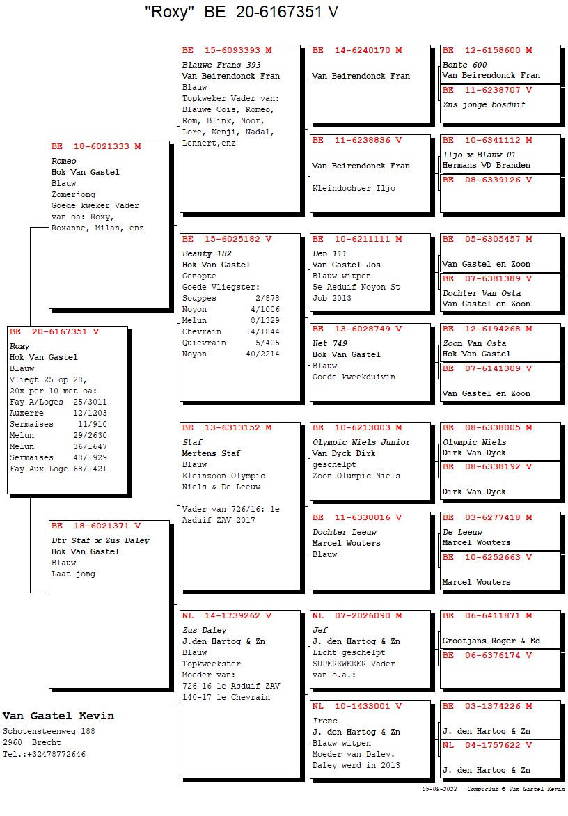 Born out “Blauwe Frans 393” (father to several toppers - original Frans Van Beirendonck) x “Beauty 182” (Won: 2nd Souppes 878b. – 4th Noyon 1,006b. - 8th Melun 1,329b. – 14th Chevrainvilliers 1,844b. - 5th Quievrain 405b. – 40th Noyon 2,214b.)