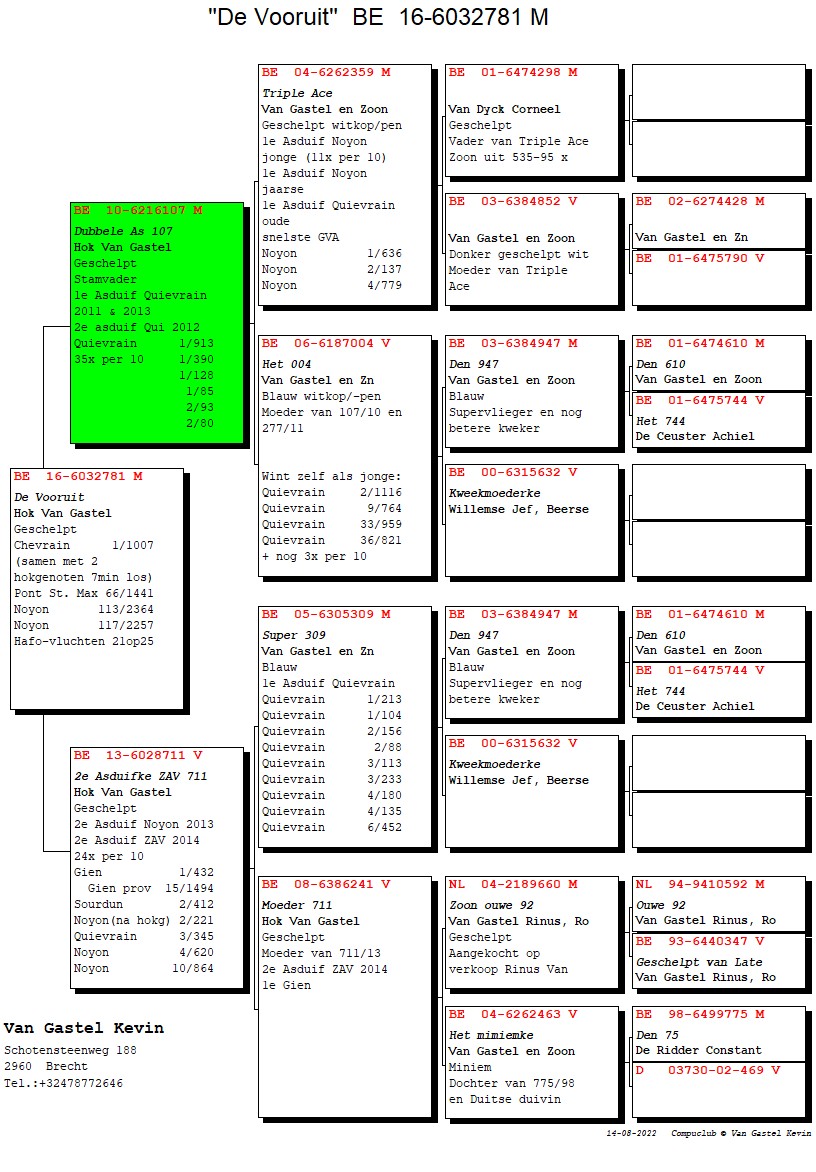 Won: 2nd ace Noyon ’13 – 2nd ace ZAV ’14 - 24 x 1/10 – 1st Gien 432b. – 2nd Sourdun 412b. - 2nd Noyon 221b. – 3rd Quievrain 345b. – 4th Noyon 620b. – 10th Noyon 864b.