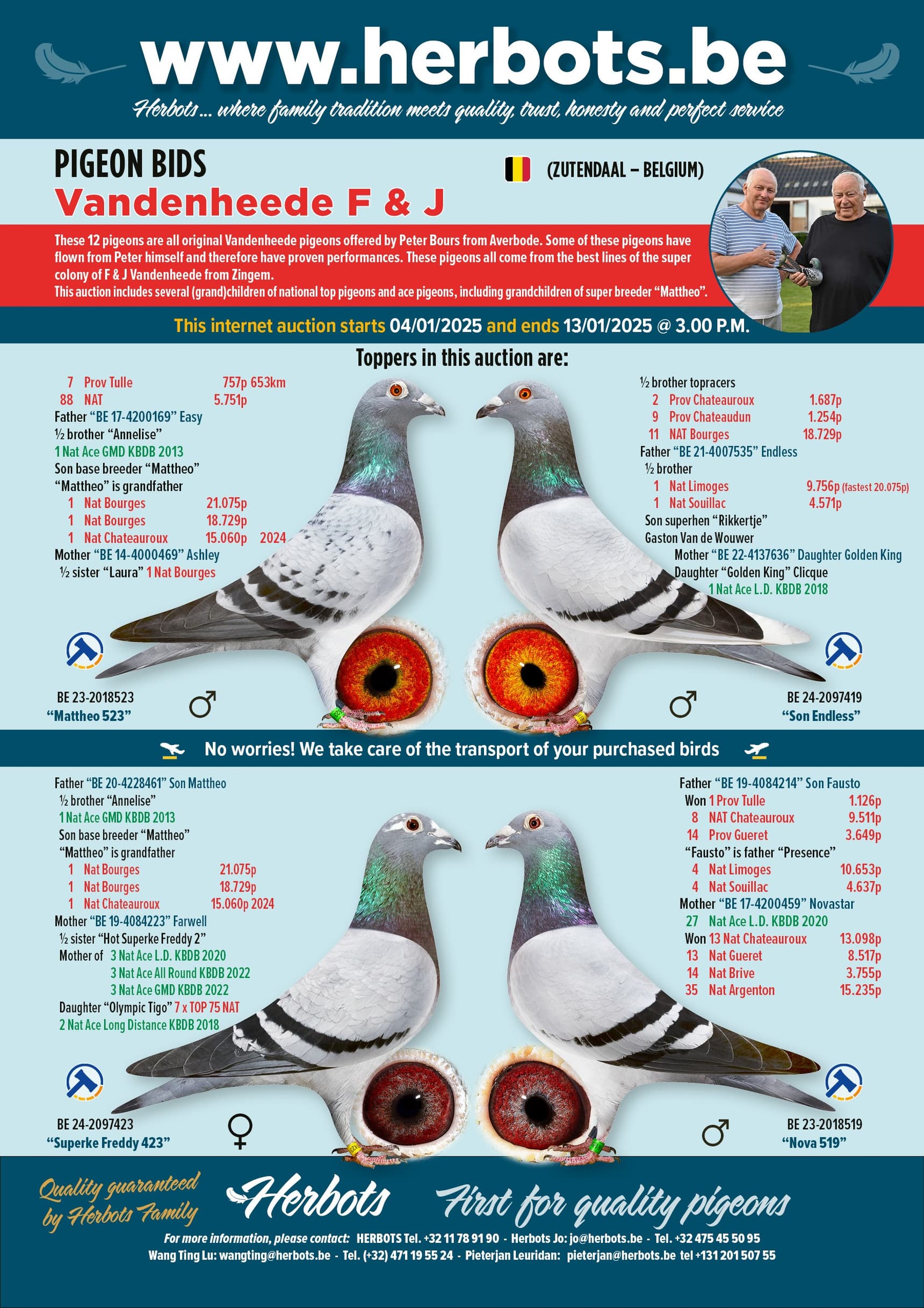 These 12 pigeons are all original Vandenheede pigeons offered by Peter Bours from Averbode.