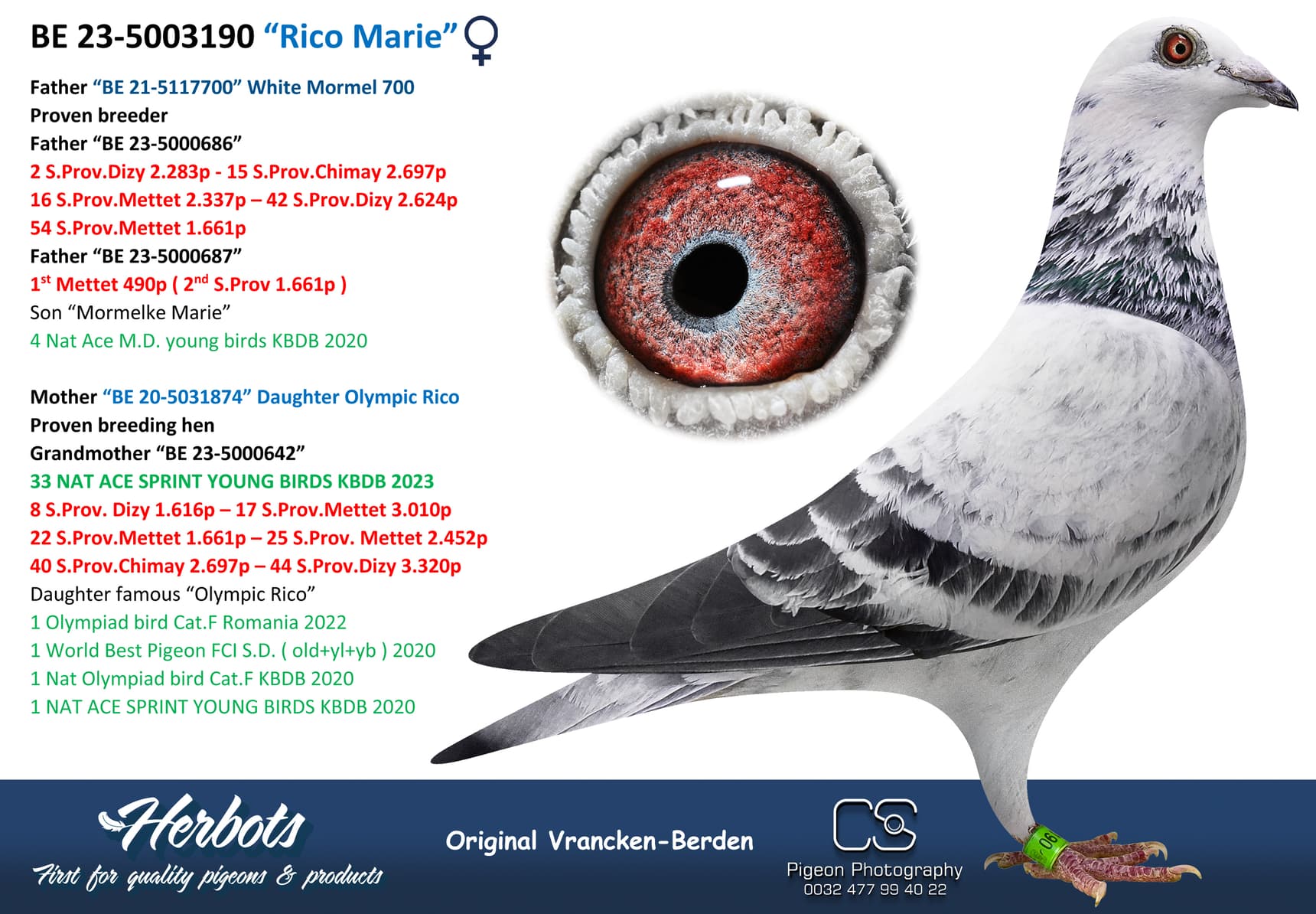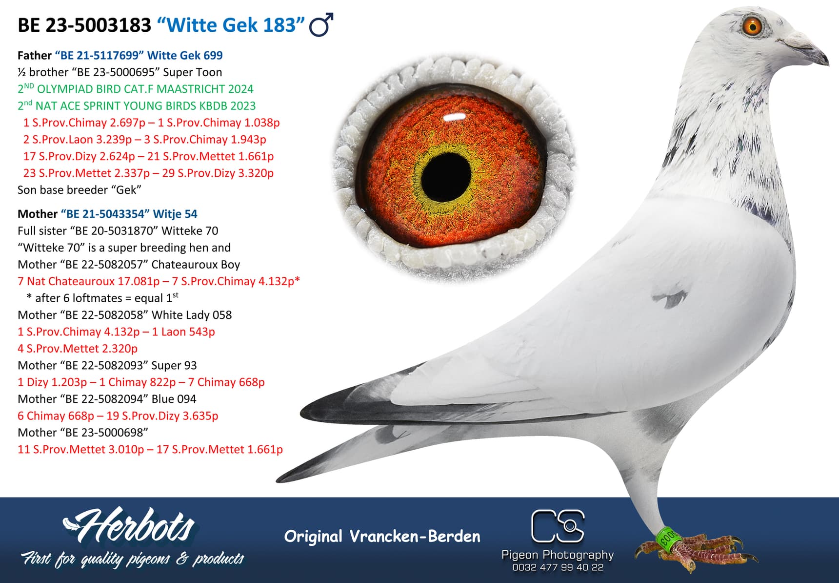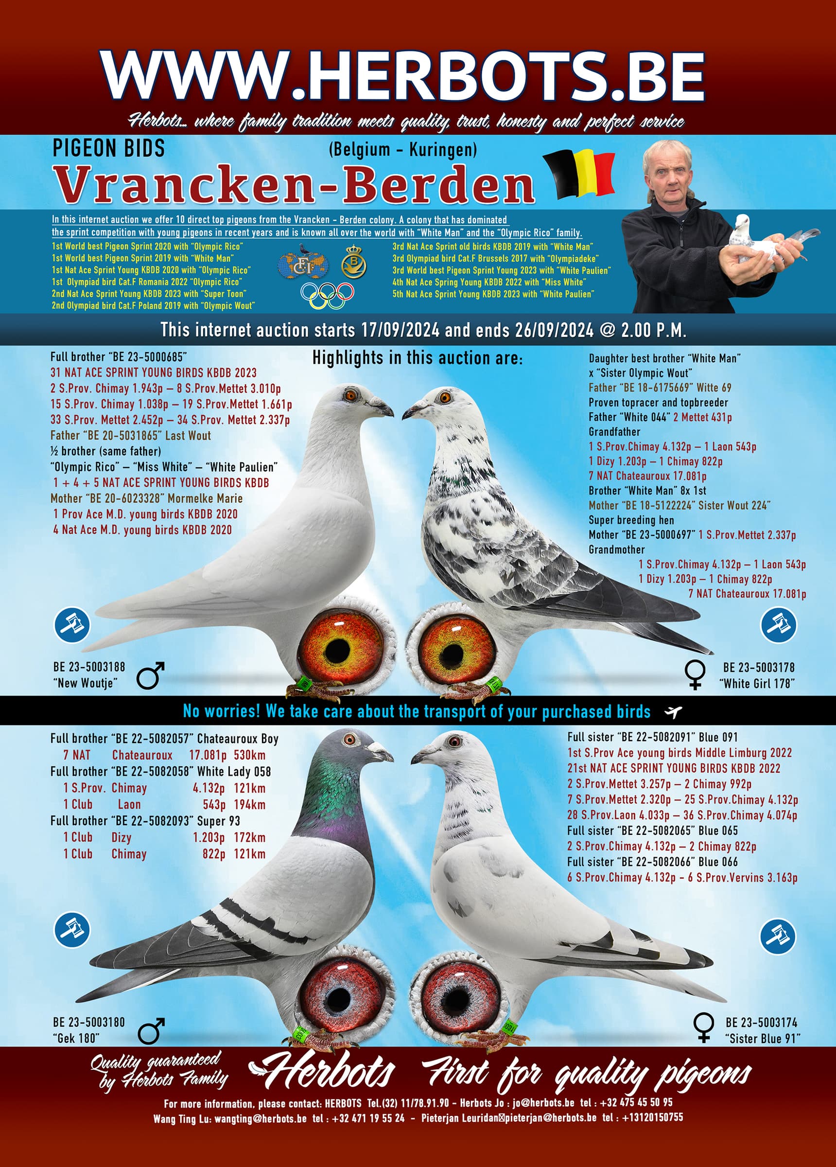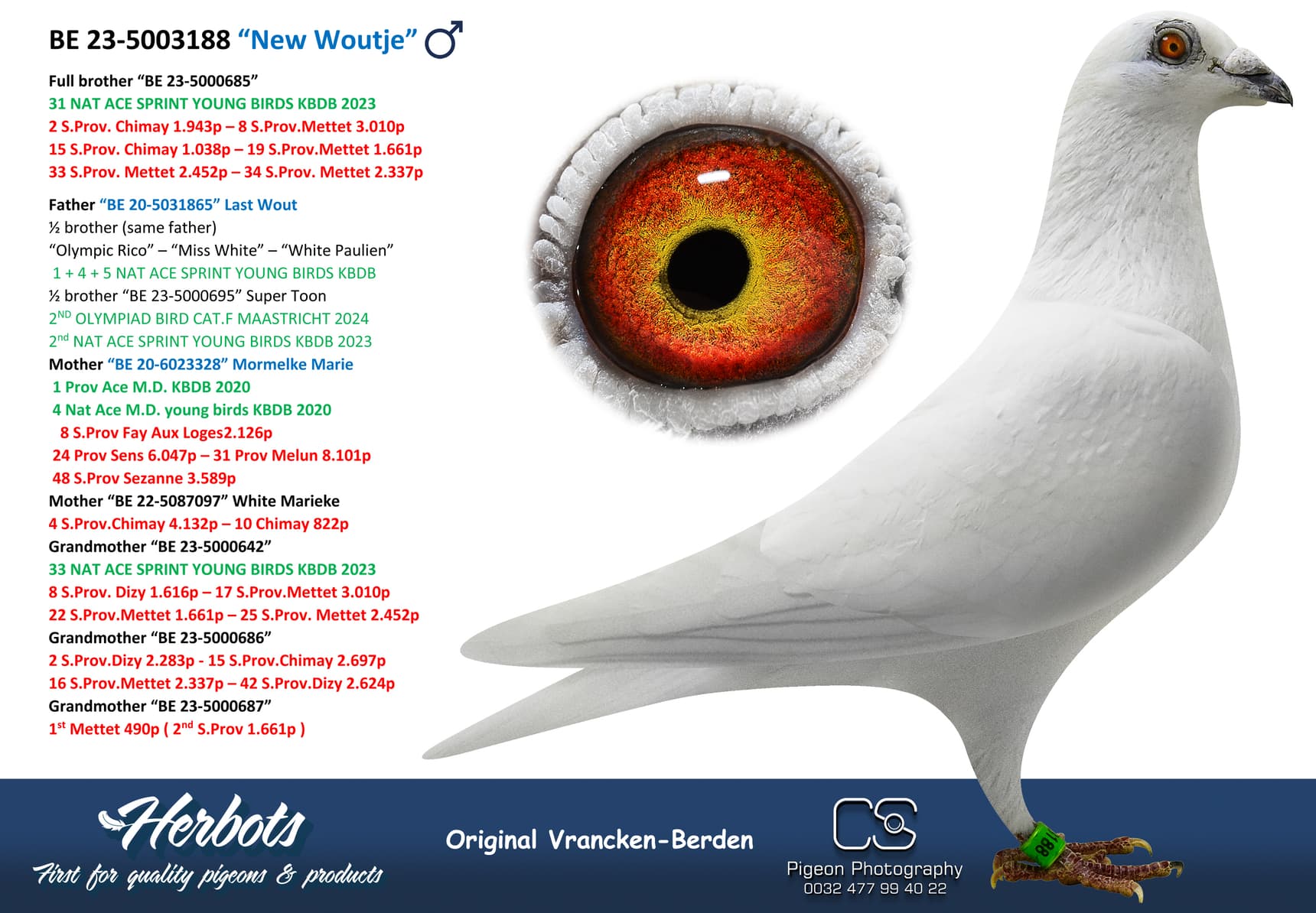 In this internet auction we offer 10 direct top pigeons from the Vrancken - Berden colony. A colony that has dominated the sprint competition with young pigeons in recent years and is known all over the world with “White Man” and the “Olympic Rico” family.