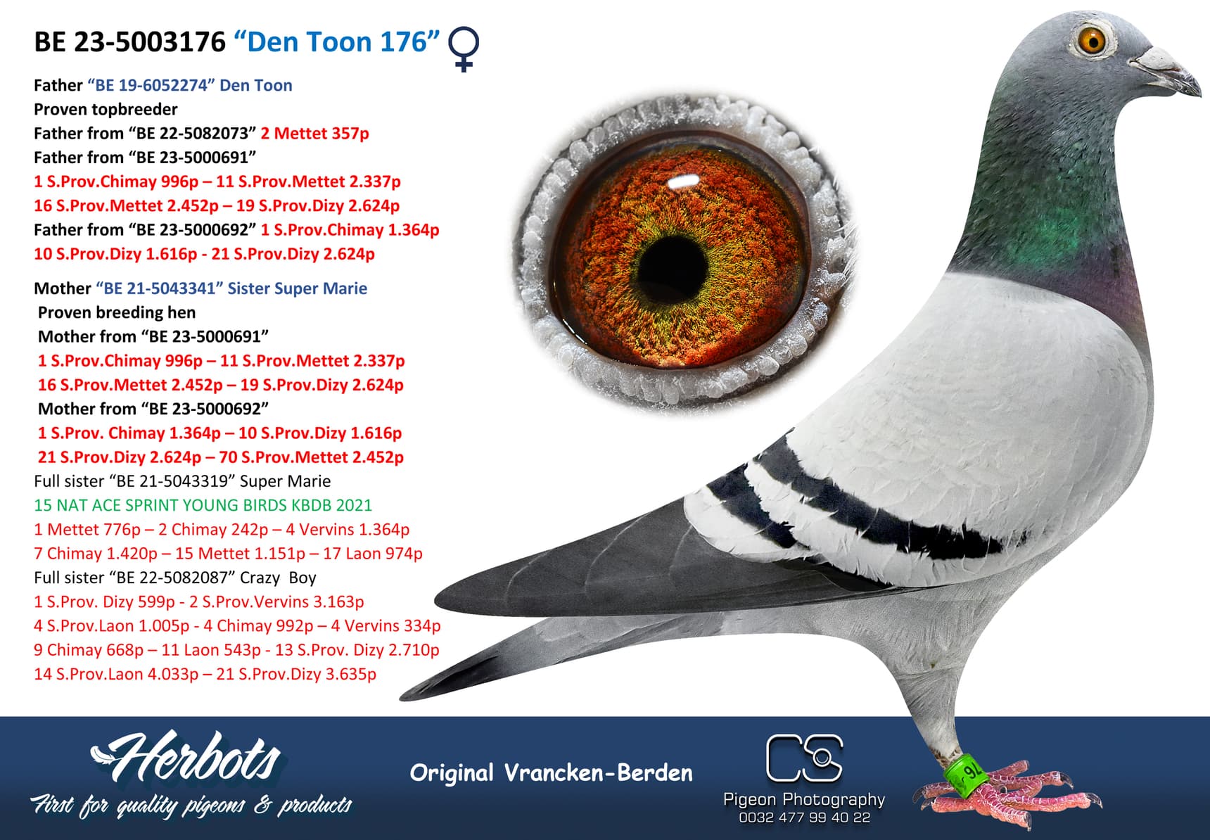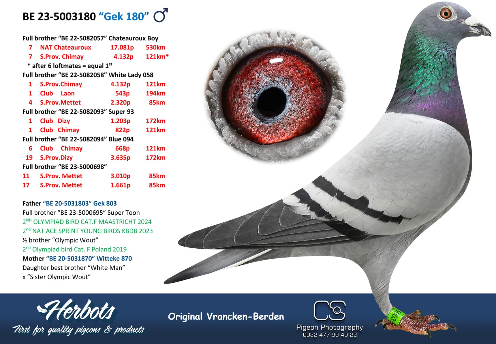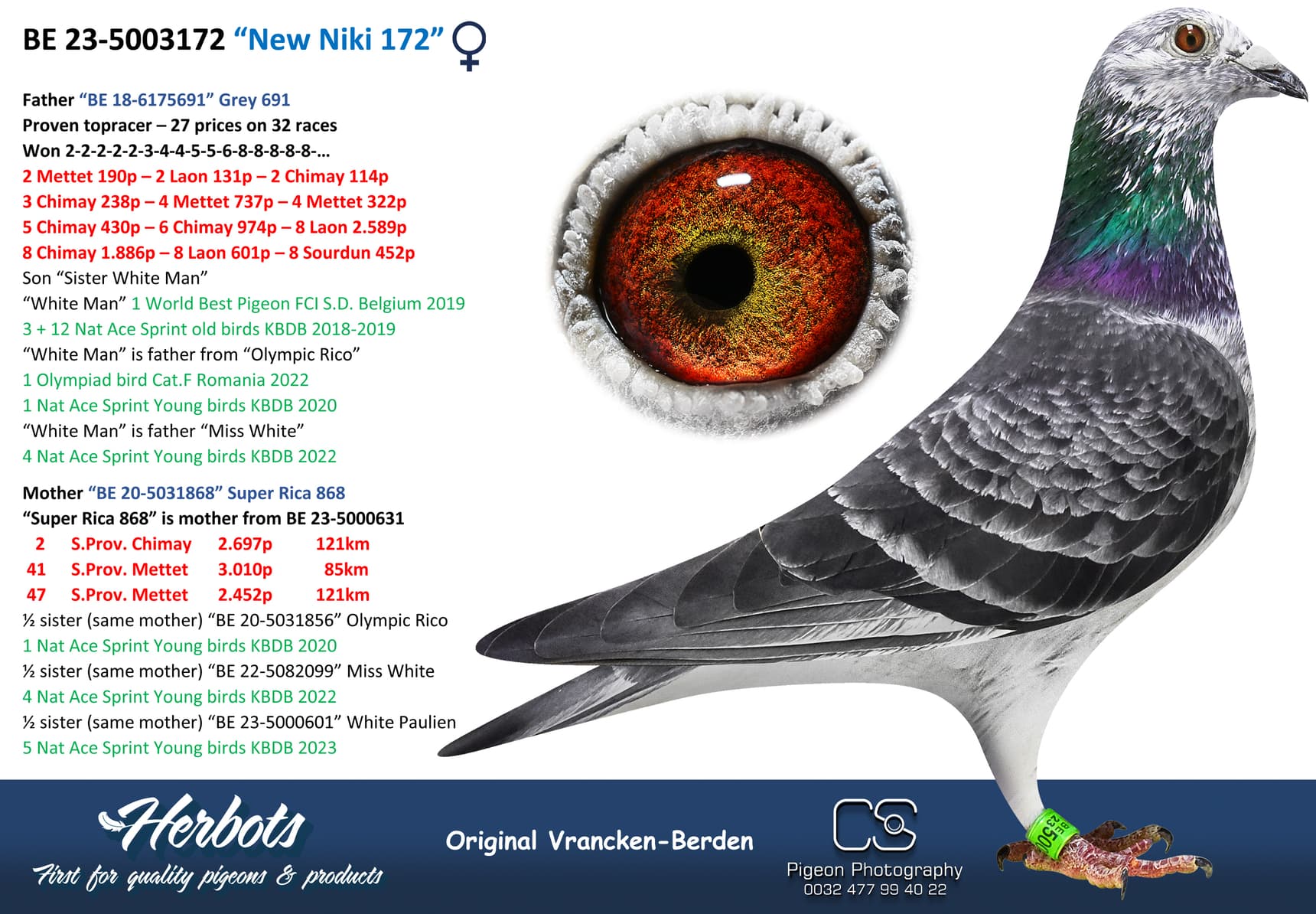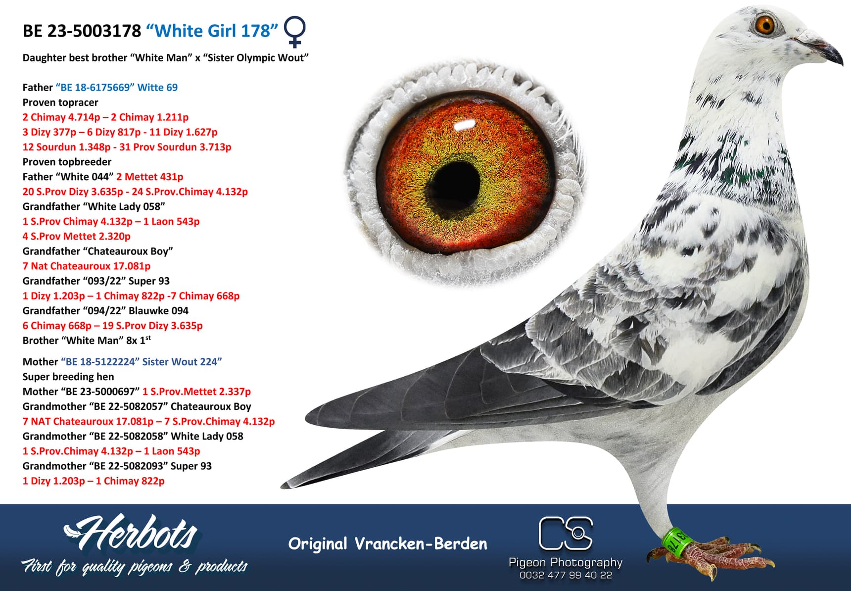 In this internet auction we offer 10 direct top pigeons from the Vrancken - Berden colony. A colony that has dominated the sprint competition with young pigeons in recent years and is known all over the world with “White Man” and the “Olympic Rico” family.