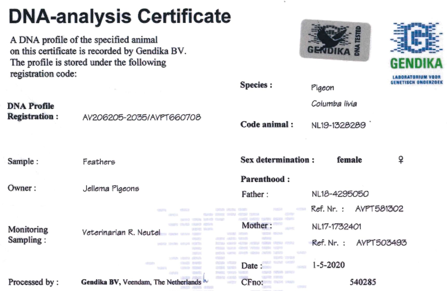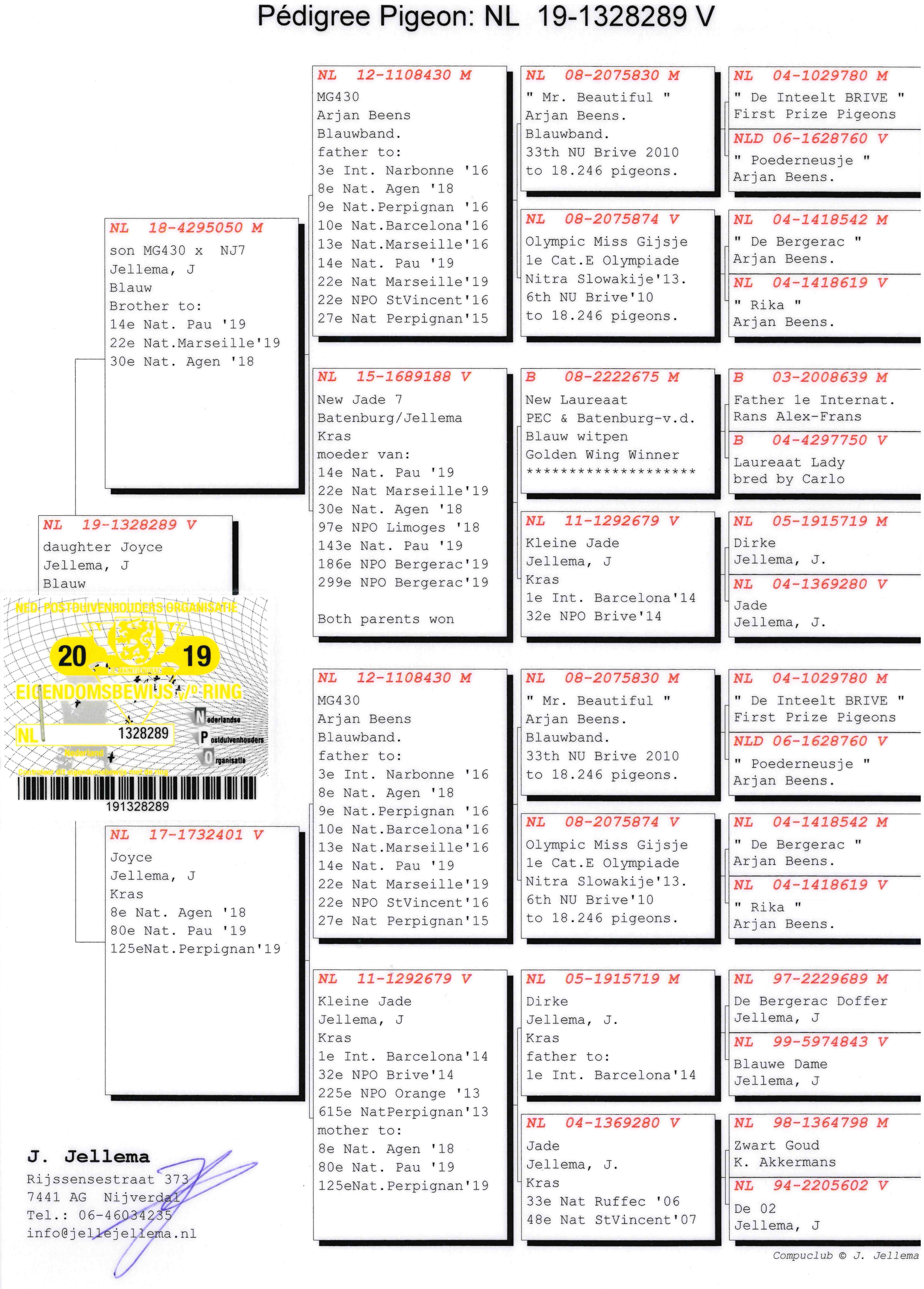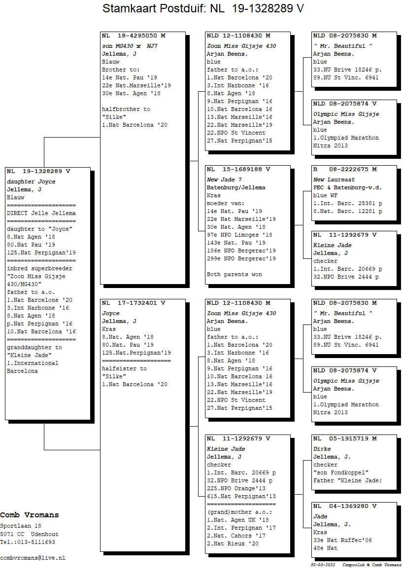 Born out “Son Miss Gijsje 430” (NL12-1108430) x “Kleine Jade” (1st Internat. Barcelona 20,669b.)