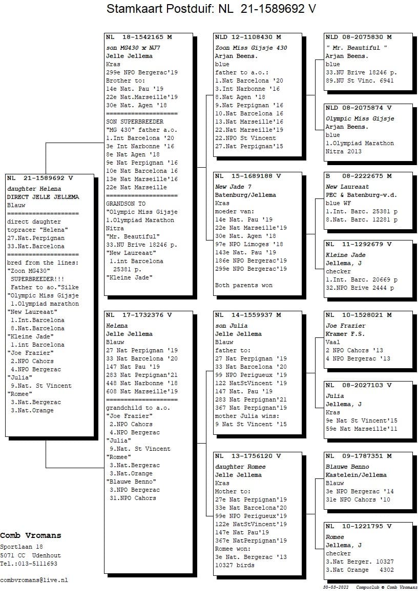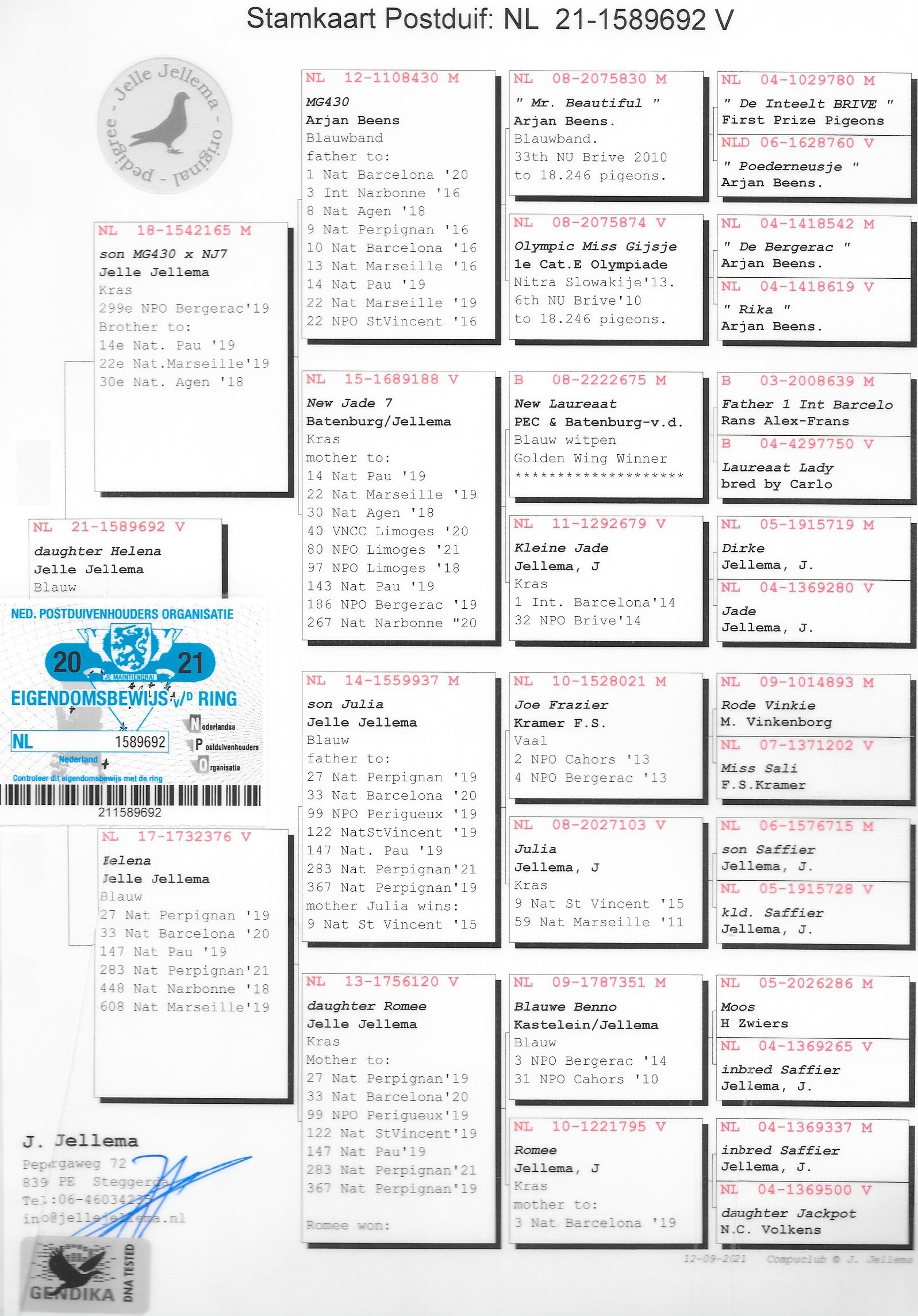 Direct son “Son Miss Gijsje 430” (NL12-1108430) x “New Jade 7” (daughter 1st Internat. Barcelona “New Laureaat” x 1st Internat. Barcelona “Kleine Jade”)