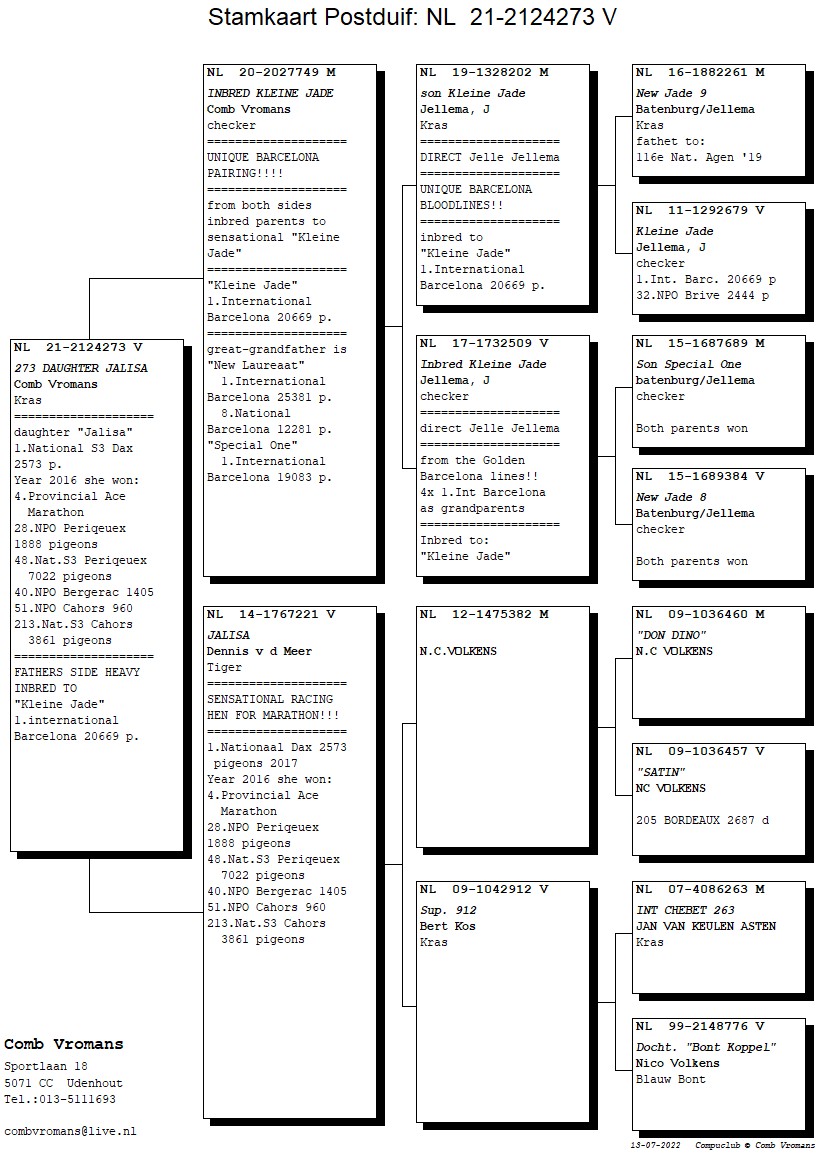 Born out “Son Kleine Jade” x “Inbred Kleine Jade” (4 x Internat. Barcelona winners as grandparents)
