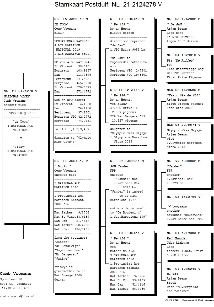 Won: 1st provincial ace Marathon “Brabant 2000” – ‘16 - 3rd National ace Marathon 2016 – 9th Nat. Tarbes 8,706b. – 33rd Nat. St. Vincent 6,169b. – 51st Nat. Dax 4,616b. – 58th Nat. Tarbes 4,760b.