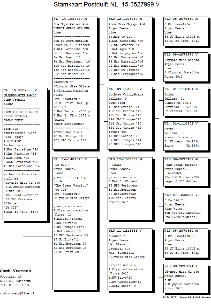 Direct son “Son Miss Gijsje 430” (Is father to winners of 1st Nat. Barcelona ’20 – 3rd Internat Narbonne ’16 – 8th Nat. Agen ’18 – 9th Nat. Perpignan ’16 – 10th Nat. Barcelona ’16 – 13th Nat. Marseille ’16 – 22nd Nat. Marseille ’19 - 27th Nat. Perpignan ’15) x “Daughter Orion” (won 10th Nat. Orange)