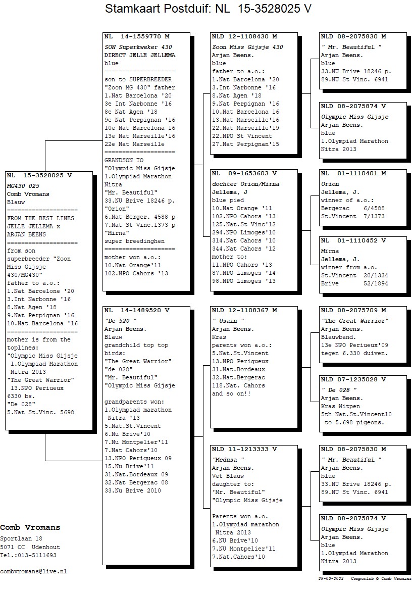 Direct son “Son Miss Gijsje 430” (Is father to winners of 1st Nat. Barcelona ’20 – 3rd Internat Narbonne ’16 – 8th Nat. Agen ’18 – 9th Nat. Perpignan ’16 – 10th Nat. Barcelona ’16 – 13th Nat. Marseille ’16 – 22nd Nat. Marseille ’19 - 27th Nat. Perpignan ’15) x “Daughter Orion” (won 10th Nat. Orange)