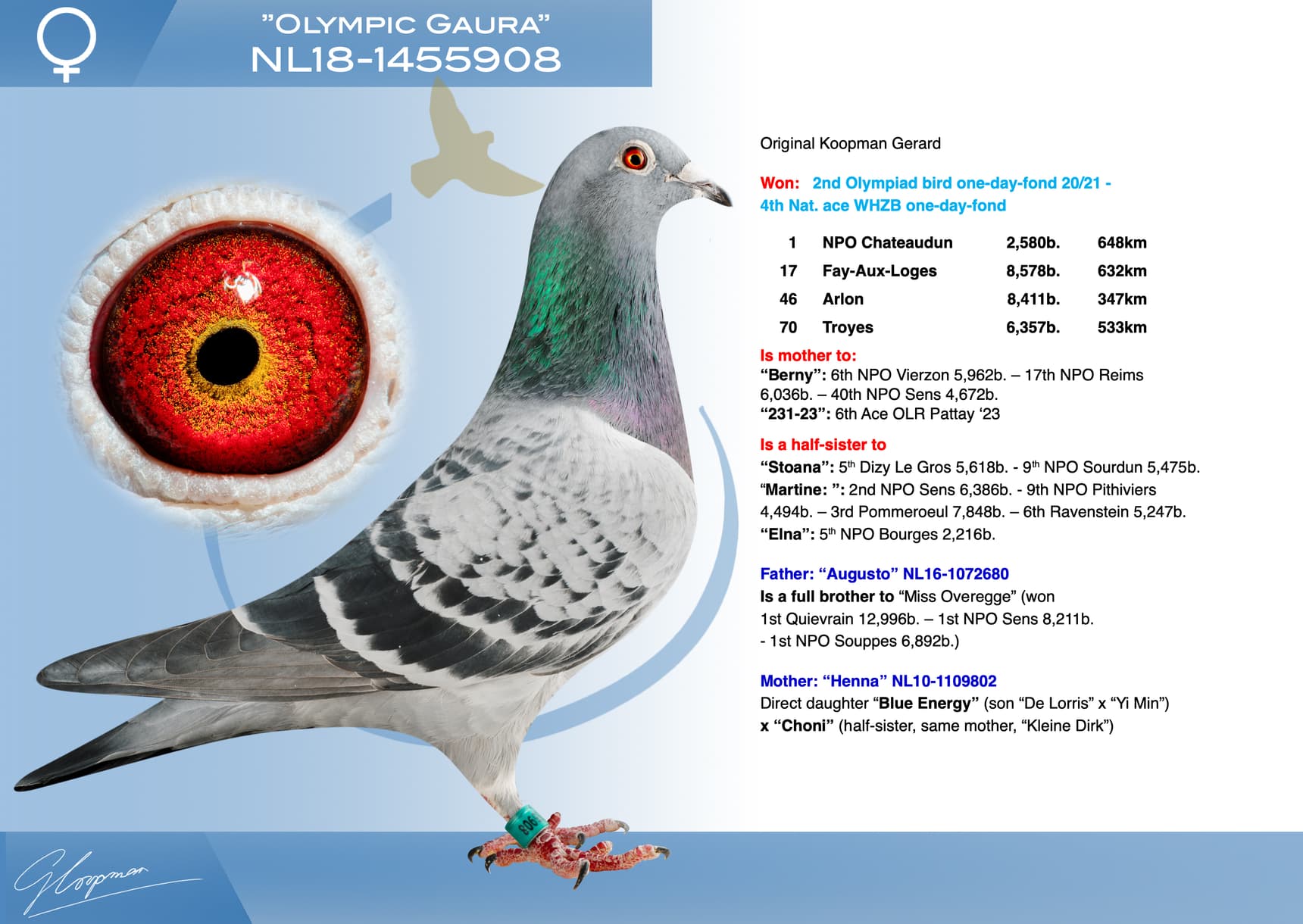 Direct son Olympiad bird Allround “Olympic Orlando” x “Amora” (1st St Quentin 3,479b. – 1st Orleans 1,929b. – 1st Niergnies 3,147b. – 1st Orleans 2,515b. – 1st Etampes 3,591b.)