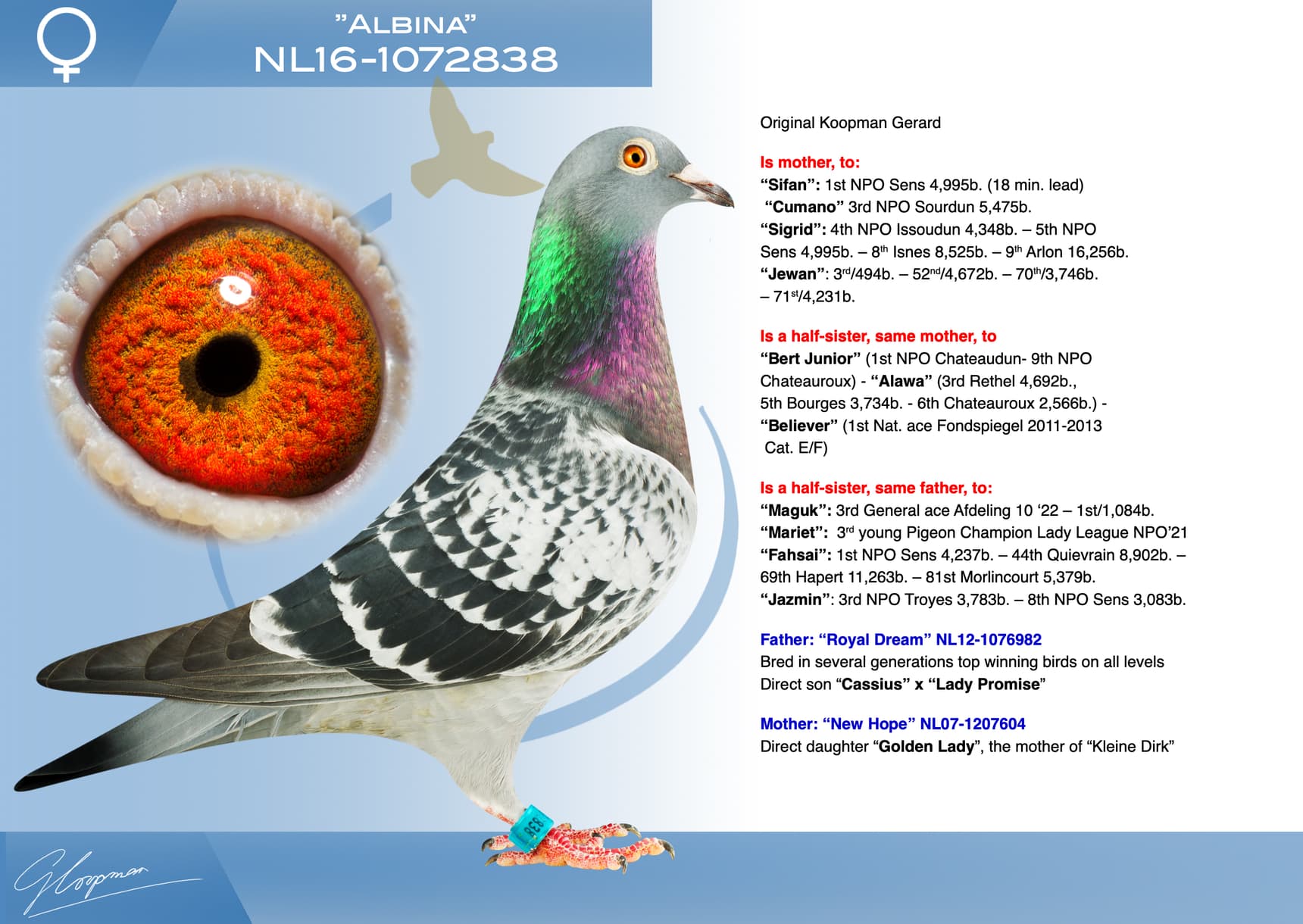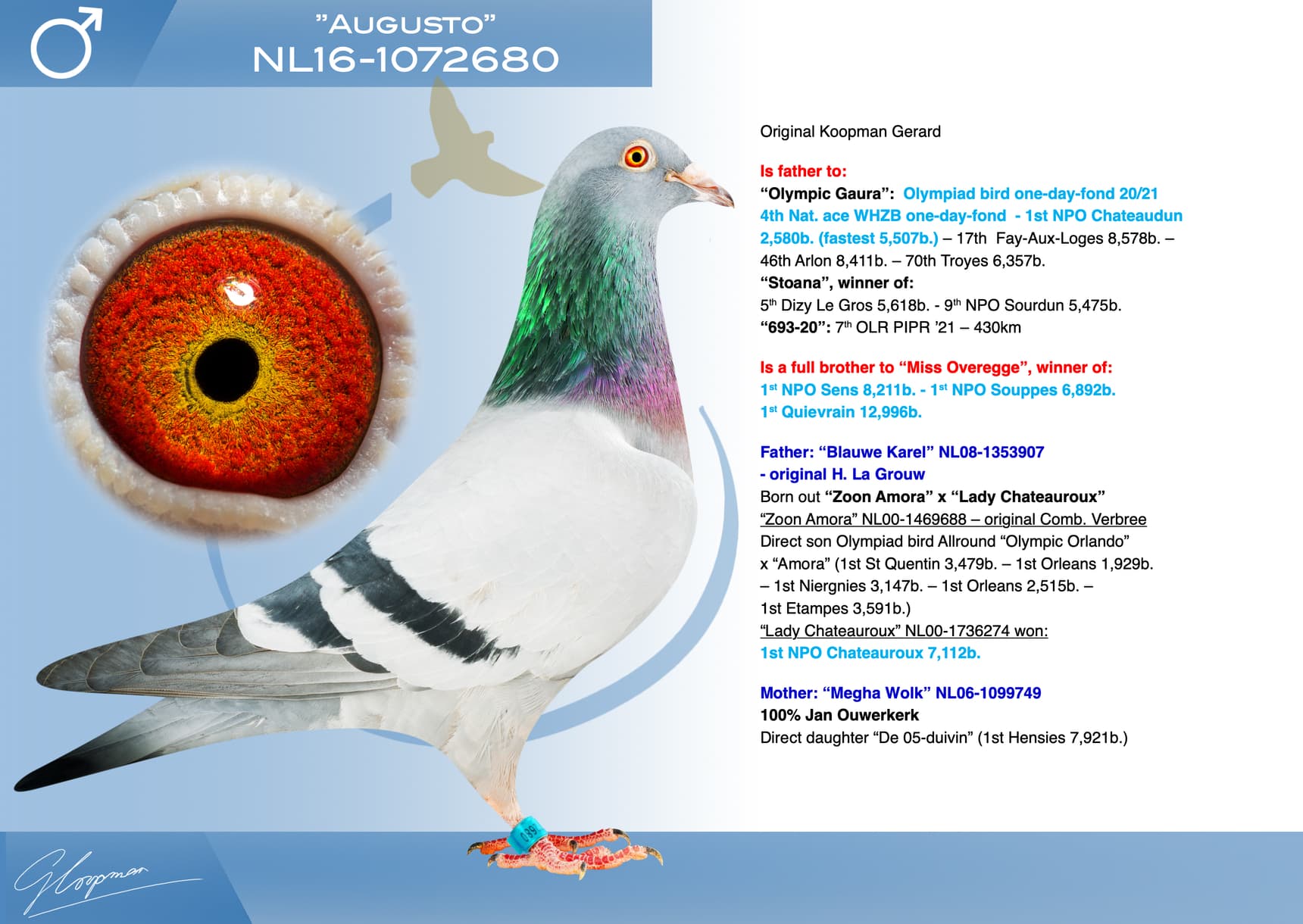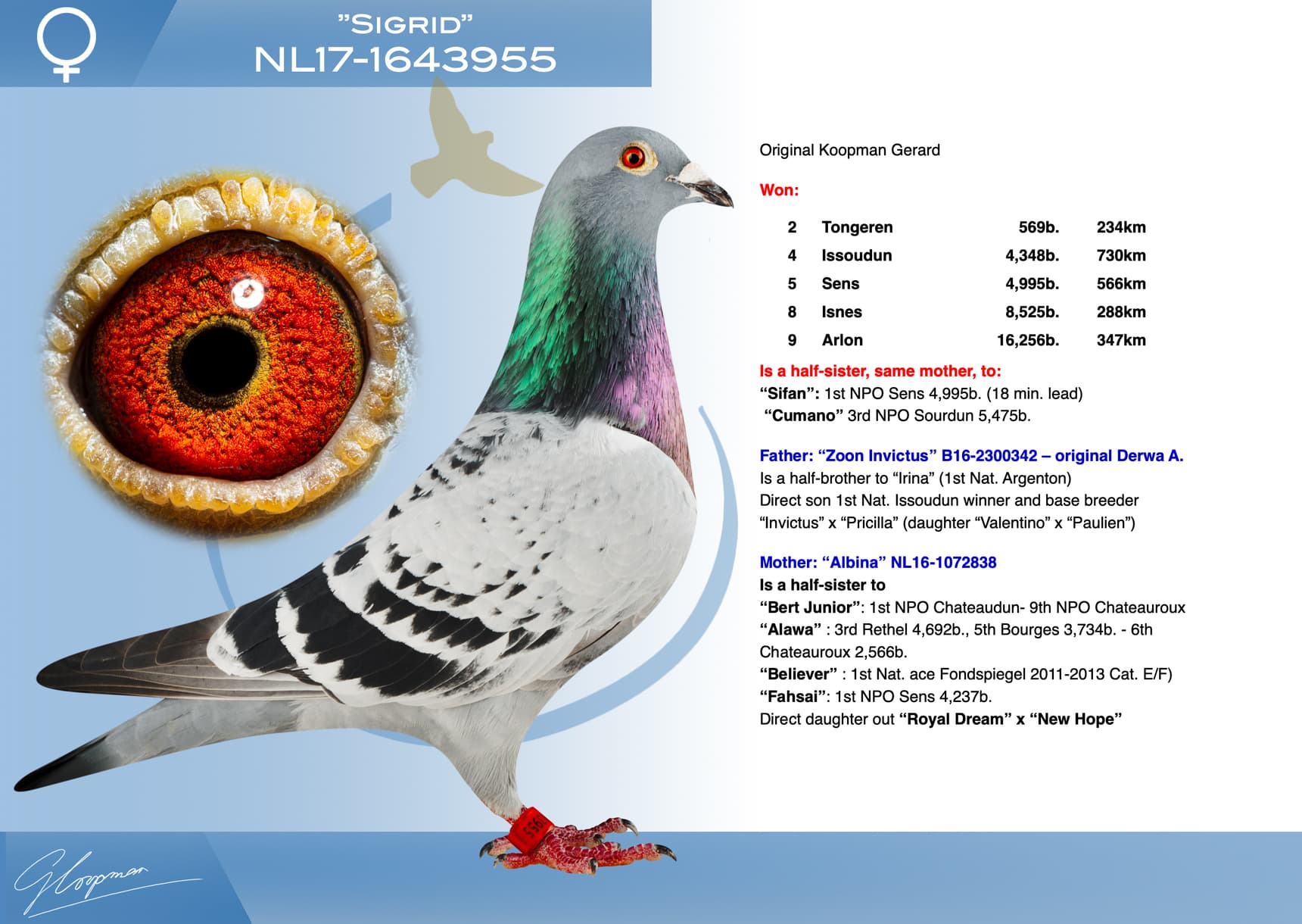 Direct son 1st Nat. Issoudun winner and base breeder “Invictus” x “Pricilla” (daughter “Valentino” x “Paulien”)