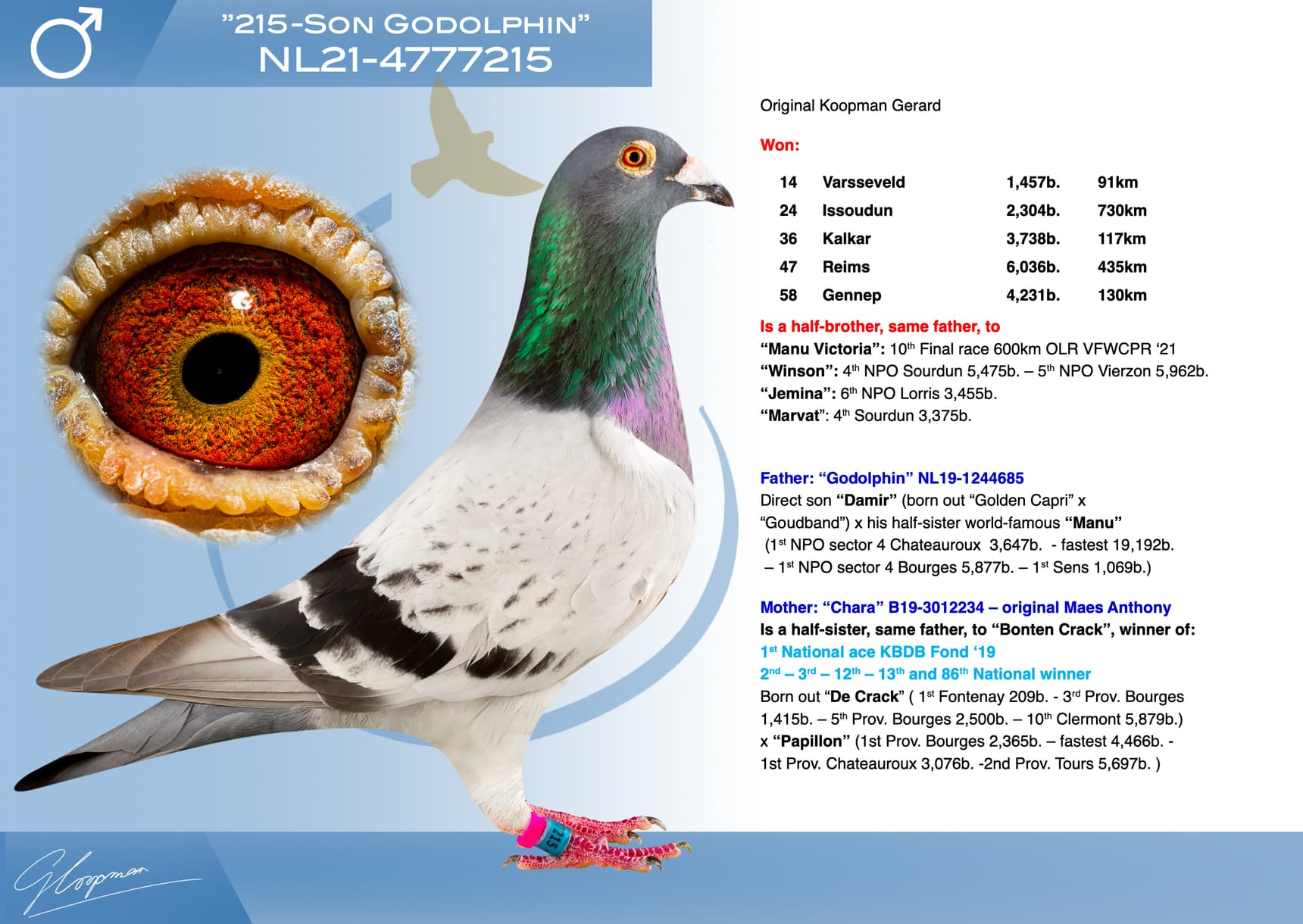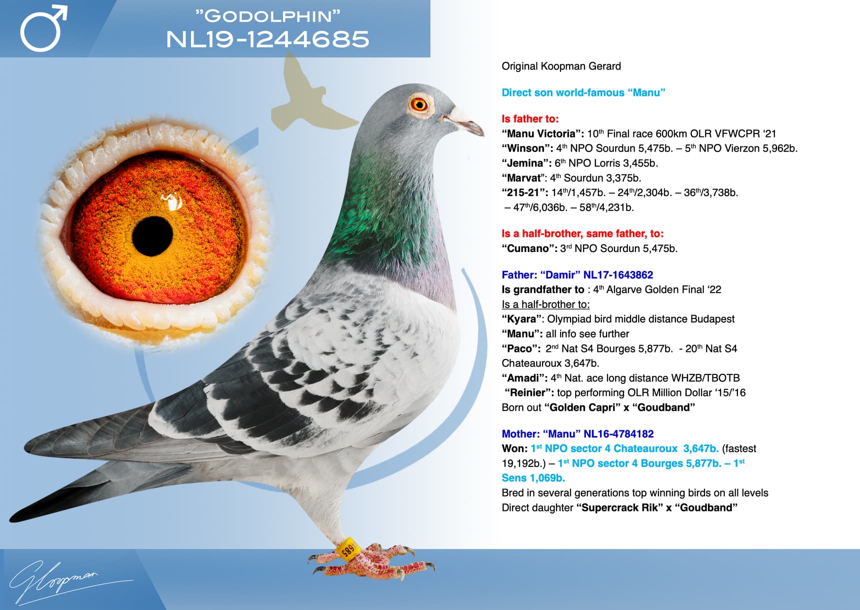 Direct son “Damir” (born out “Golden Capri” x “Goudband”) x his half-sister world-famous “Manu” (1st NPO sector 4 Chateauroux 3,647b. - fastest 19,192b. – 1st NPO sector 4 Bourges 5,877b. – 1st Sens 1,069b.)