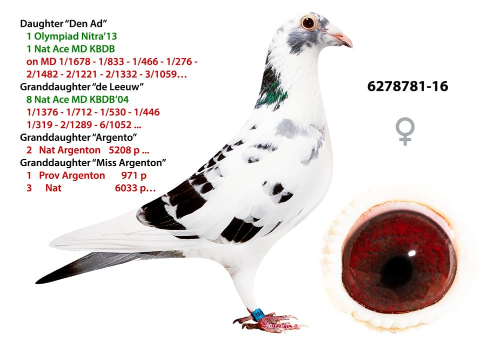 Daughter of the famous racer and breeder "Ad" Wouters : 1 Olympiad Nitra'13 - 1 Nat Ace MD KBDB - 1/1678 - 1/833 - 1/466 - 1/276 - 2/1482 - 2/1221 - 2/1332 - 3/1059 - 4/528...