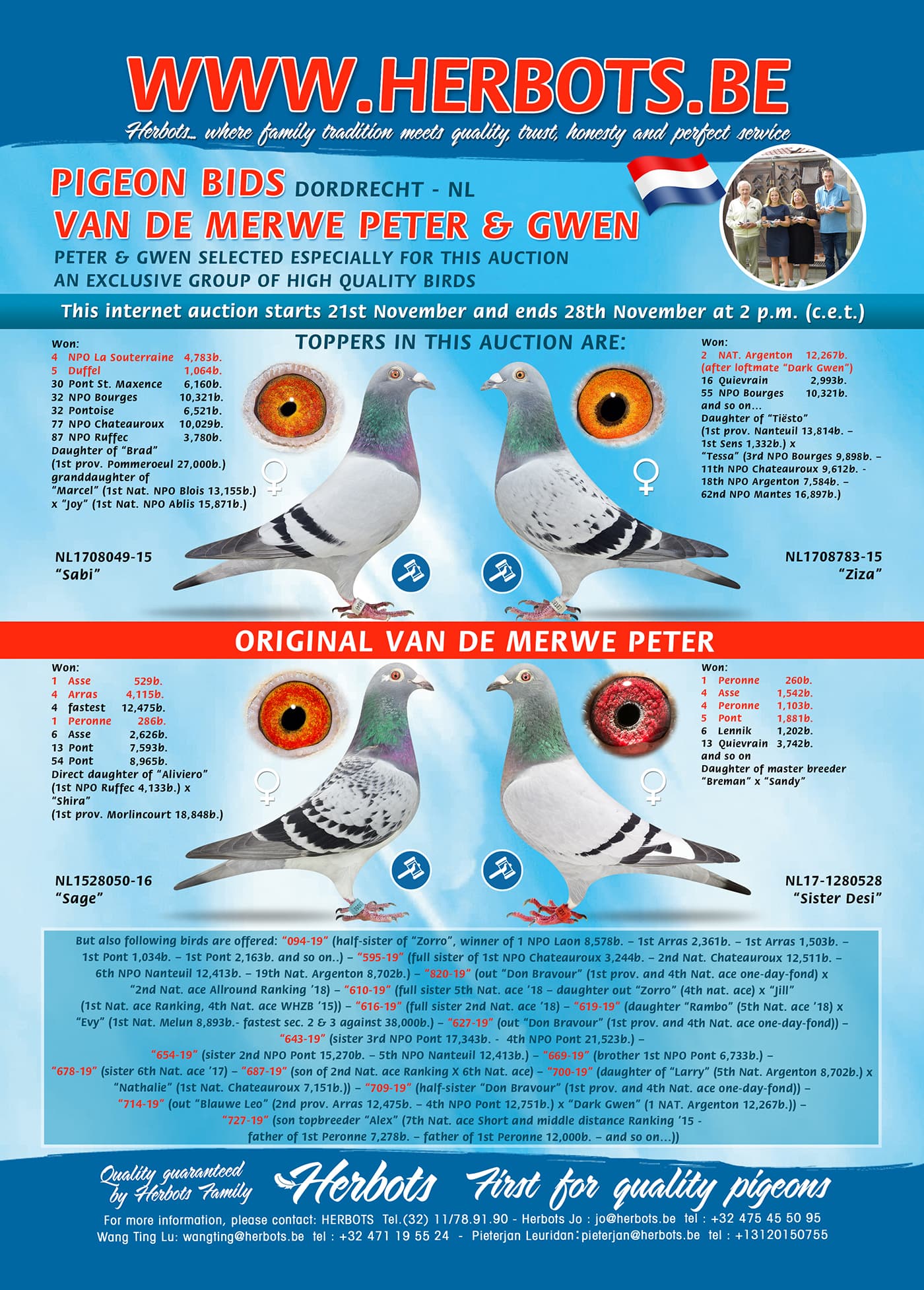 HALF-SISTER OF WINNERS OF: 1st NAT. MELUN sec. 2 – 8,893b. (fastest bird of sec. 2 + sec.3 against 38,000b.) - 1st Peronne 8,420b. (fastest 24,000b.) - 1st Duffel 1,327b. - 3rd Quievrain 2,391b. - 7th Quievrain 2,391b. - 9th Asse 1,277b.